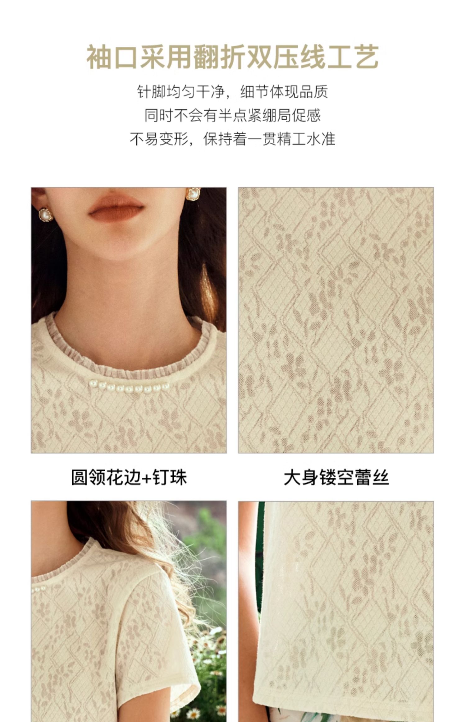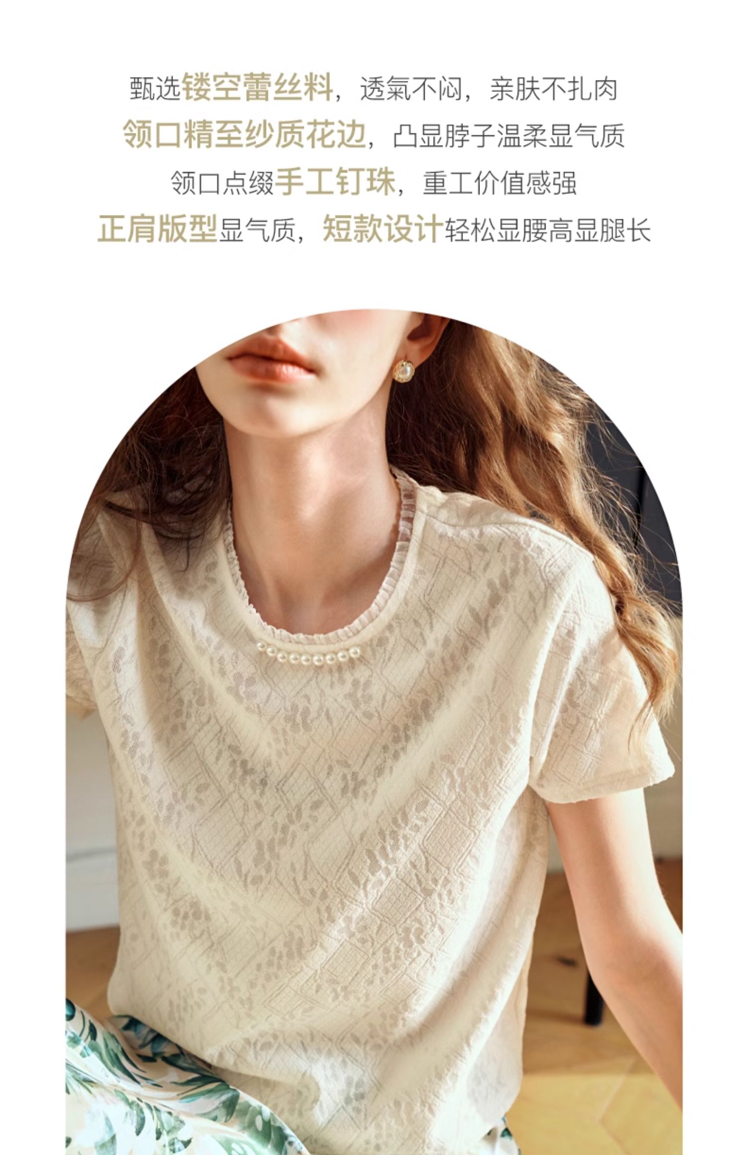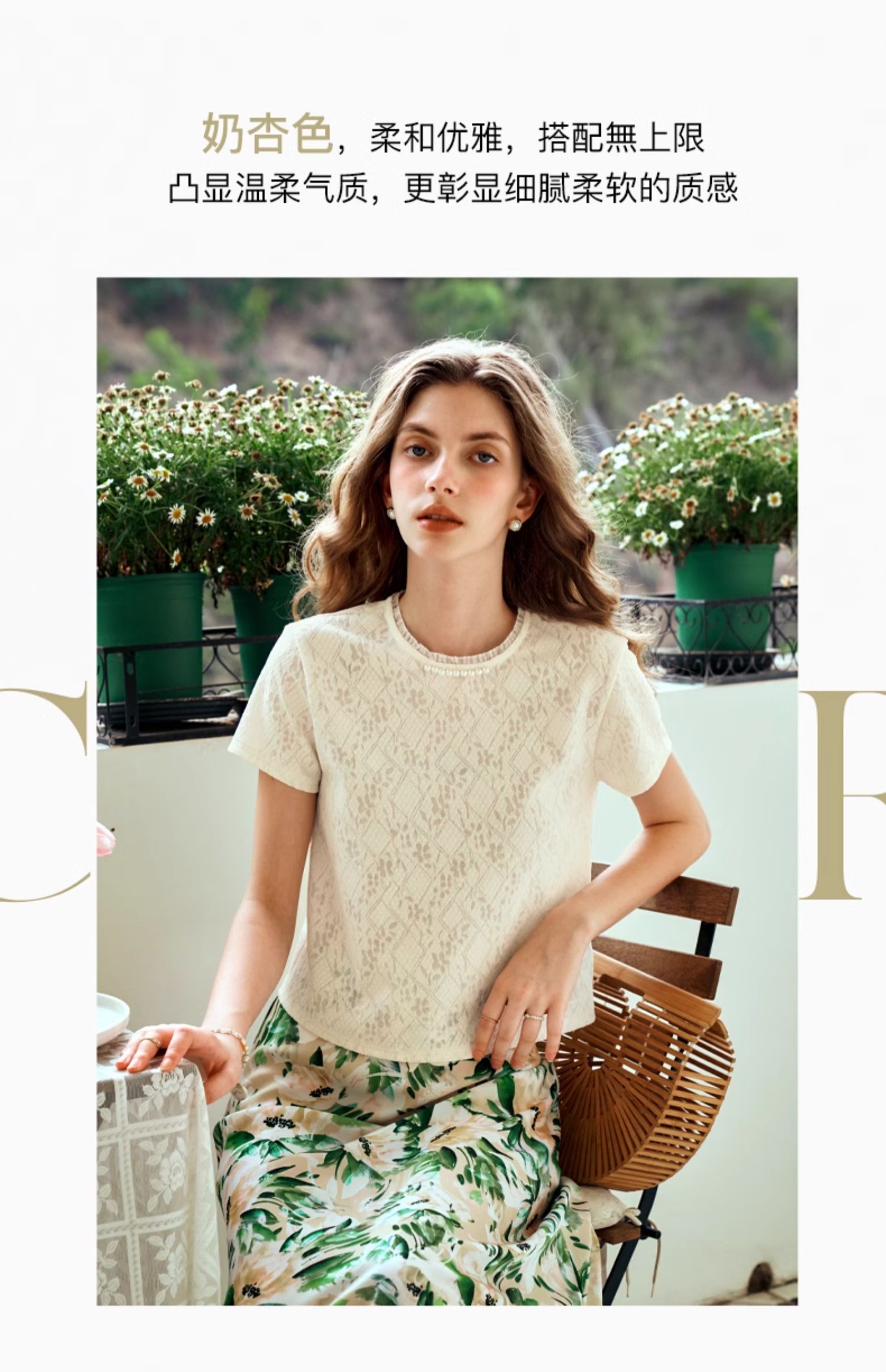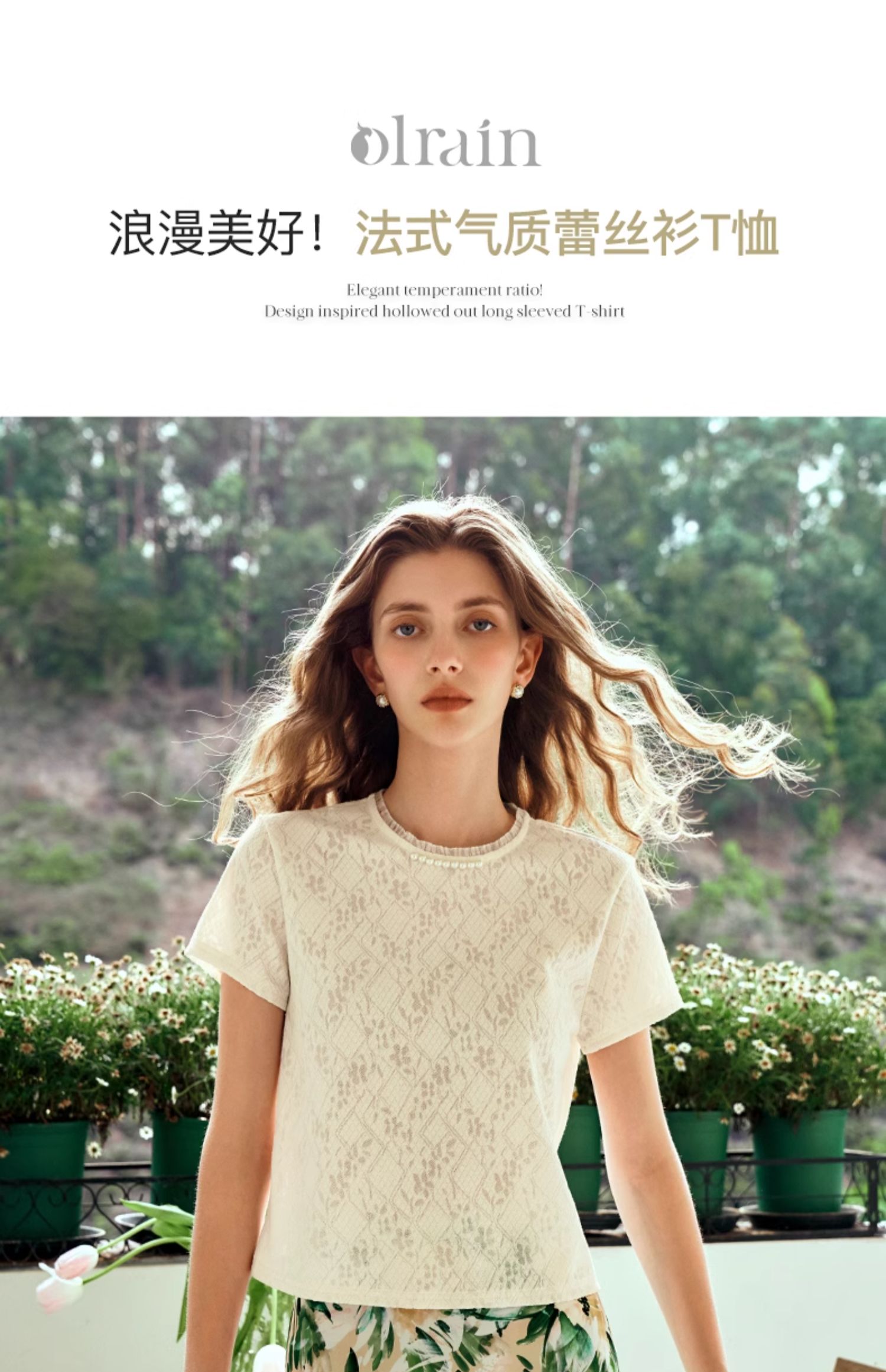 OLrain欧芮儿杏色短袖T恤女夏季法式气质蕾丝衫百搭镂空花边上衣