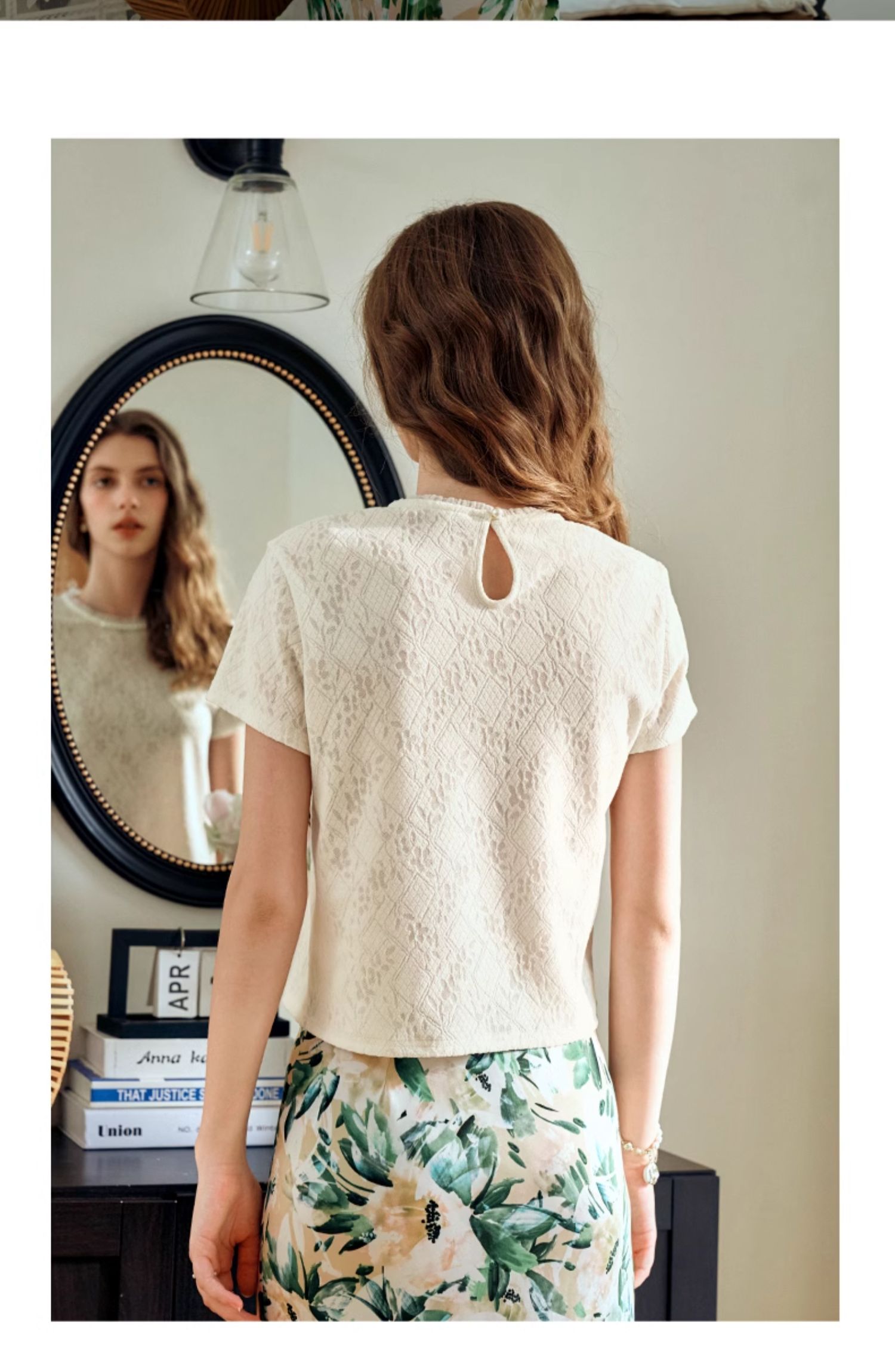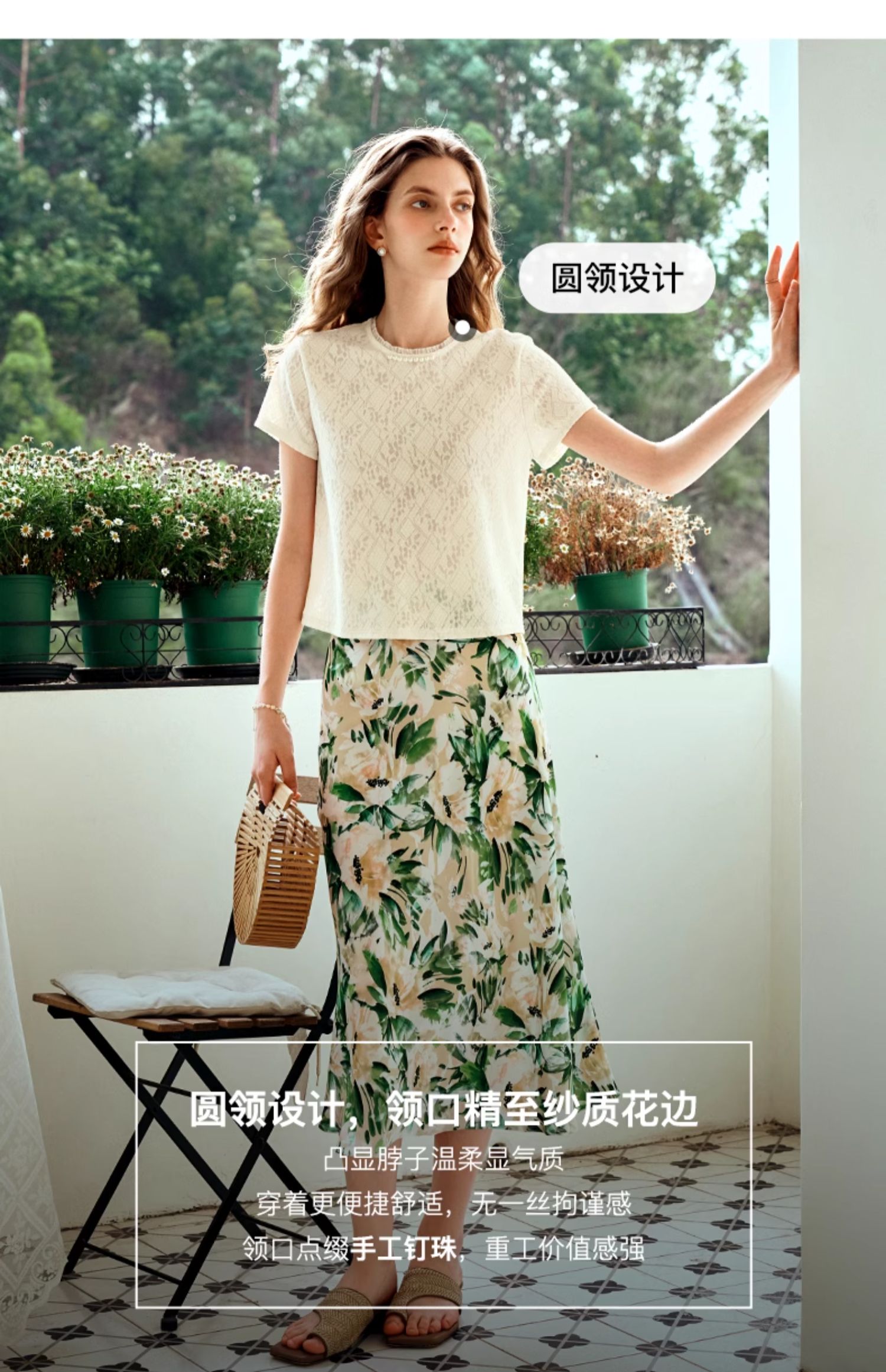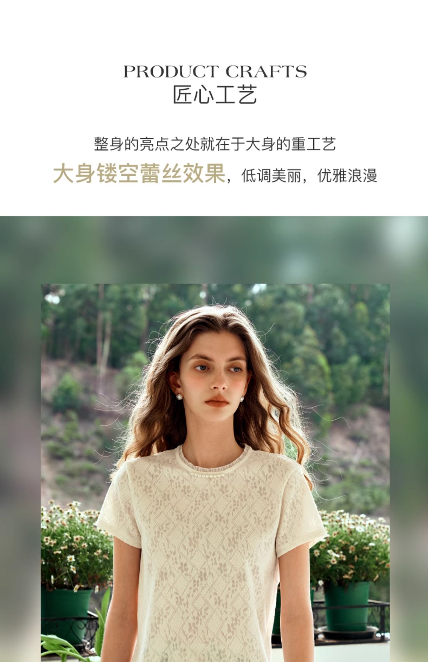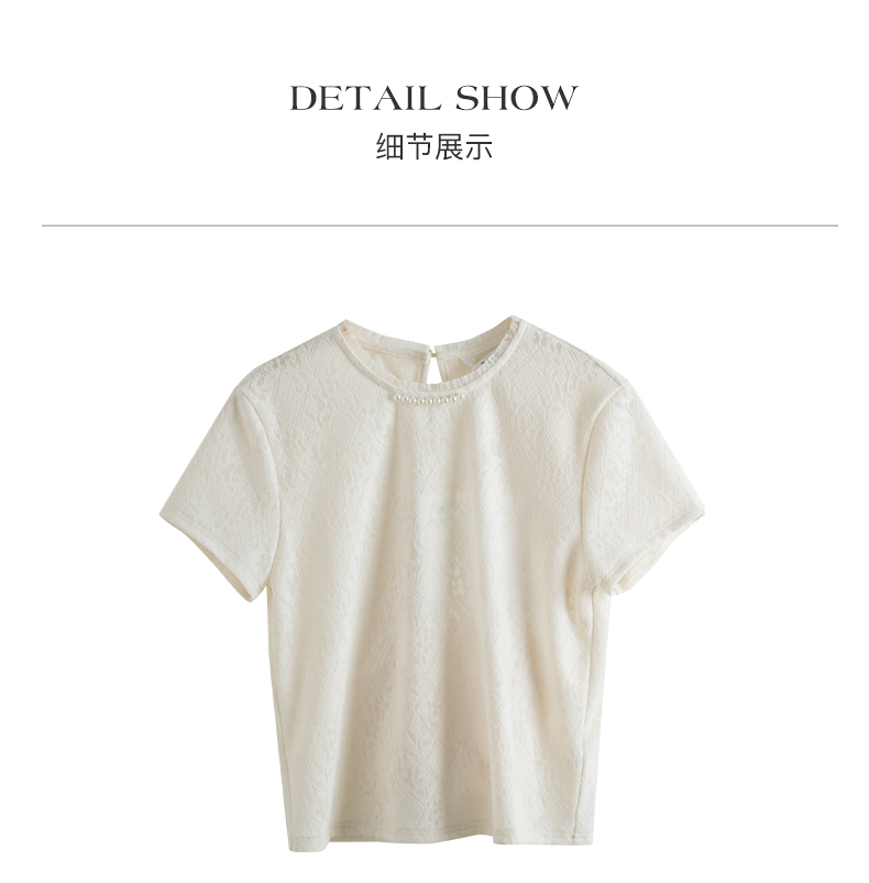 OLrain欧芮儿杏色短袖T恤女夏季法式气质蕾丝衫百搭镂空花边上衣