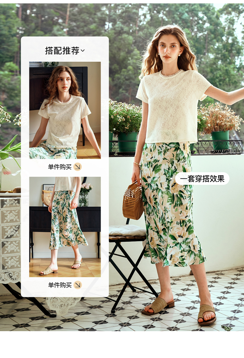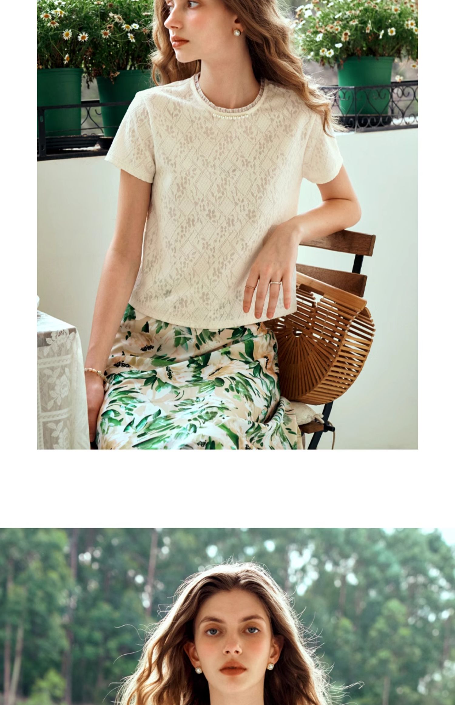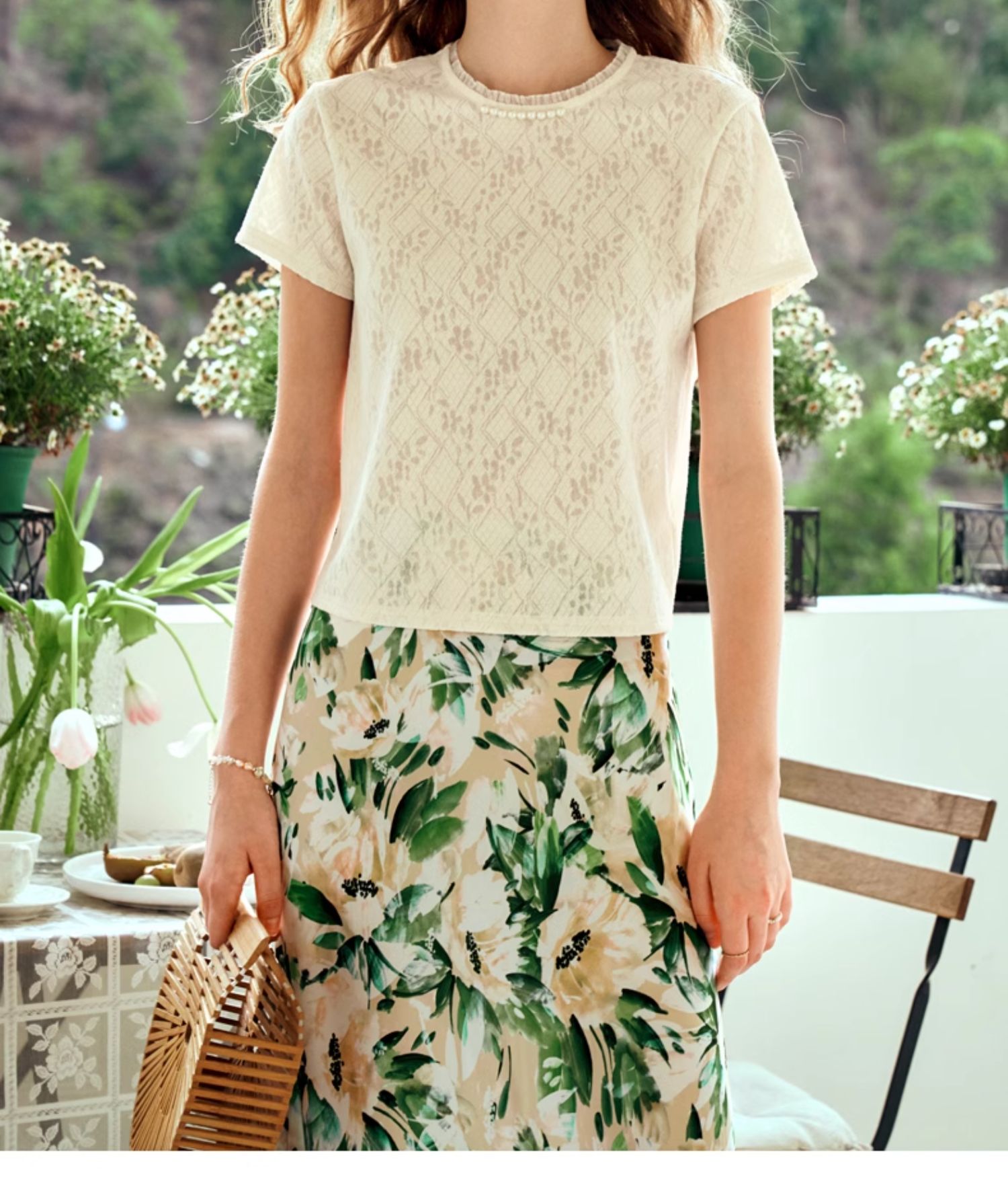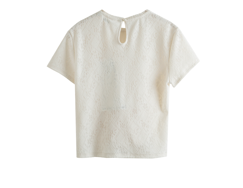 OLrain欧芮儿杏色短袖T恤女夏季法式气质蕾丝衫百搭镂空花边上衣