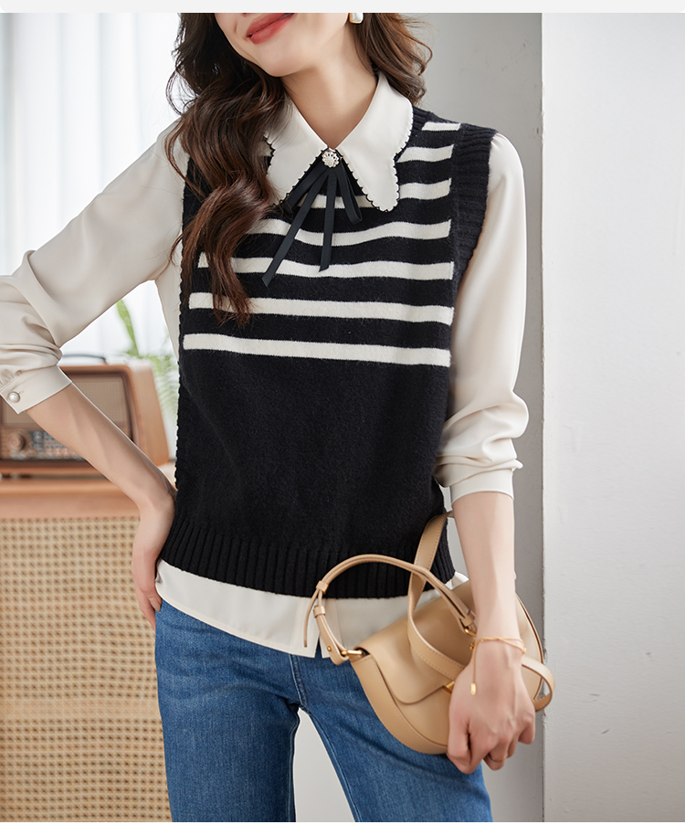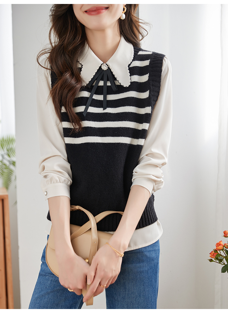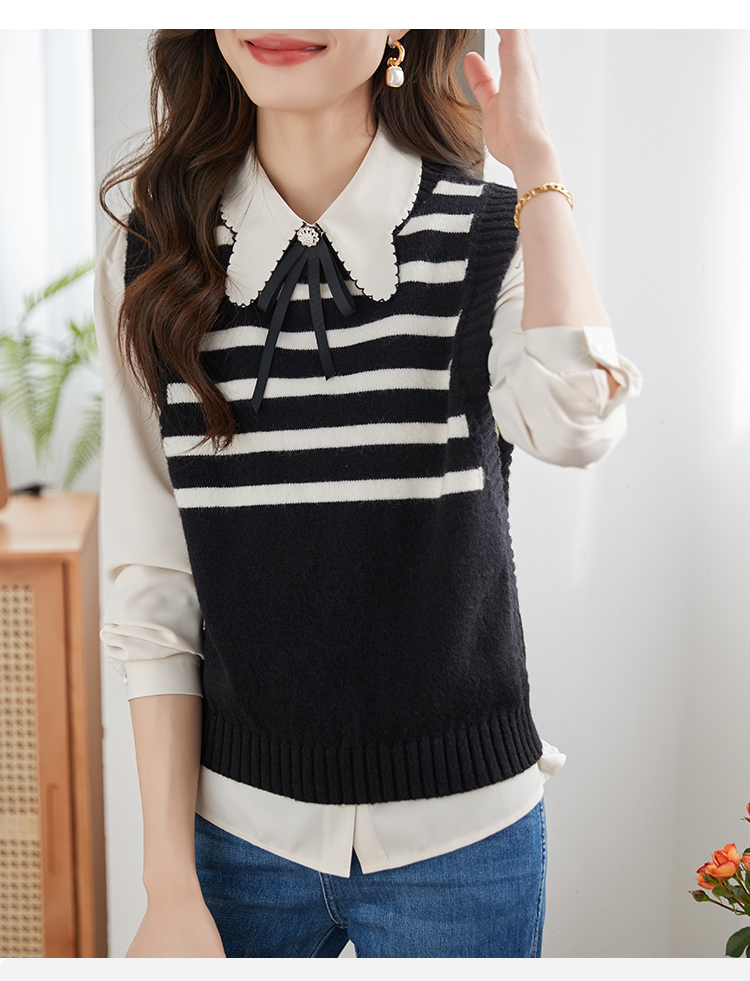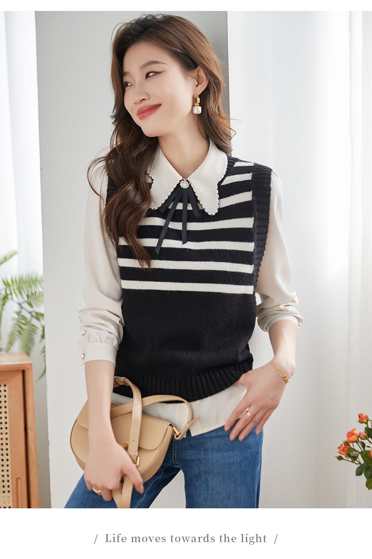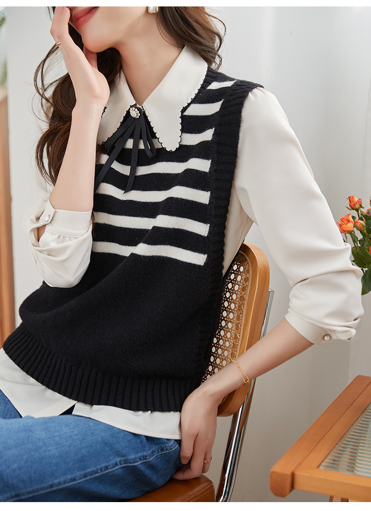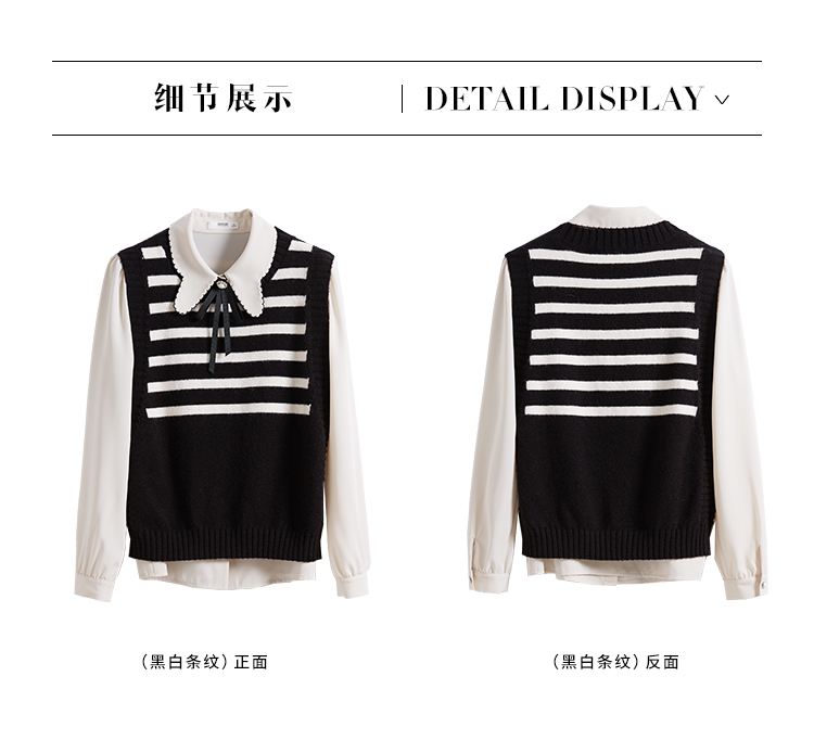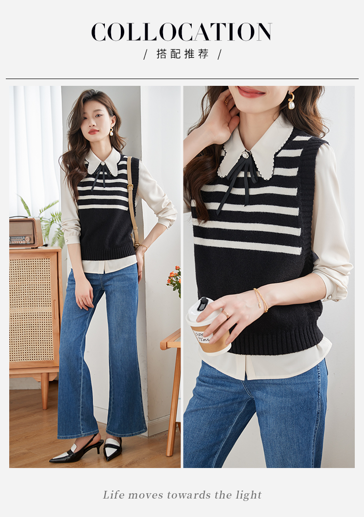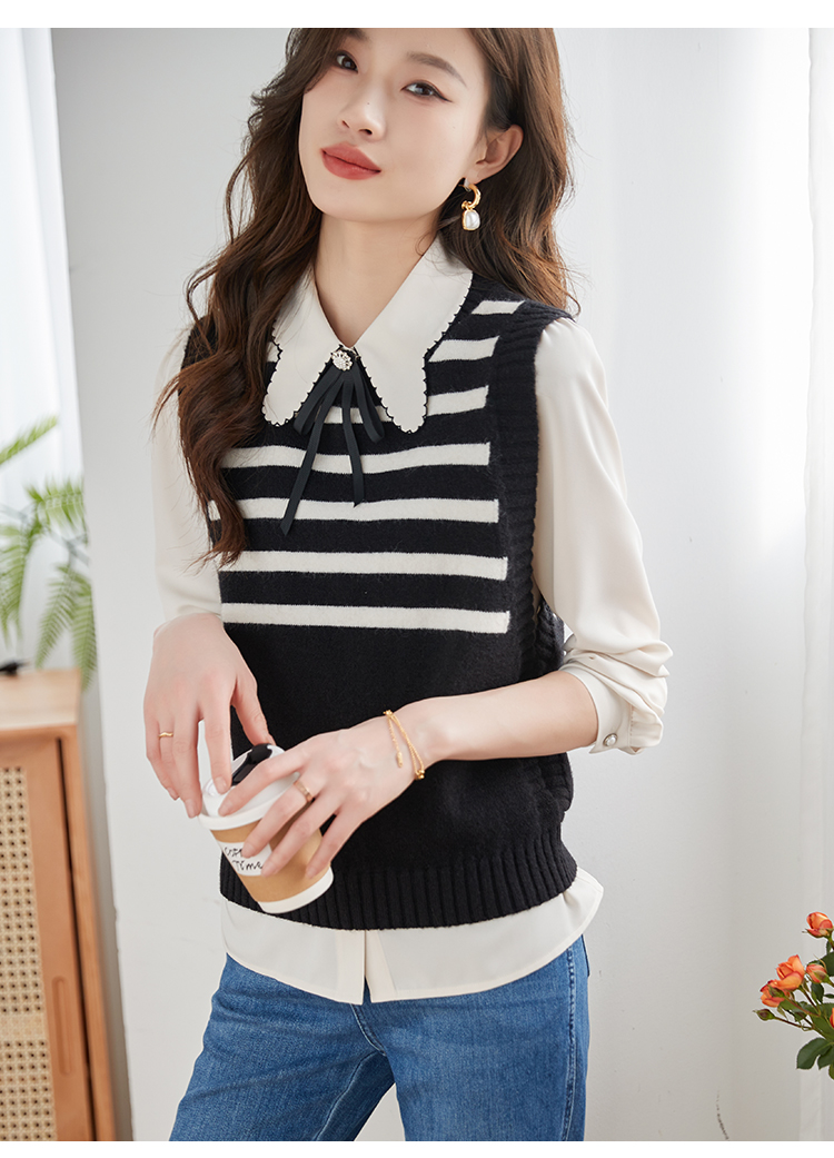 【专属特价】熙世界条纹针织衫马甲套装女2025春装新款无袖背心上衣衬衫两件套
