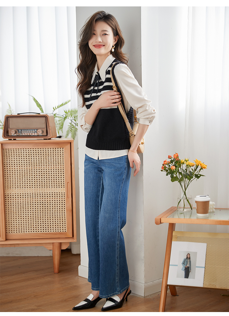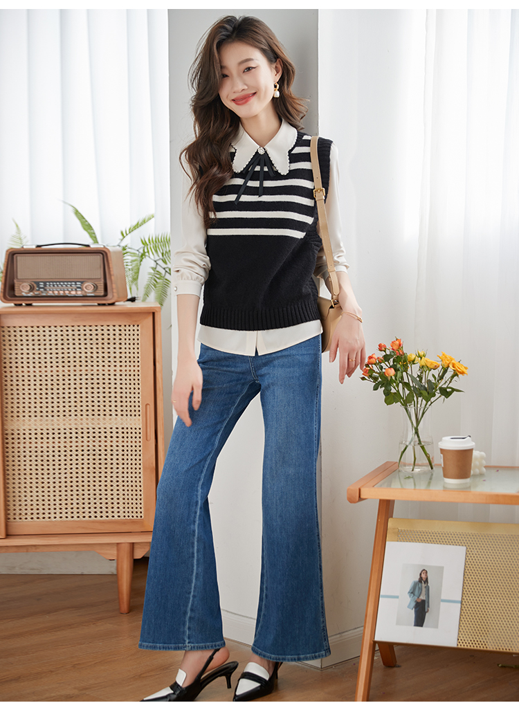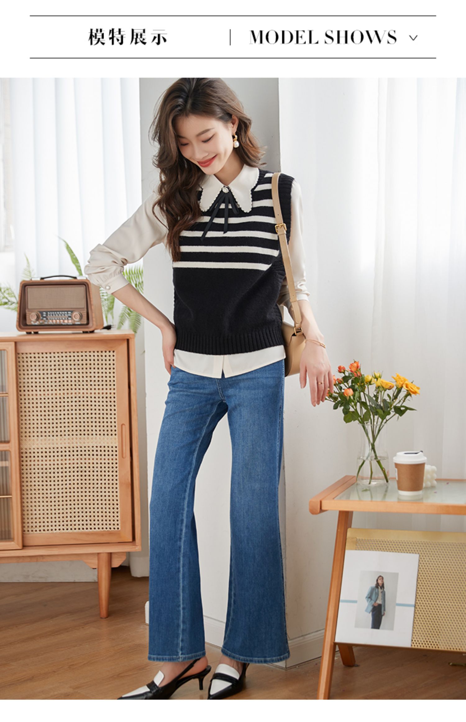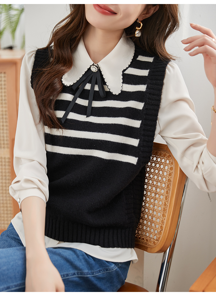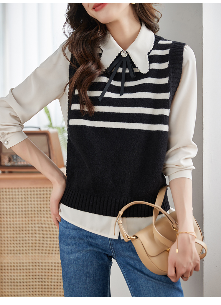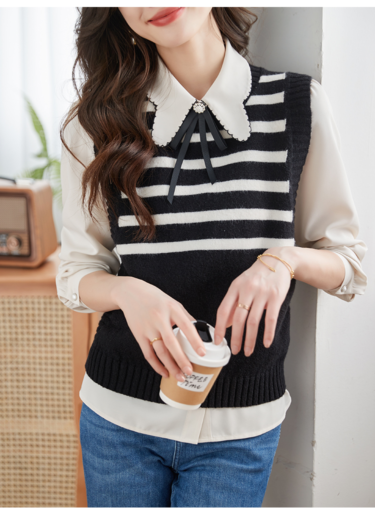 【专属特价】熙世界条纹针织衫马甲套装女2025春装新款无袖背心上衣衬衫两件套