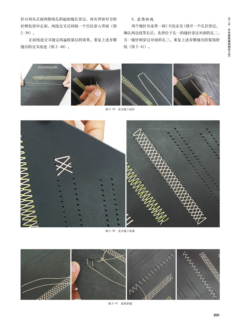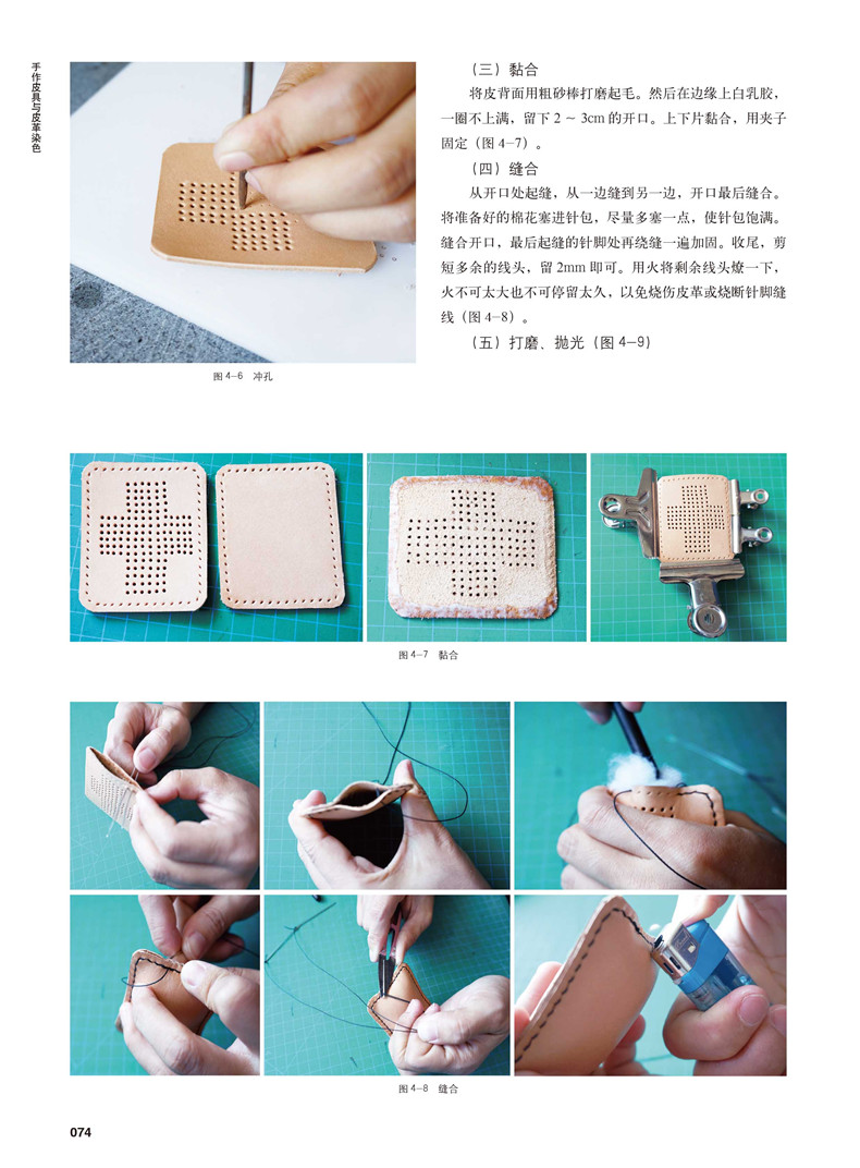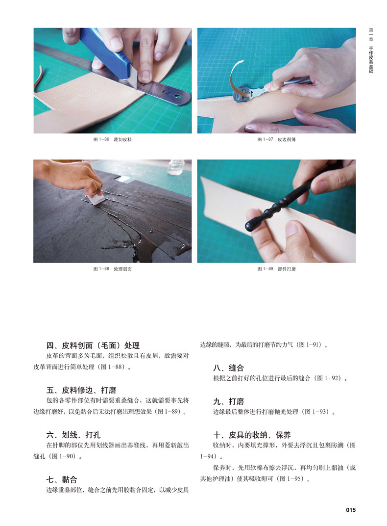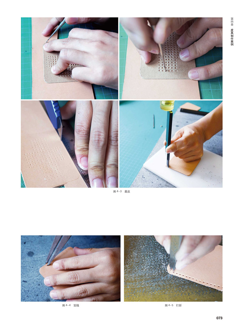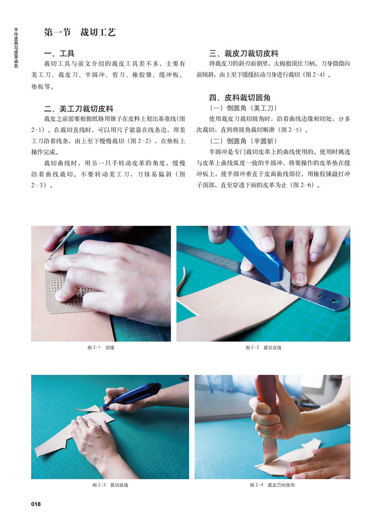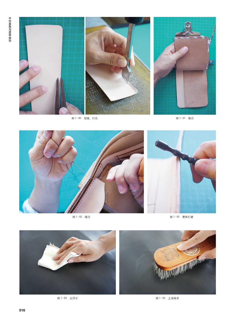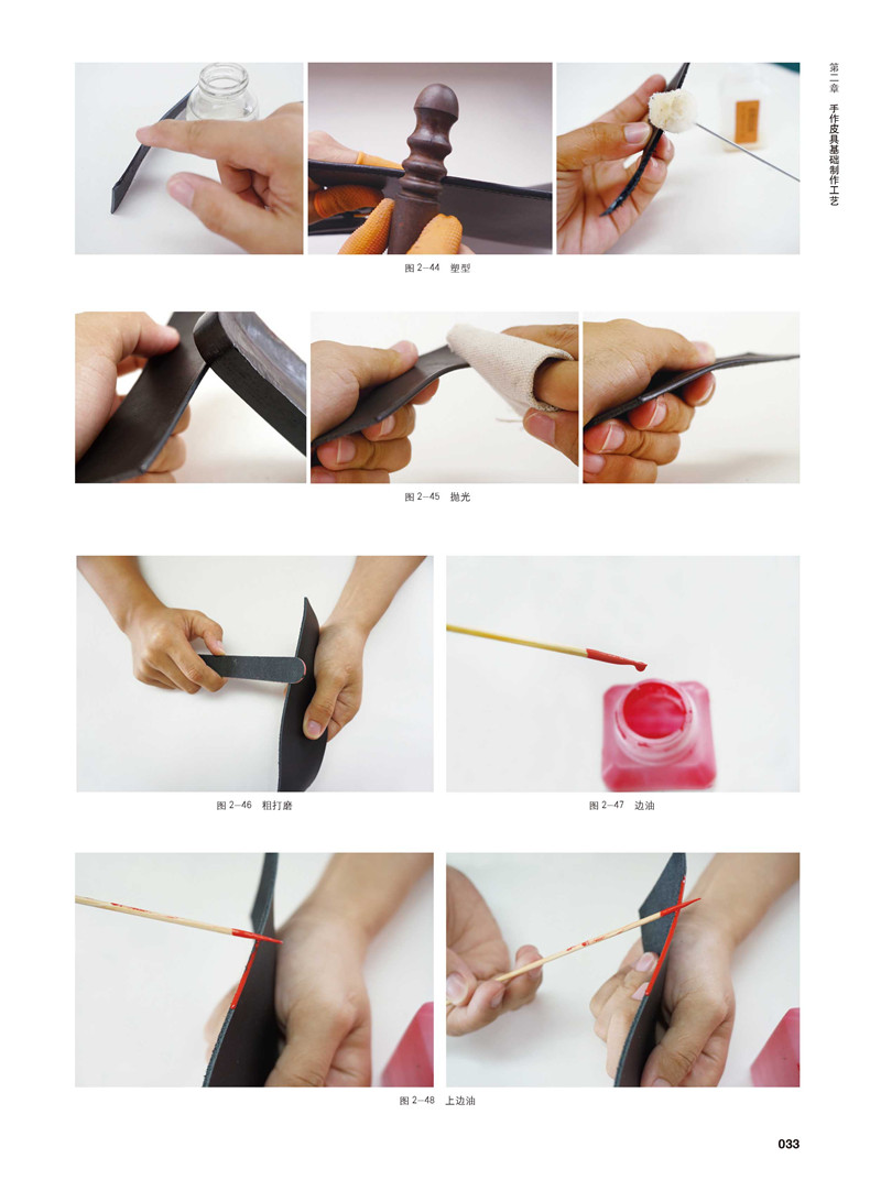 《手作皮具与皮革染色》从手作皮具最基础的的材料与工具说起,介绍材料的特性以及工具的使用方法;手作皮具的基础工艺(裁剪工艺、皮革创面处理工艺、缝制工艺、打磨及封边处理工艺、粘合工艺);手工皮革染色的色彩原理与基本方法,同时,介绍皮革特色染色工艺——皮革扎染、蜡染、糊染的工艺和方法;另外,通过针线包、卡包、钱包、手拿包、医生包、手拎包等皮具案例,从易到难、循序渐进的介绍皮具的制作方法与步骤。