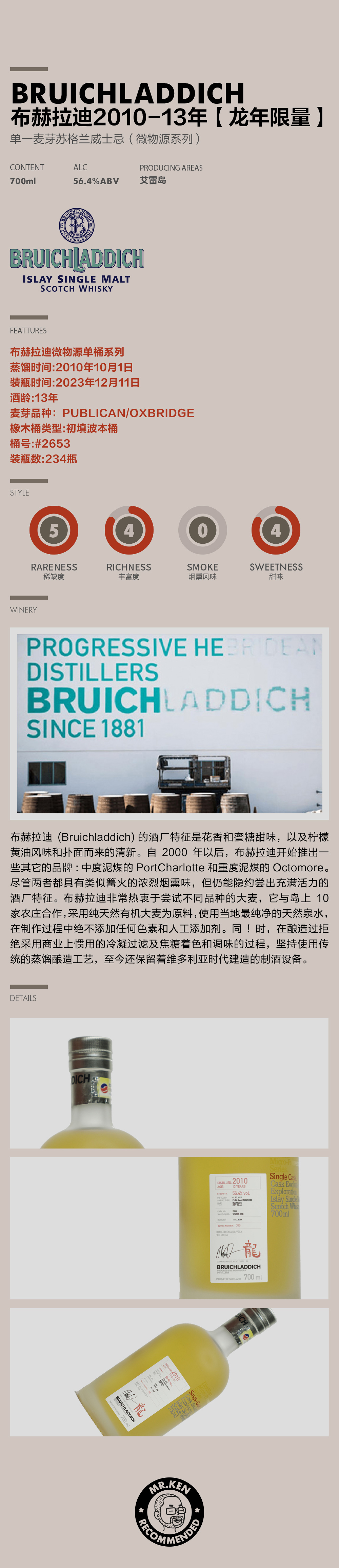 布赫拉迪(Bruichladdich)2010-13年【龙年限量】单桶单一麦芽苏格兰威士忌(微物源系列)
