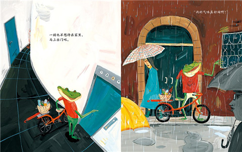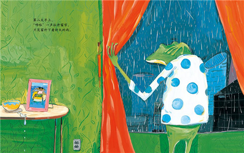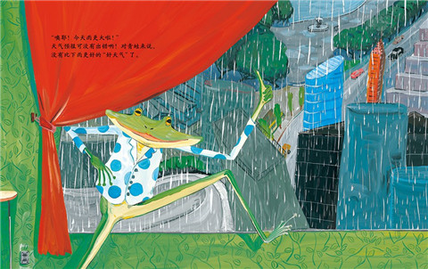 下雨天才是青蛙眼里的好天气。天气预报第二天雨更大,青蛙决定出门放松下,为此还特制了一把伞。第二天青蛙淋着雨骑车去公园,路上还买了汉堡。在公园泡在雨水中的长凳上,青蛙享用了美味,并在雨中美美地睡了一觉。在雨停之际,青蛙醒来,赶紧往家赶,并撑开了“雨伞”。