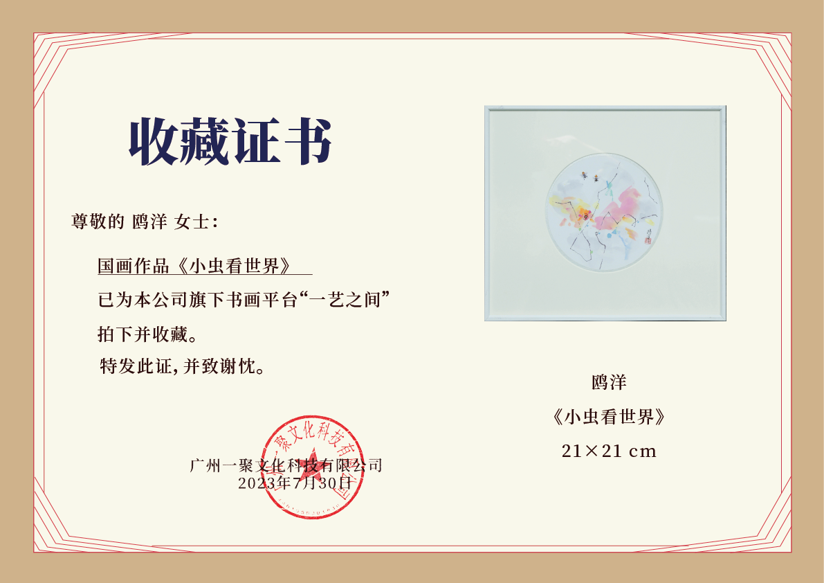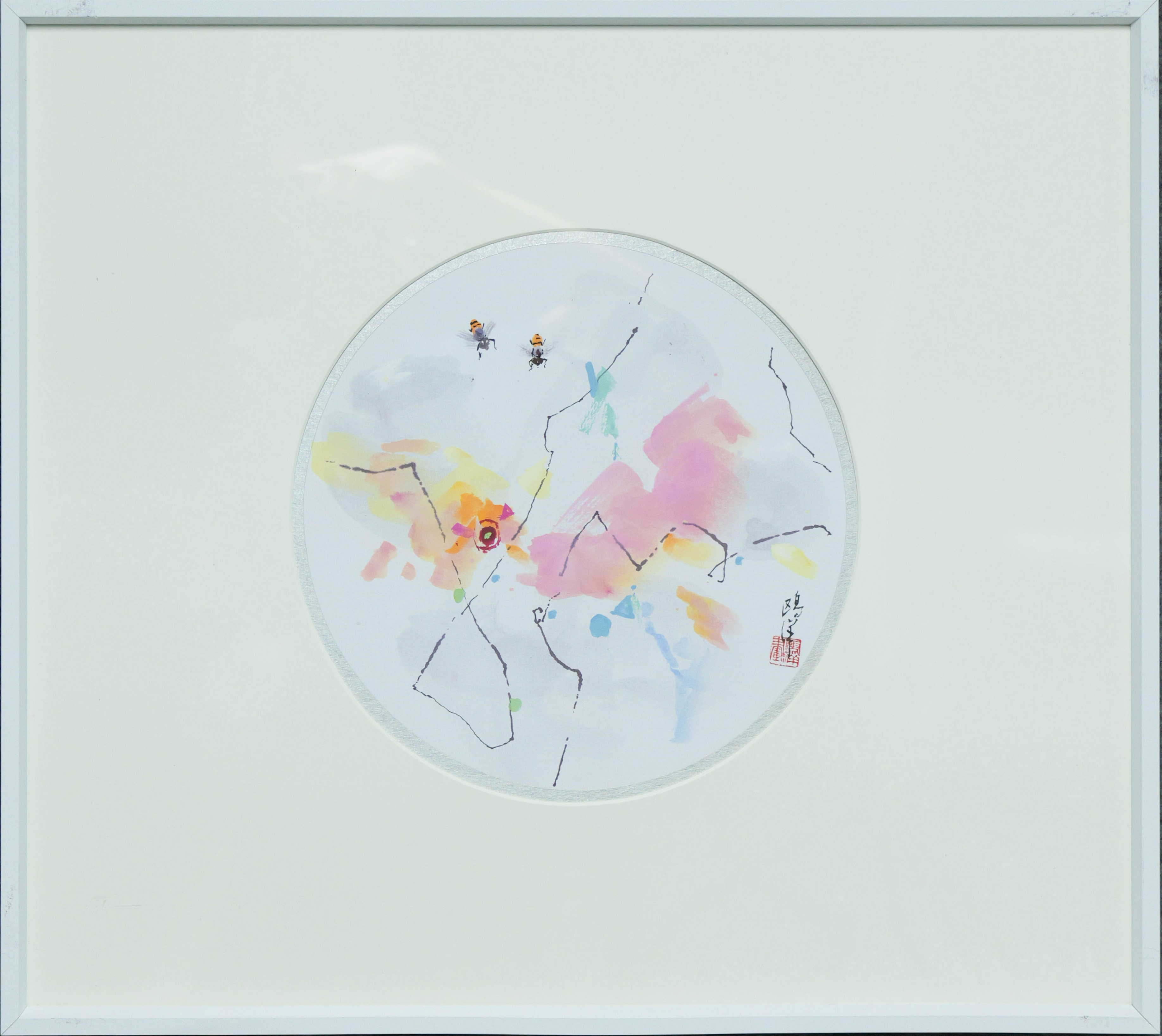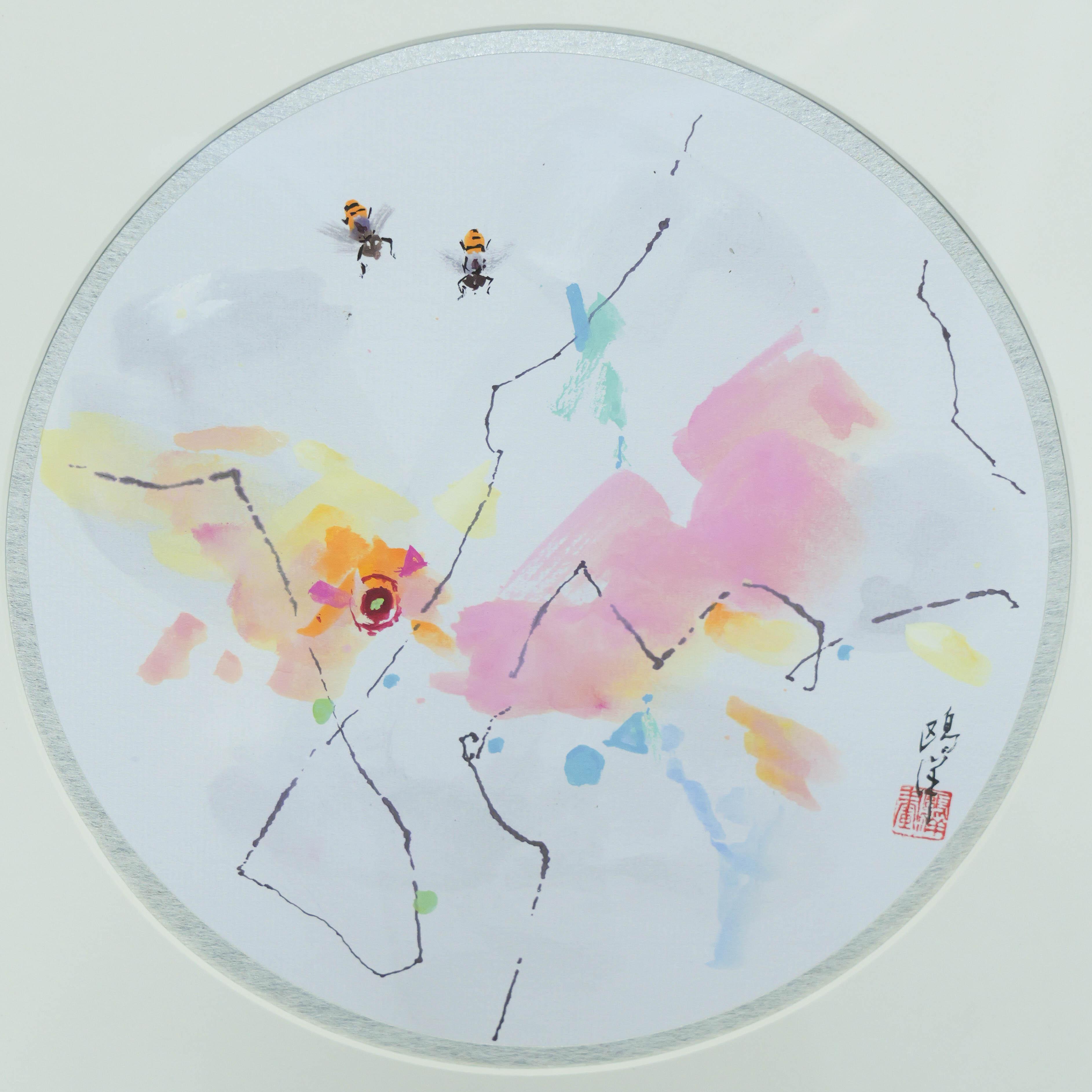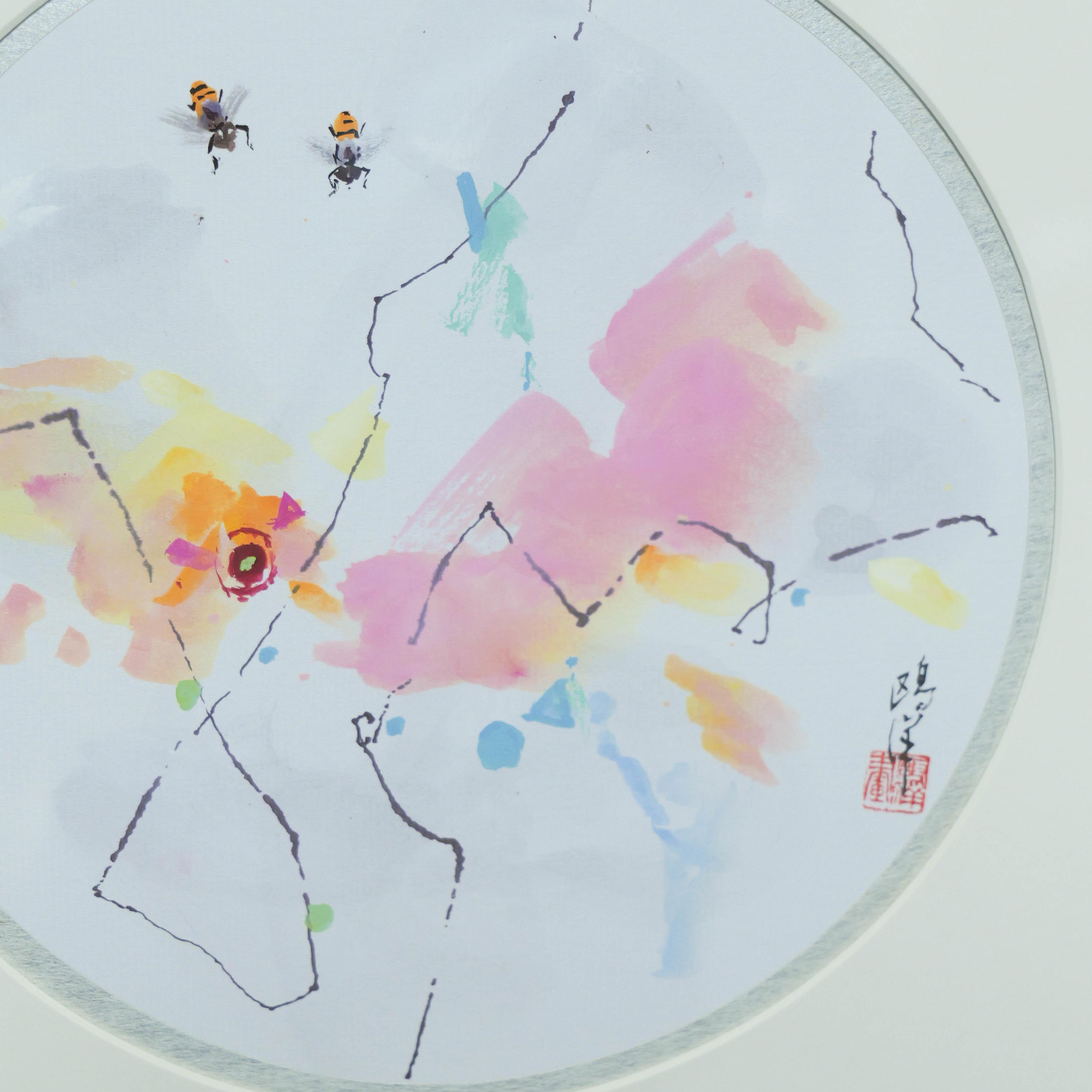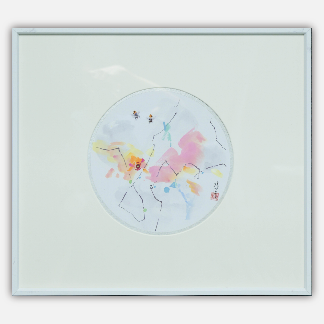 鸥洋《小虫看世界之一》国画原作21CM*21CM 手绘纸本圆形作品含框【GH0530】