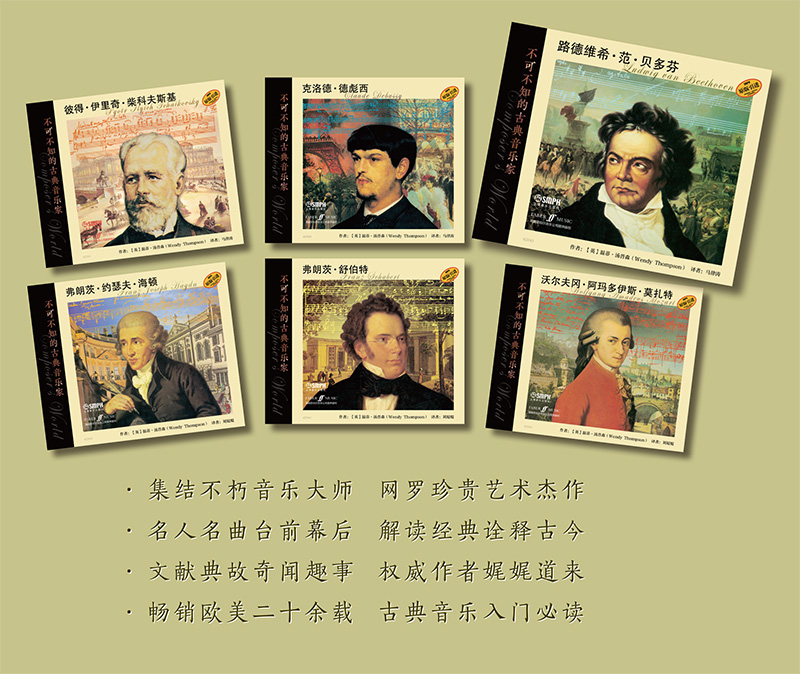本系列丛书包含六本音乐读物,对贝多芬、莫扎特、海顿、舒伯特、柴科夫斯基和德彪西的生平及音乐作品均进行了深入浅出的讲解。图书配有大量精美图片,中文版出版时将请茅为蕙为书中呈现的所有乐谱录制配套演奏音频。