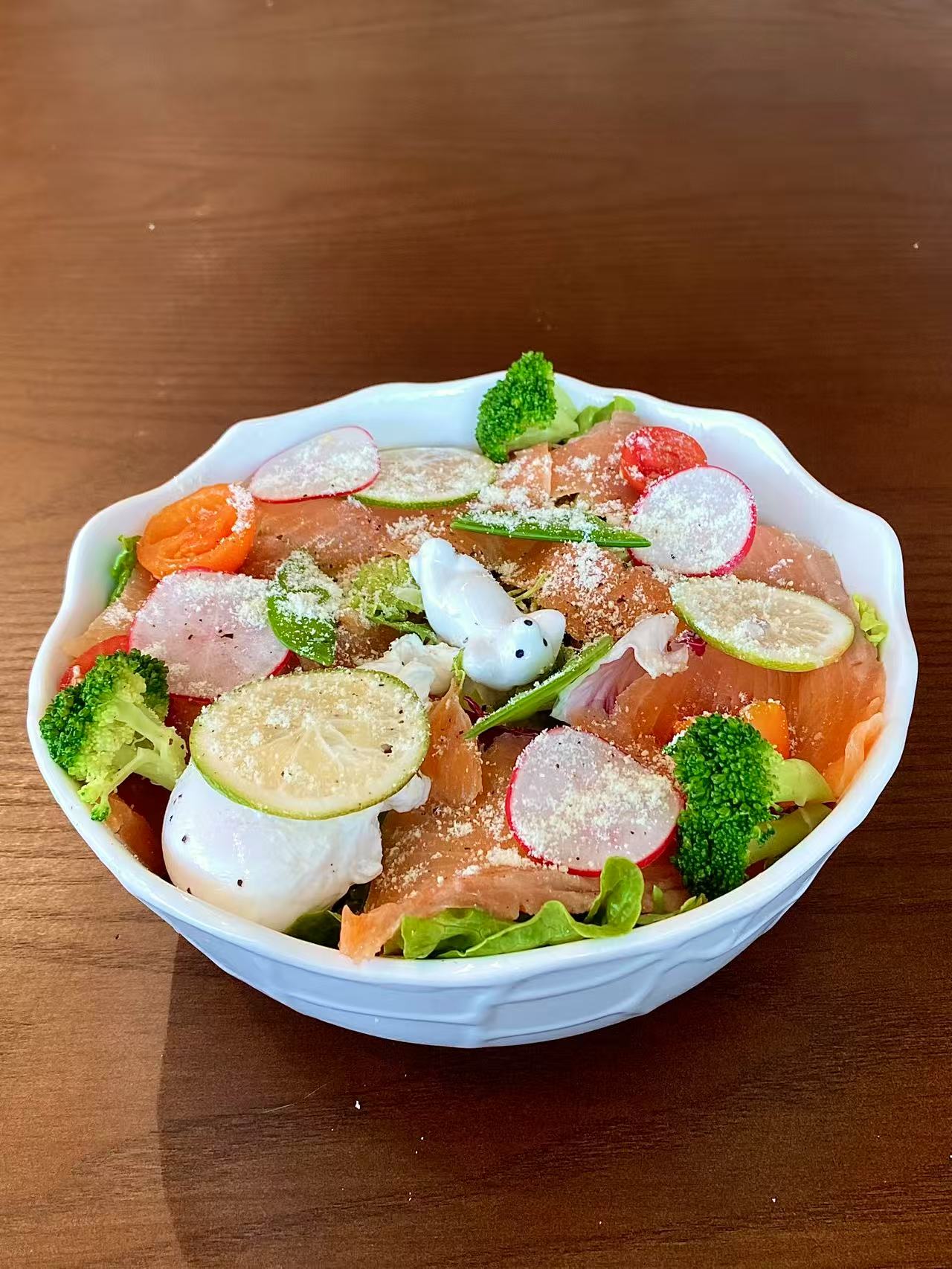 (烟熏三文鱼/水波蛋/混合蔬菜/自制沙拉汁)