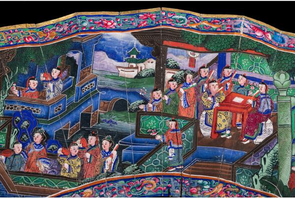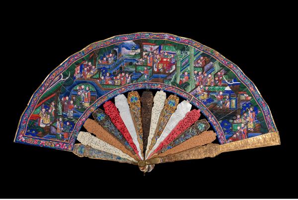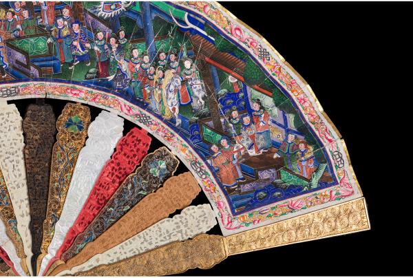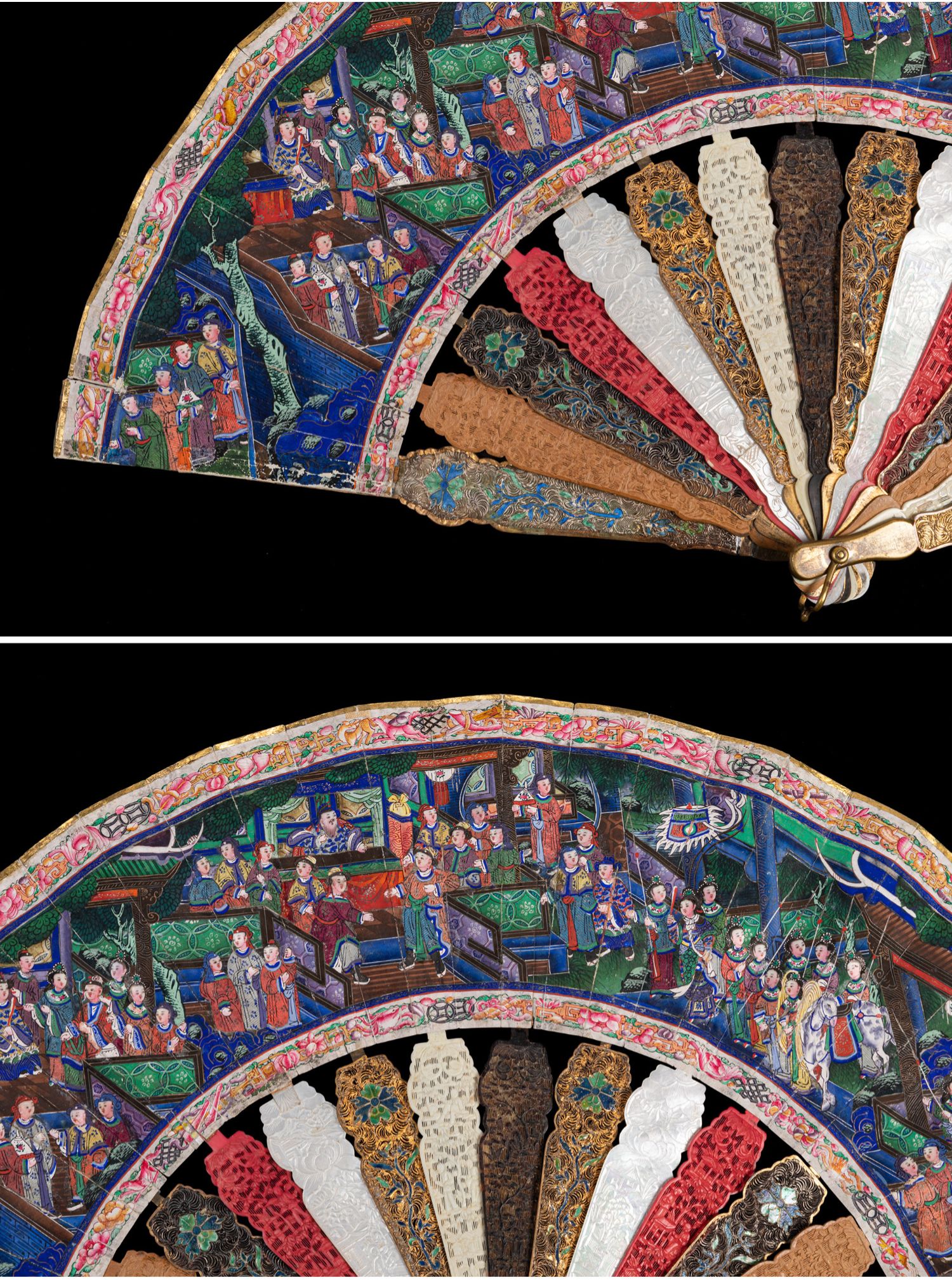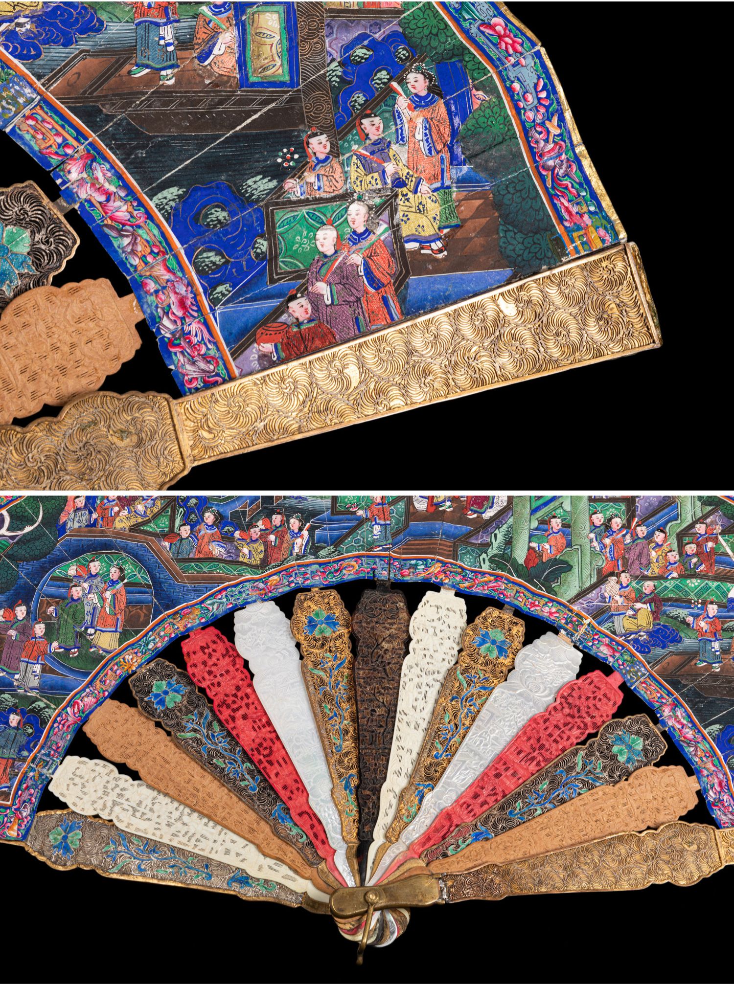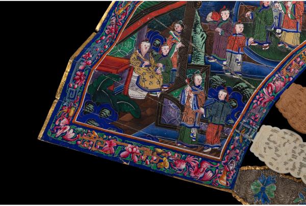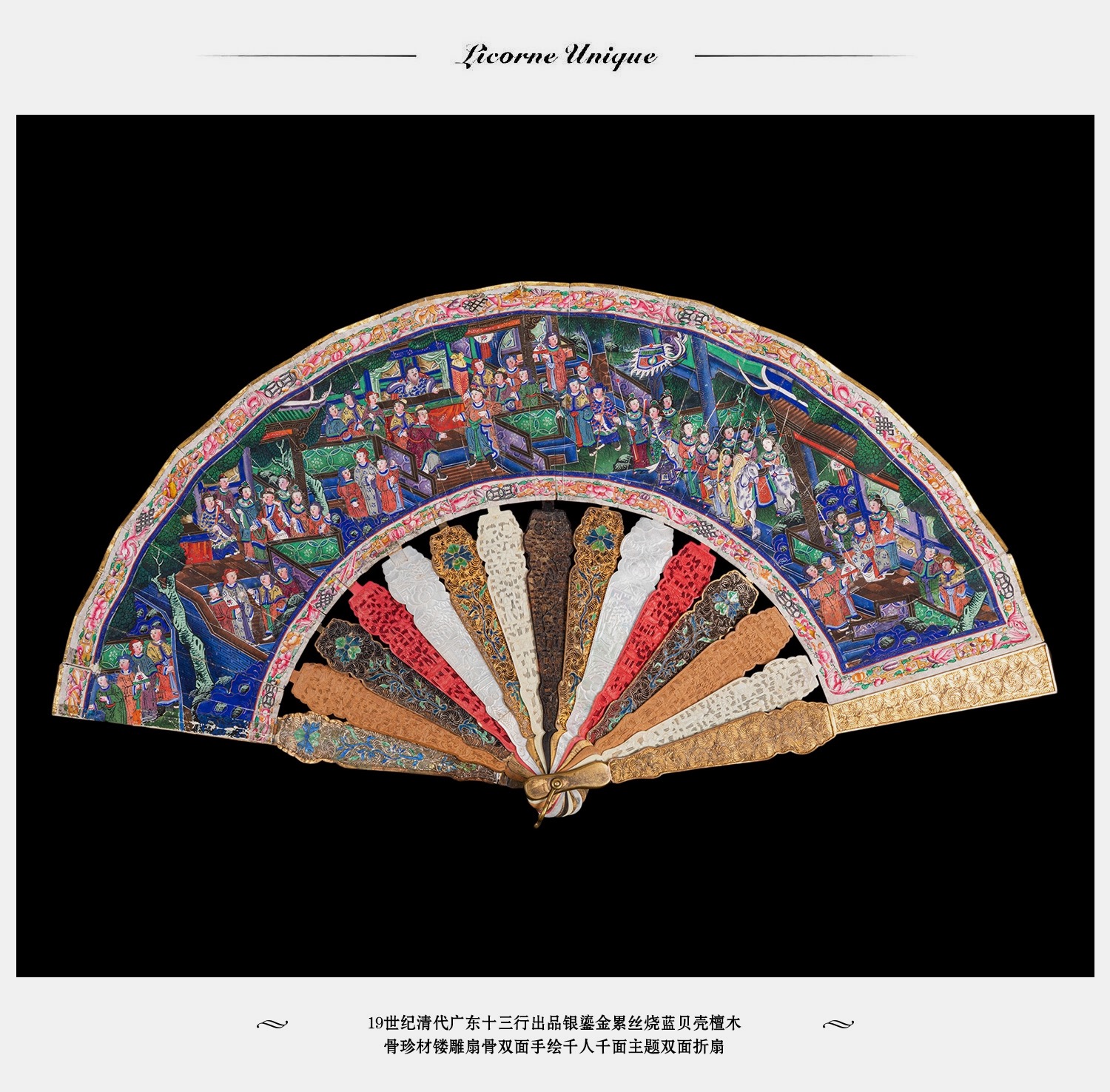 独角鹿西洋古董广东十三行银鎏金累丝烧蓝贝壳檀木双面手绘折扇