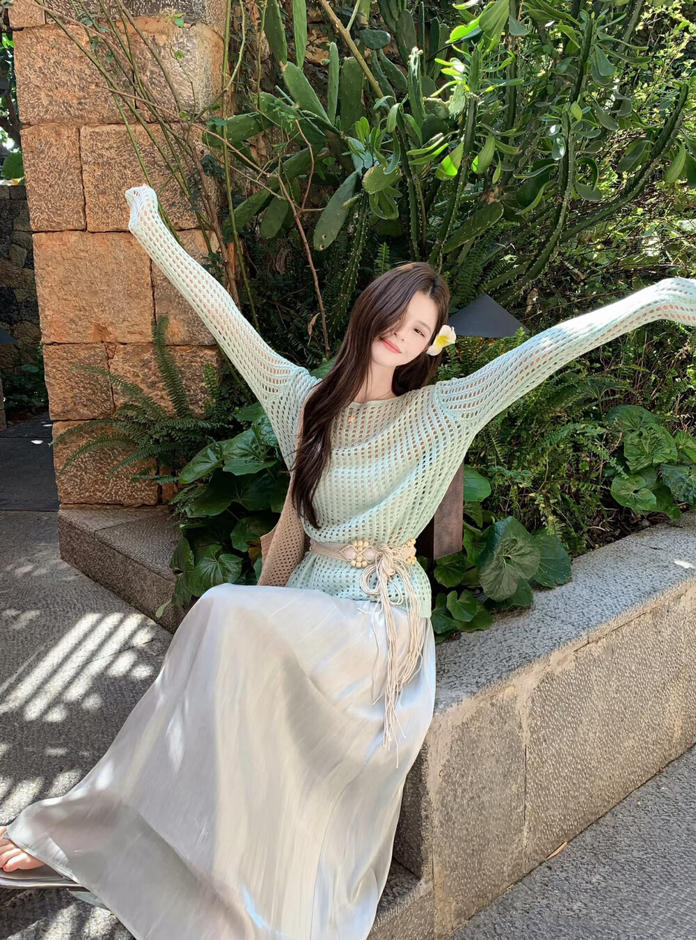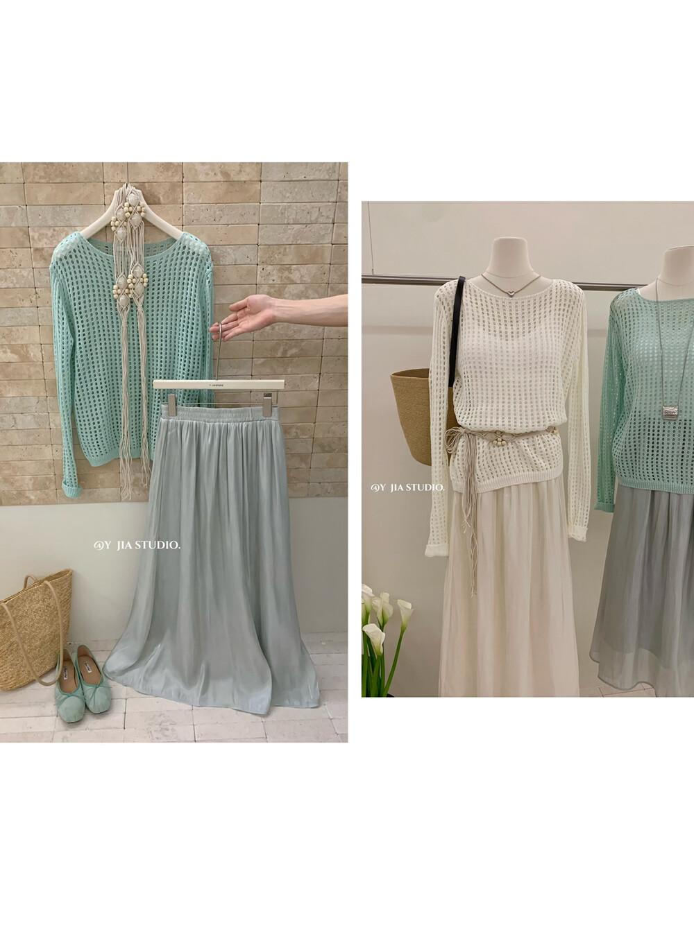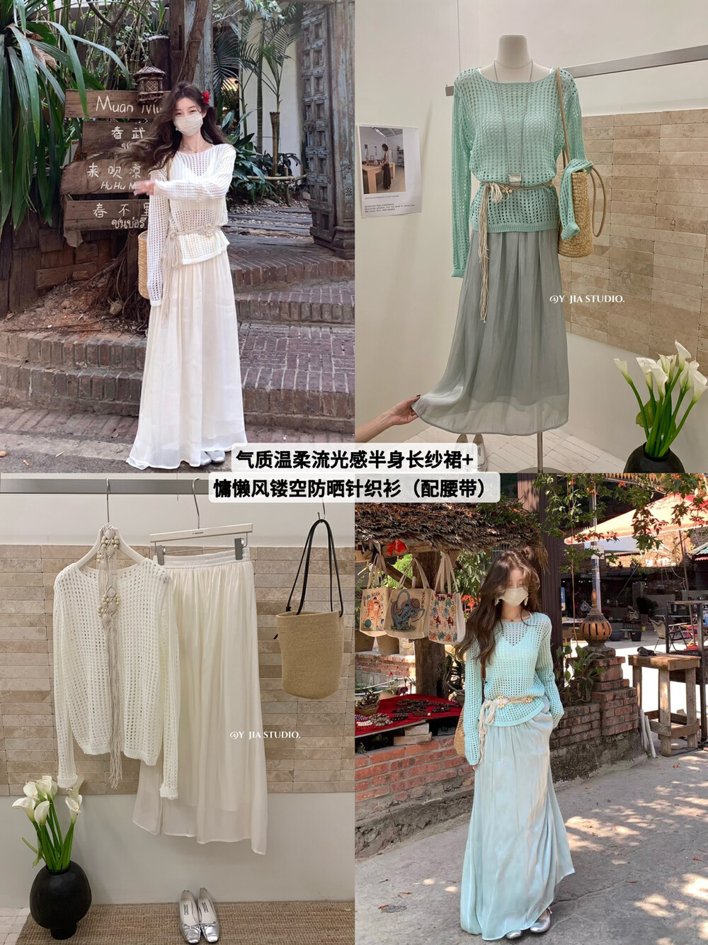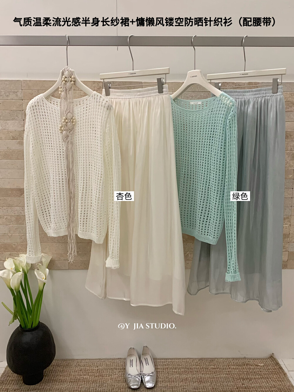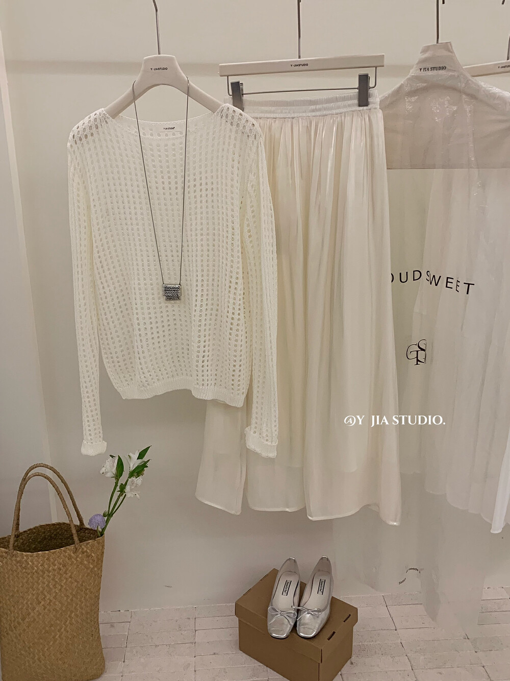 【GZ】无忧购气质温柔流光感半身长纱裙+慵懒风镂空防晒针织衫套装(配腰带)5576-5#(截单后7天发货)
