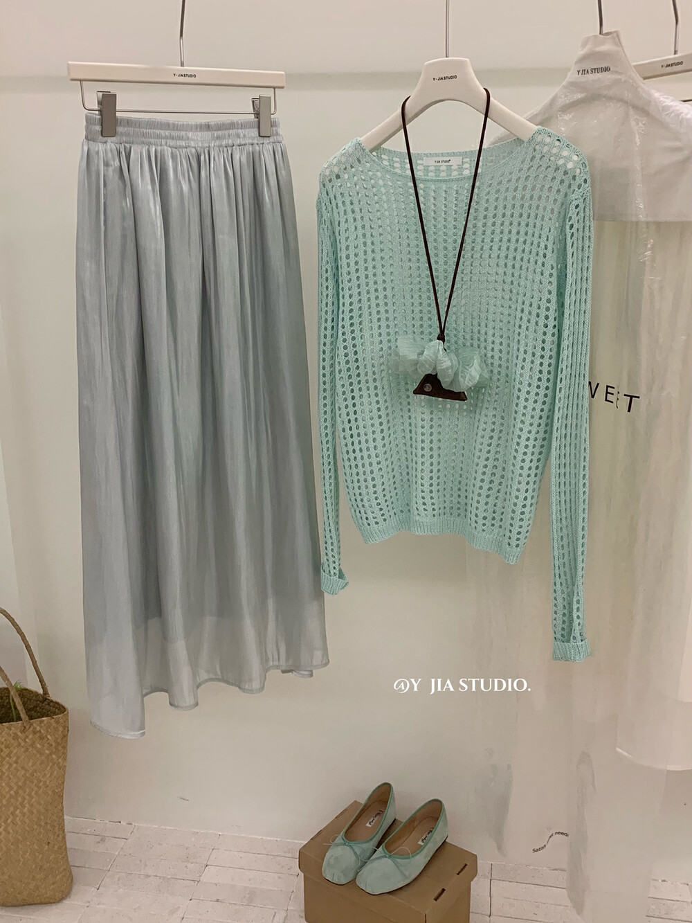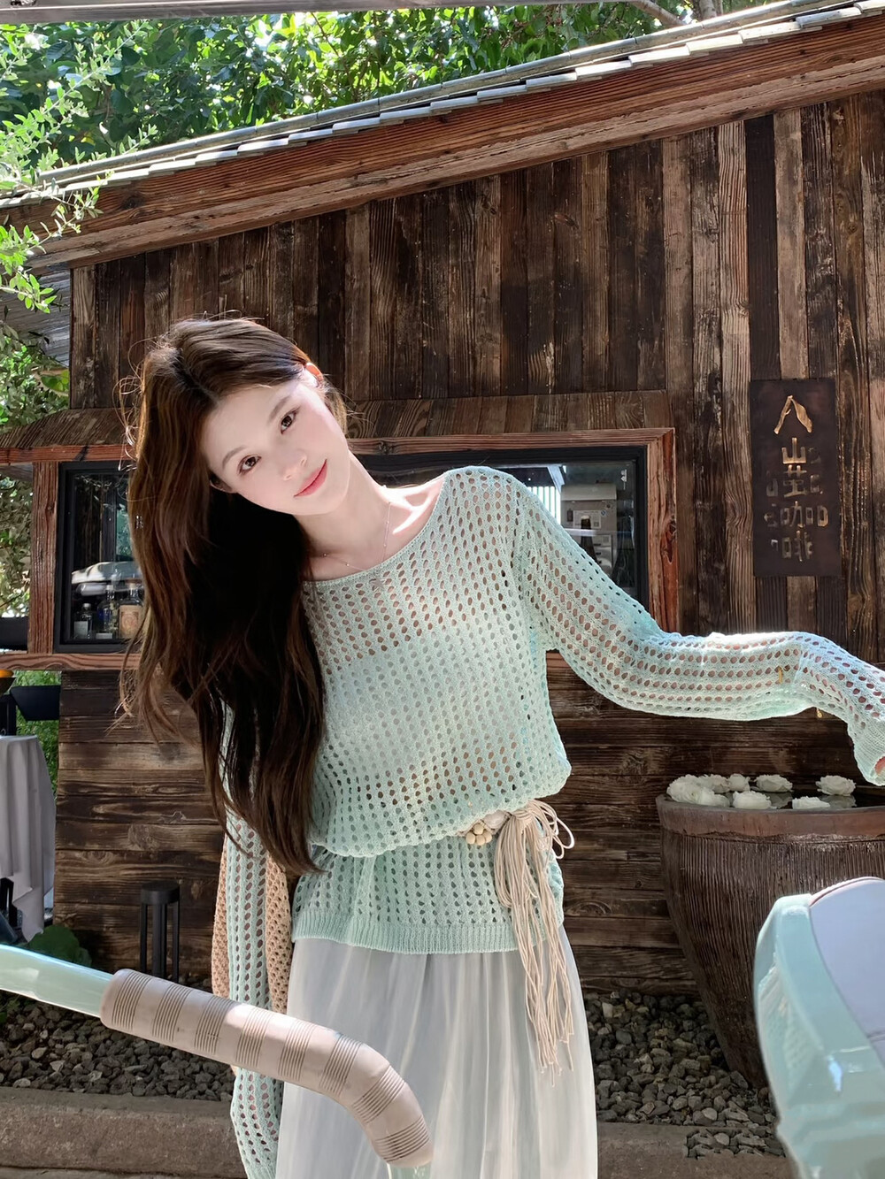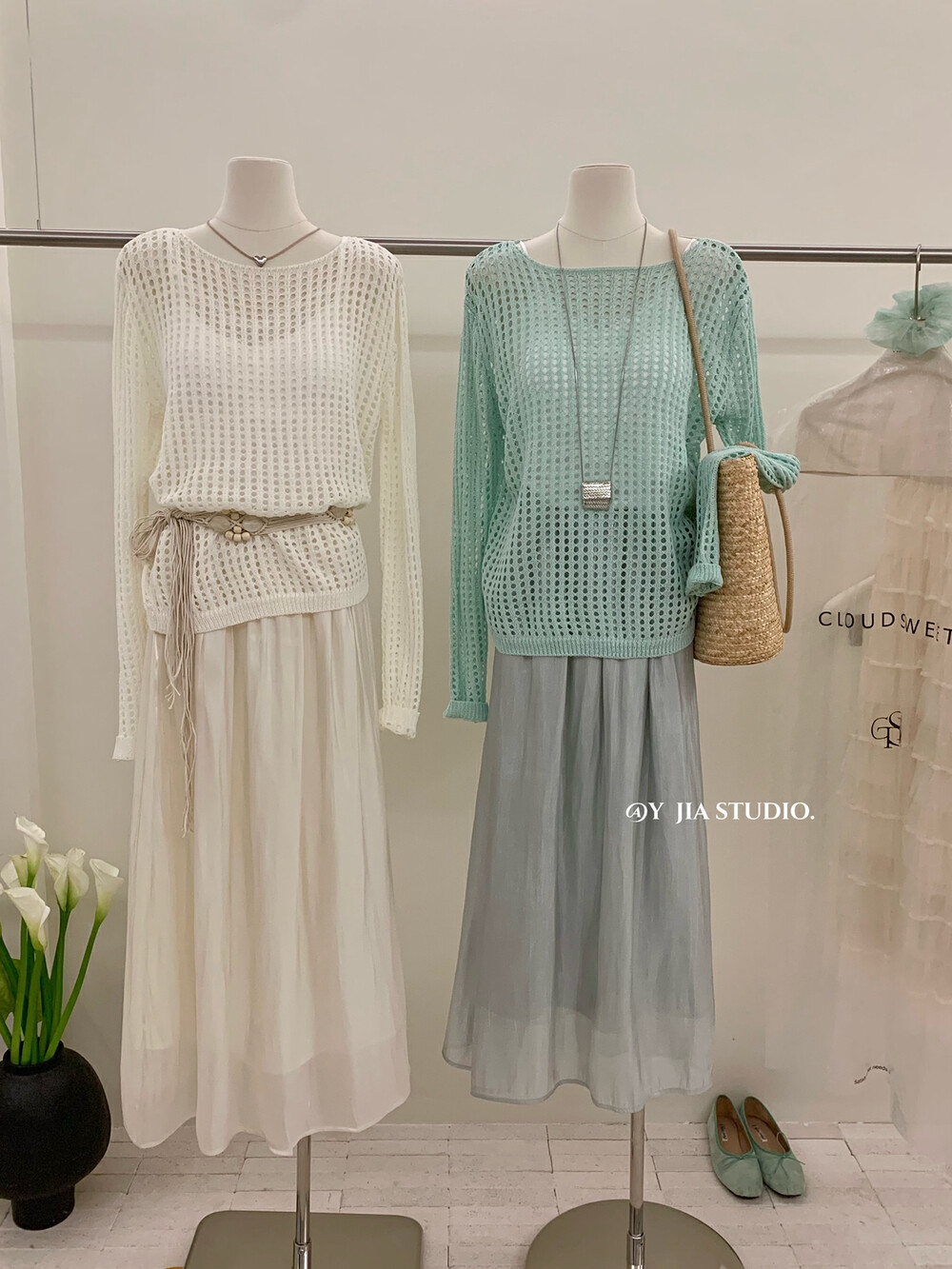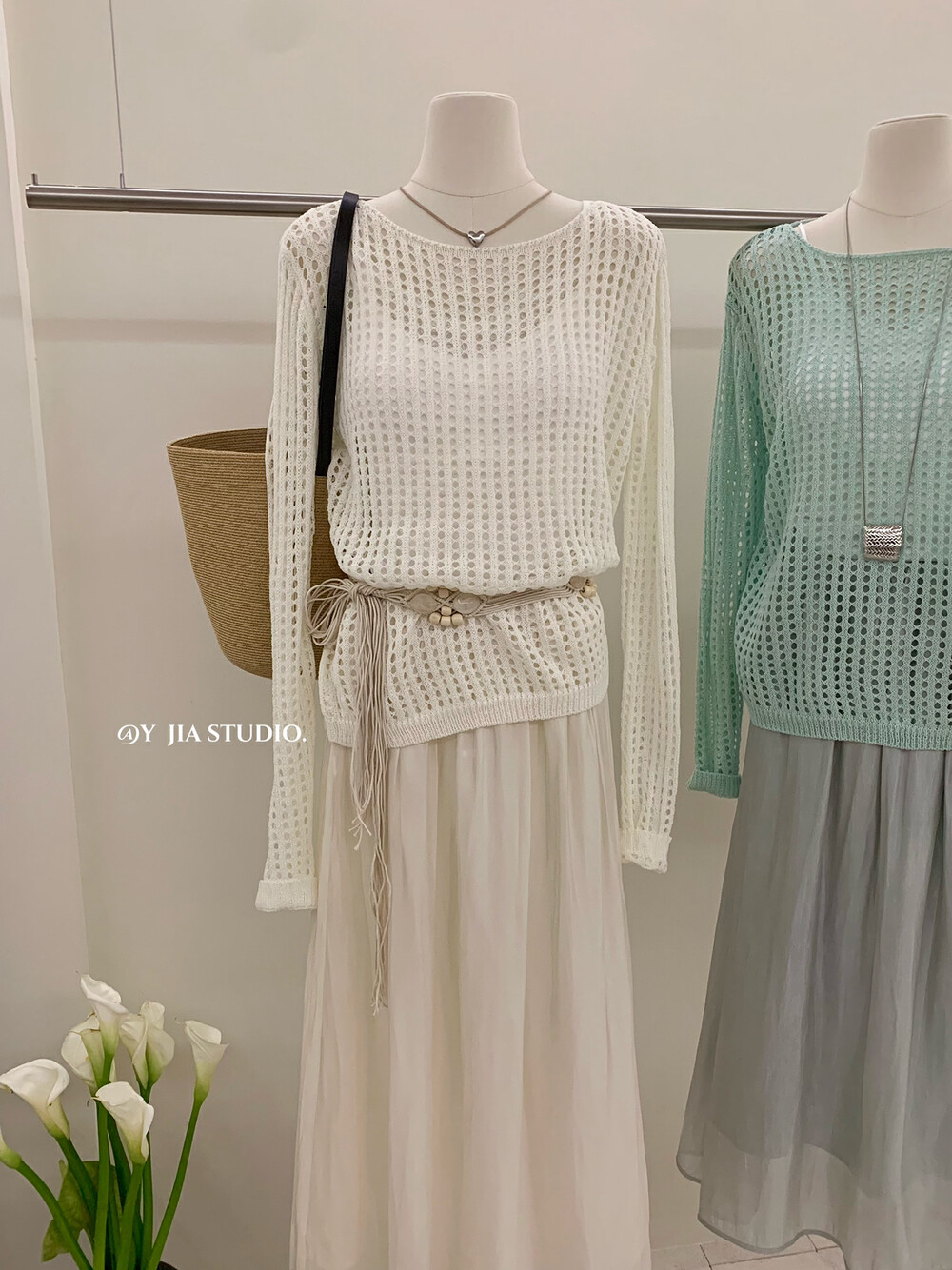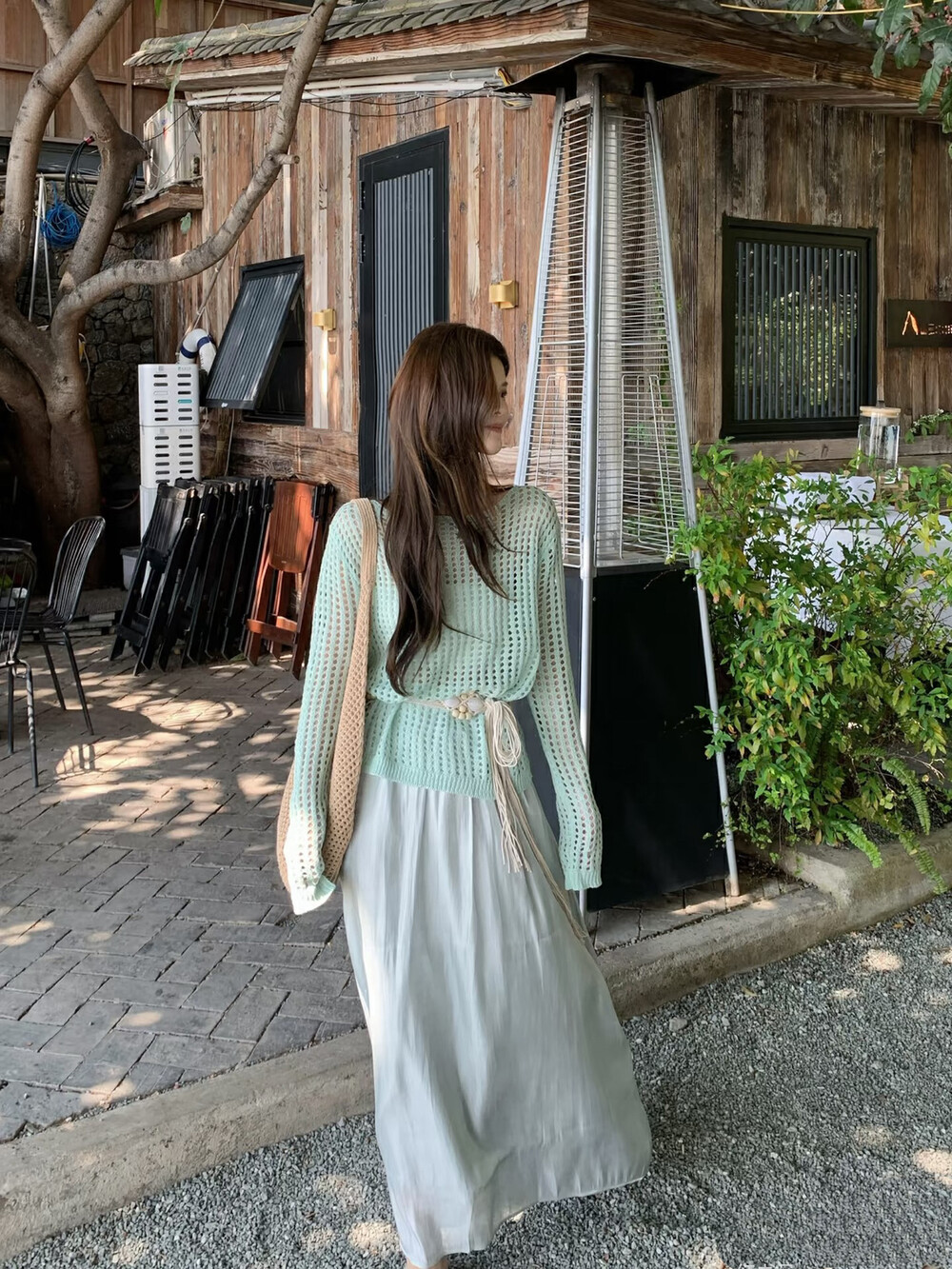 【GZ】无忧购气质温柔流光感半身长纱裙+慵懒风镂空防晒针织衫套装(配腰带)5576-5#(截单后7天发货)