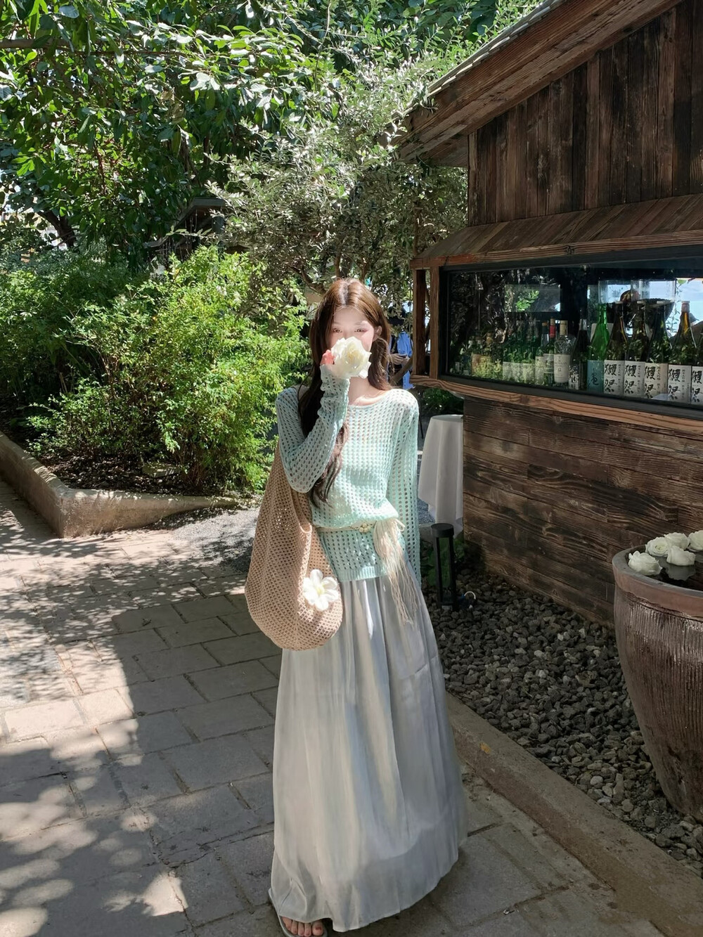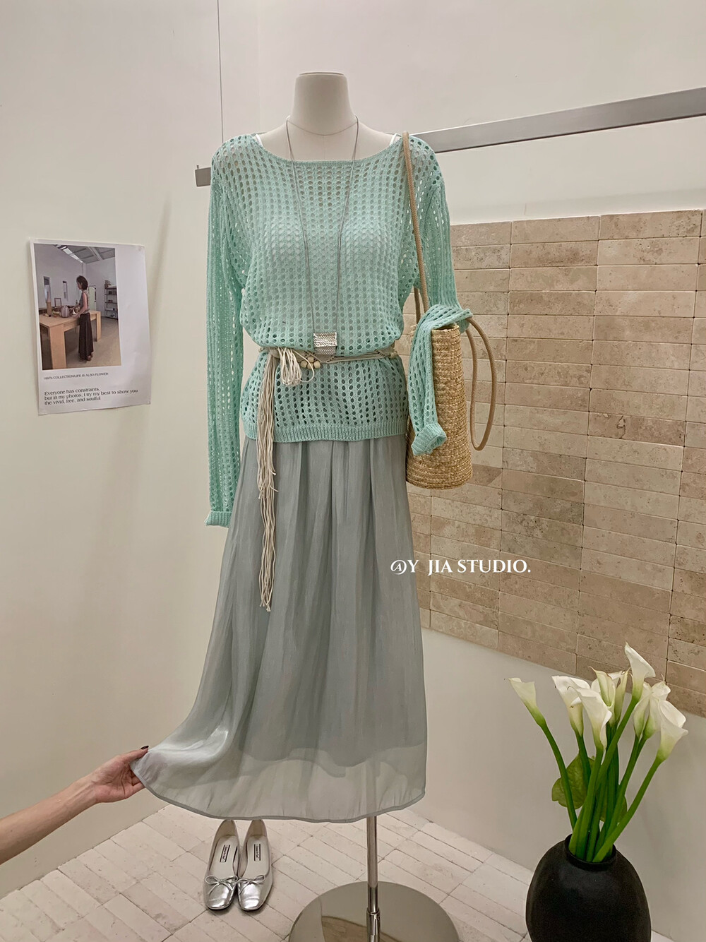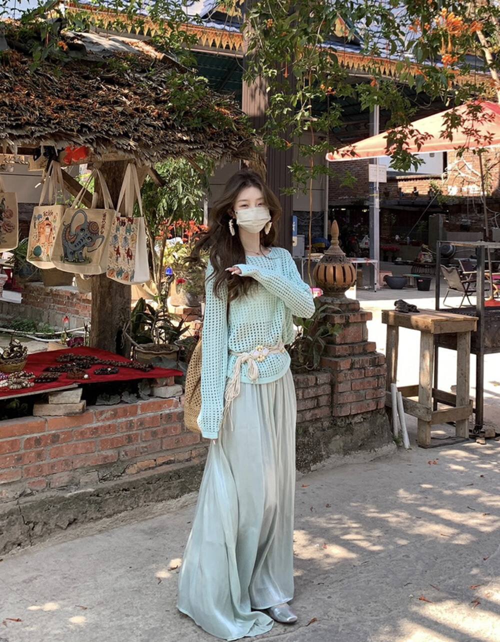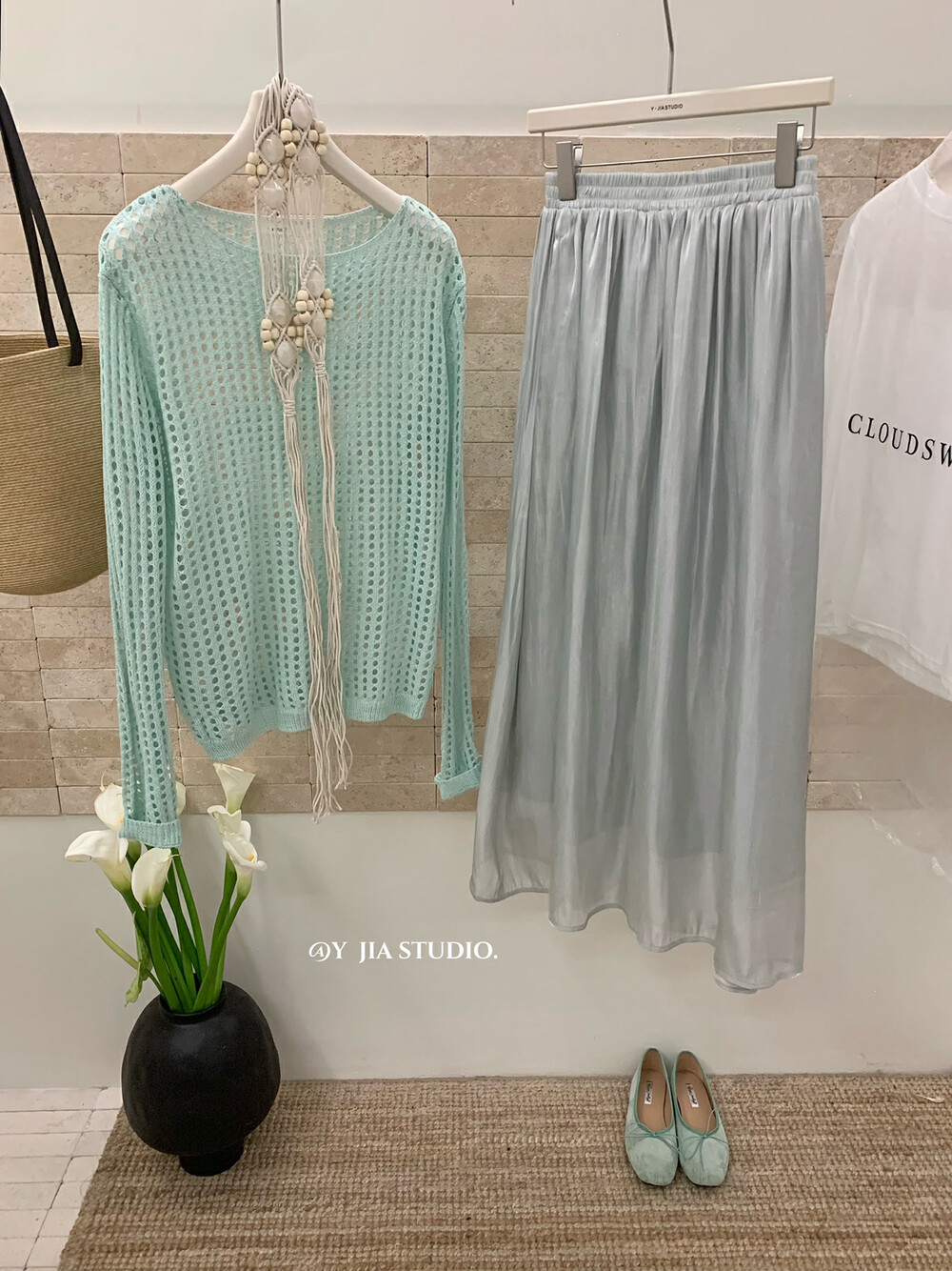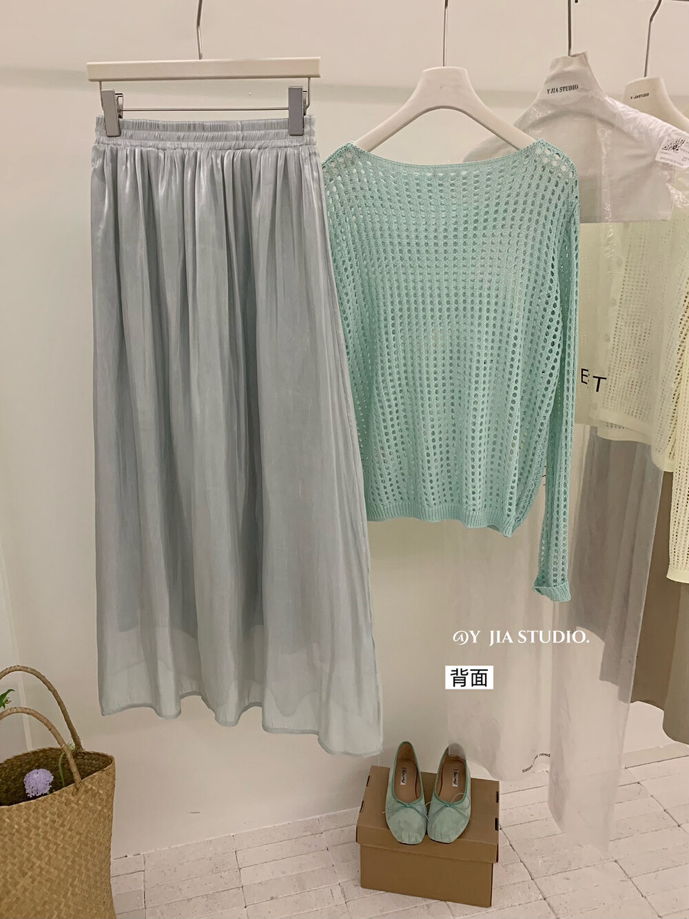 【GZ】无忧购气质温柔流光感半身长纱裙+慵懒风镂空防晒针织衫套装(配腰带)5576-5#(截单后7天发货)