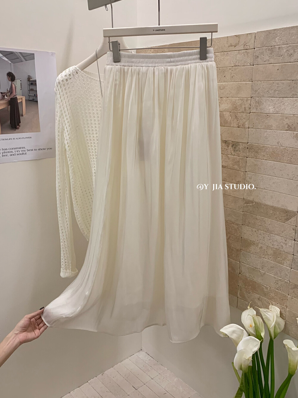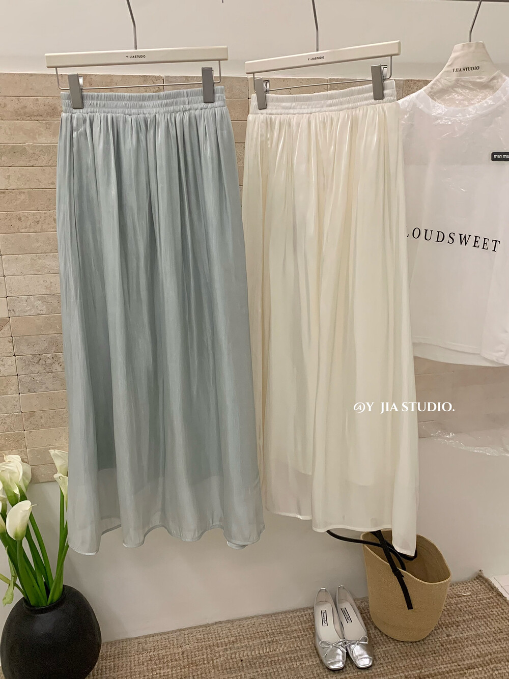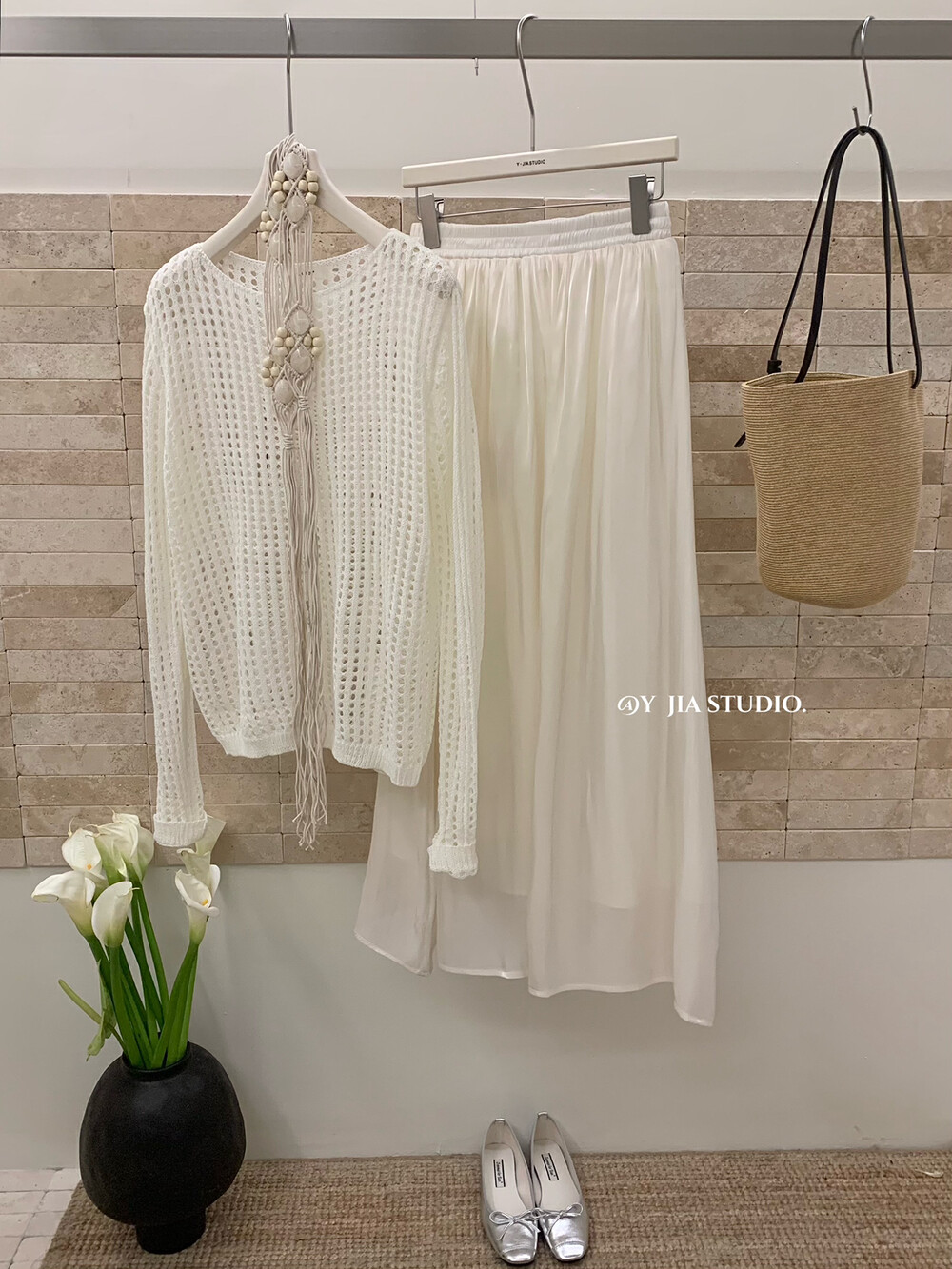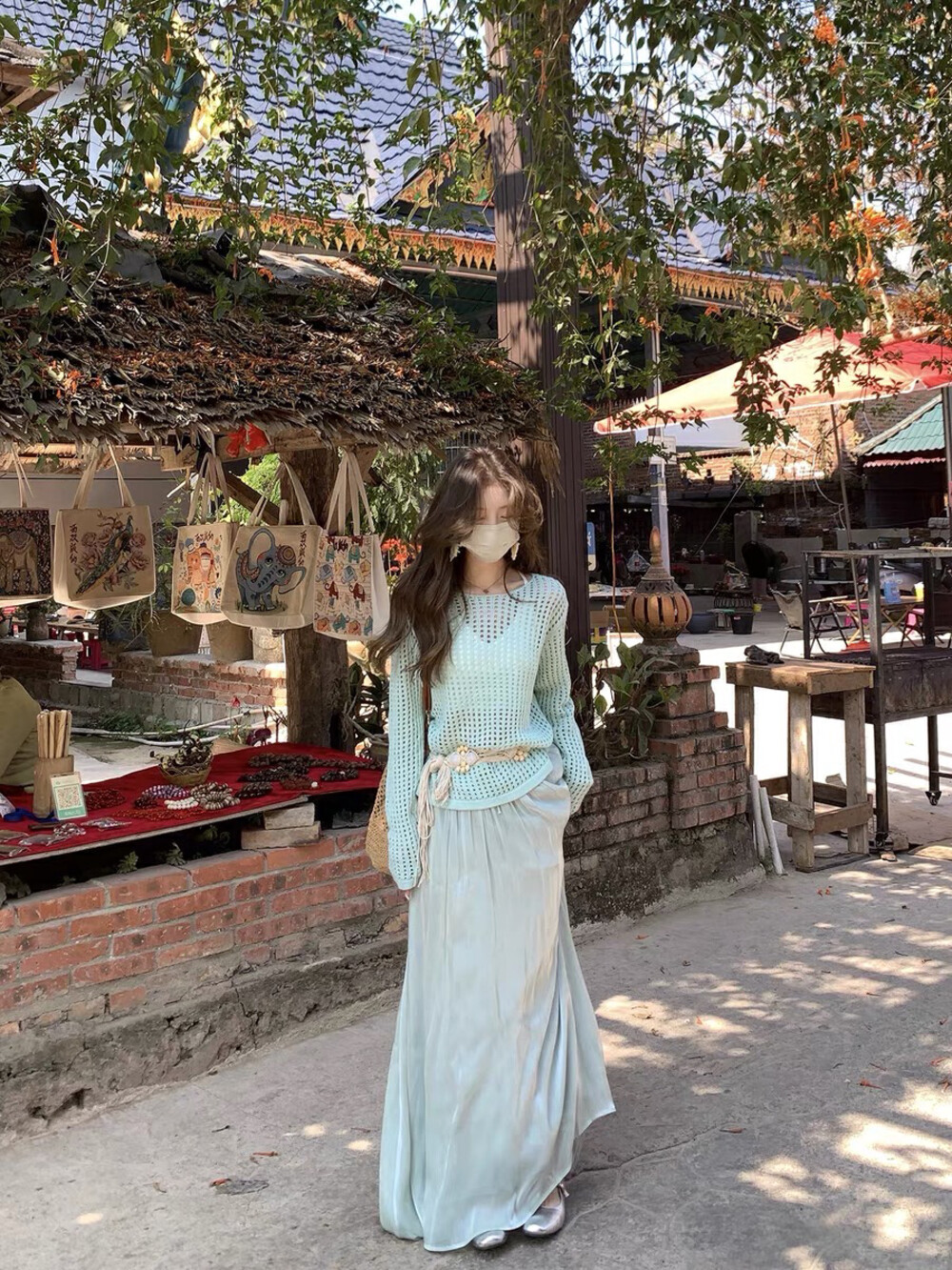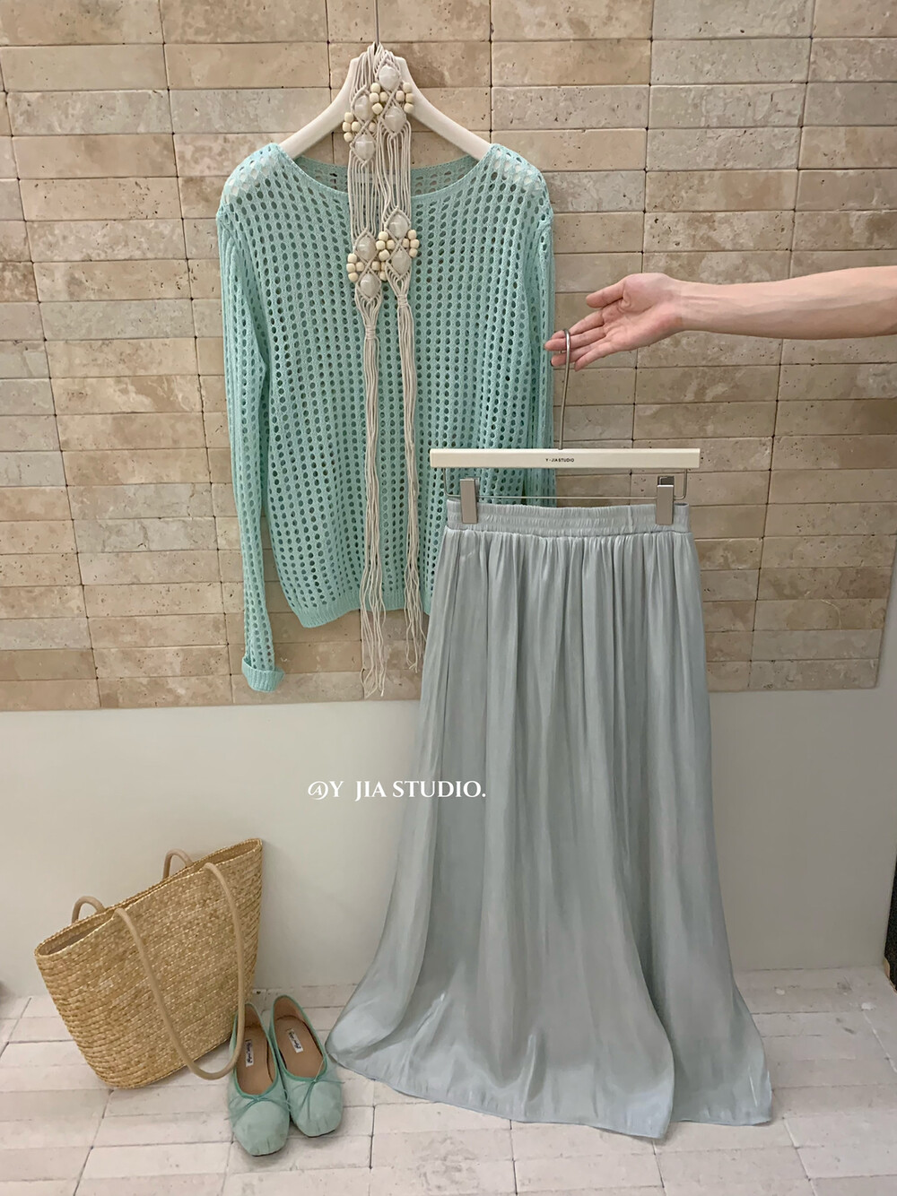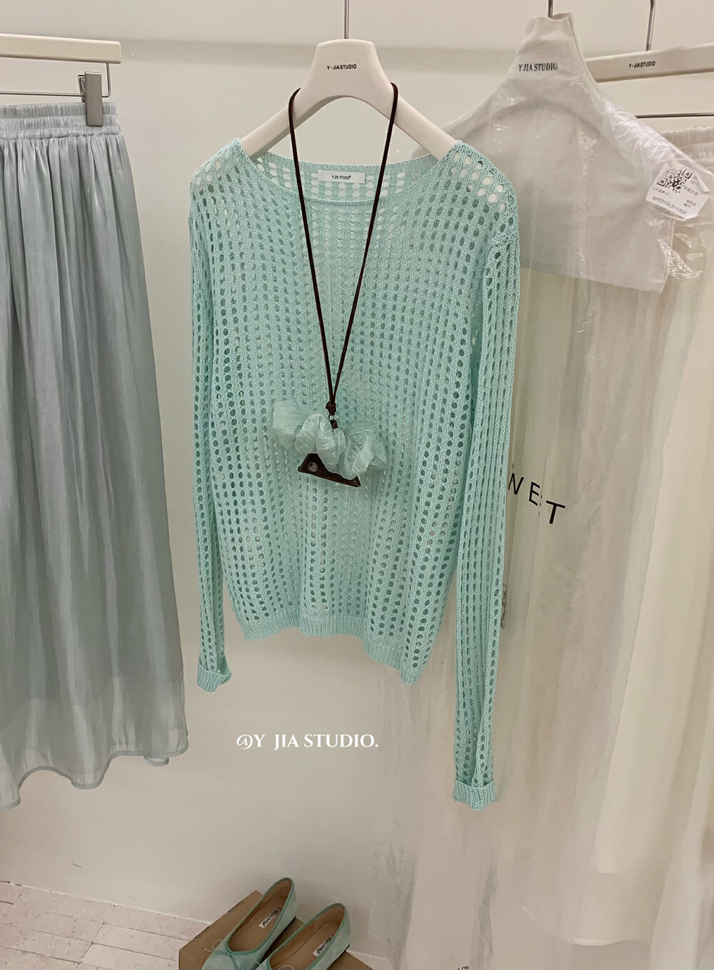 【GZ】无忧购气质温柔流光感半身长纱裙+慵懒风镂空防晒针织衫套装(配腰带)5576-5#(截单后7天发货)