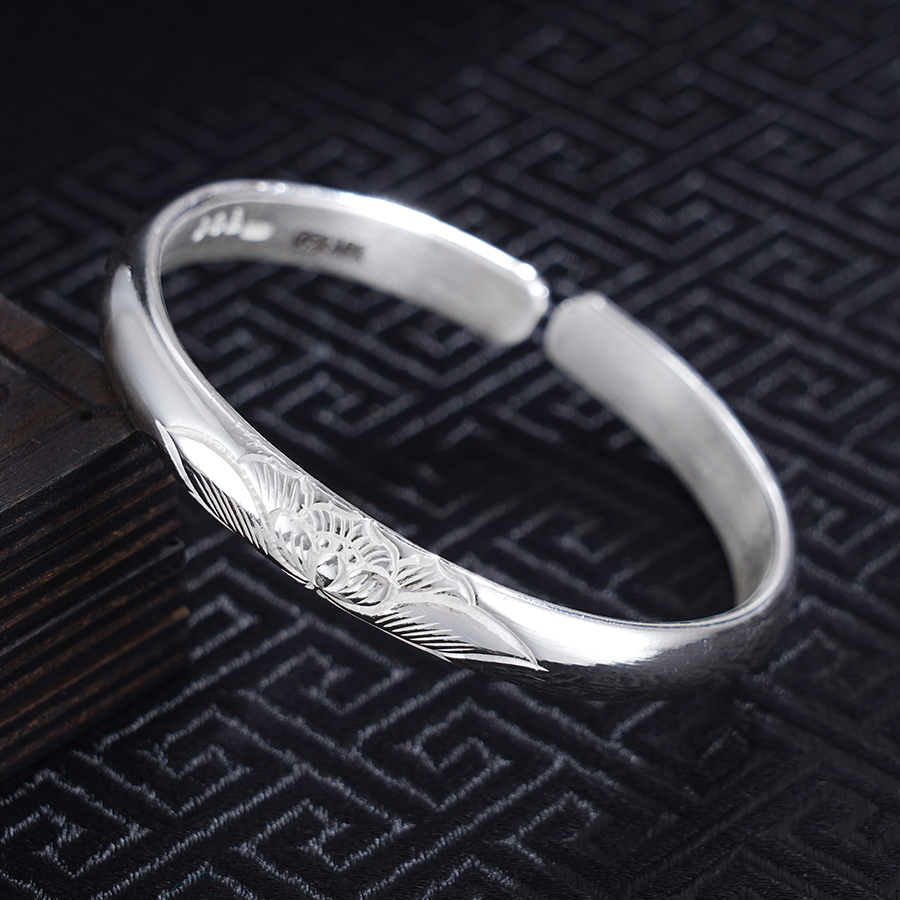 【寓意】:纯银开口手镯,镯面錾刻莲花图案。花瓣肌理分明,灵动之感扑面而来。寓意清雅相伴,静享美好流年。