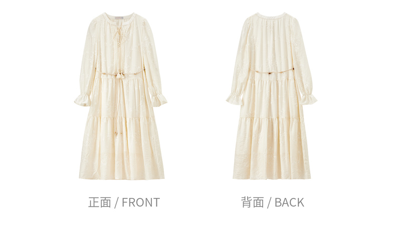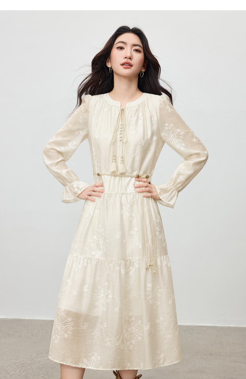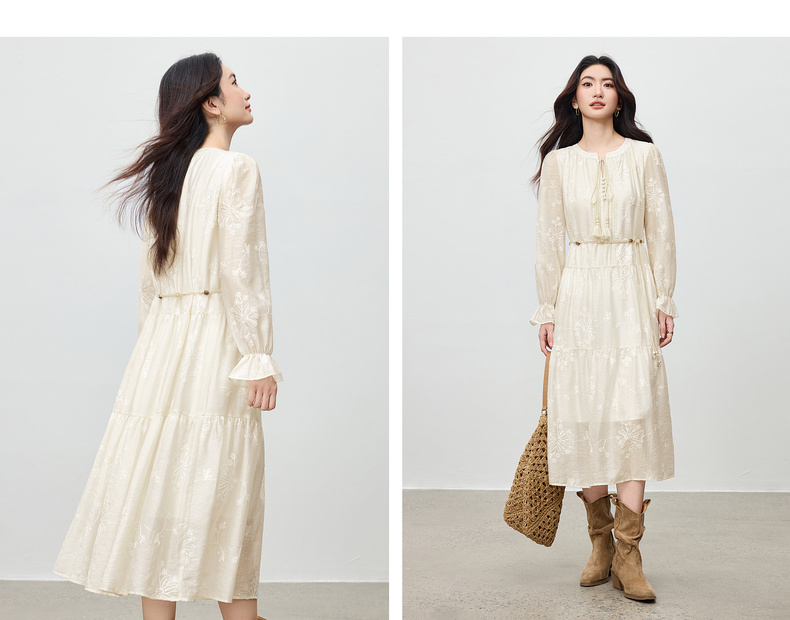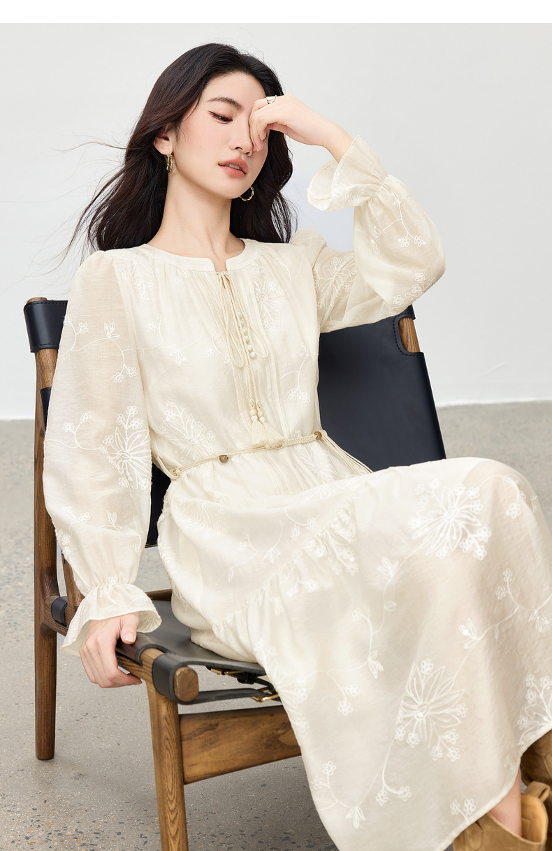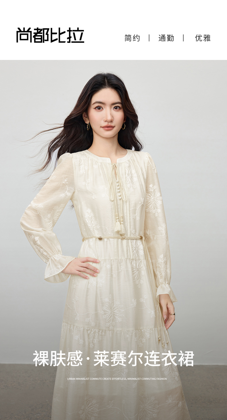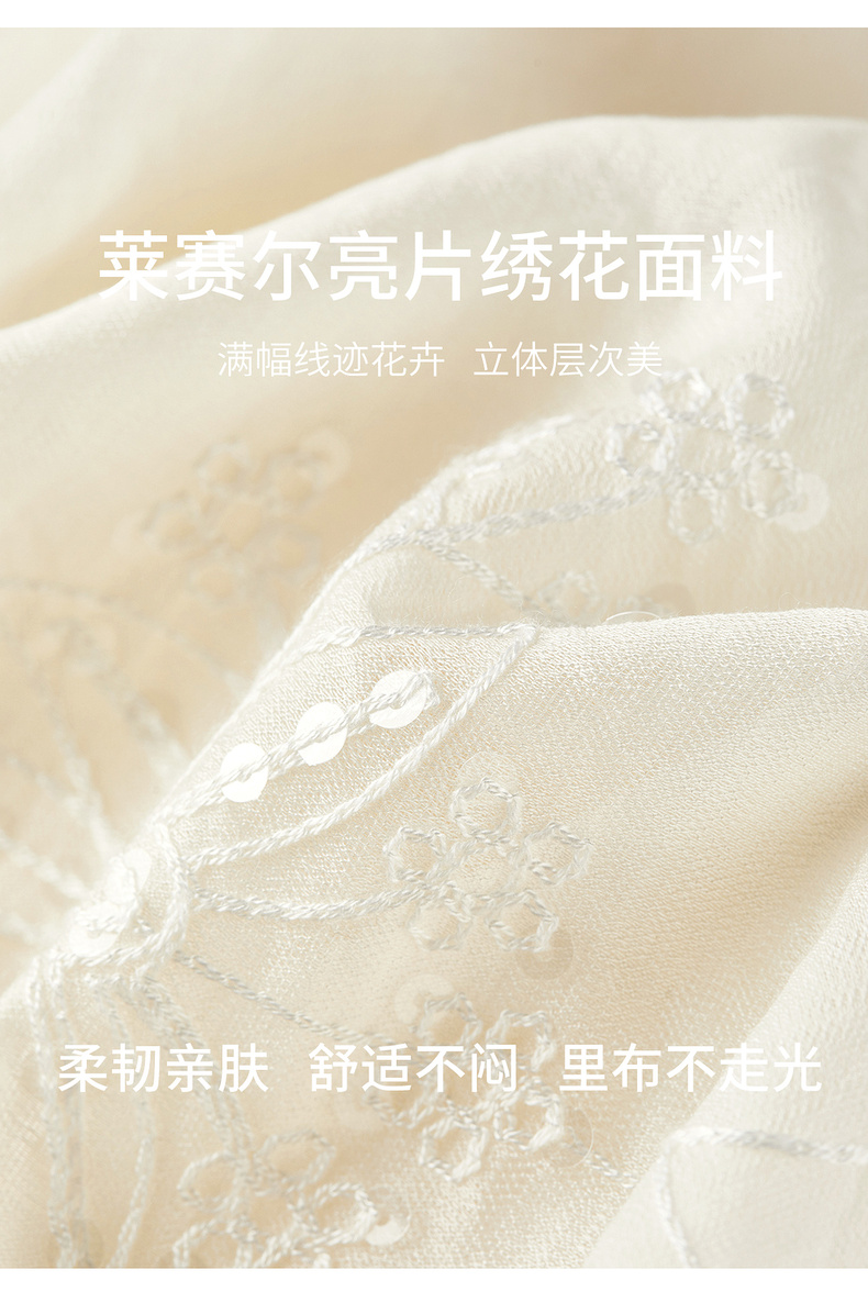 【内购】【莱赛尔】优雅通勤圆领可拆卸腰带泡泡袖宽松显瘦亮片绣花连衣裙-Q53LI3927