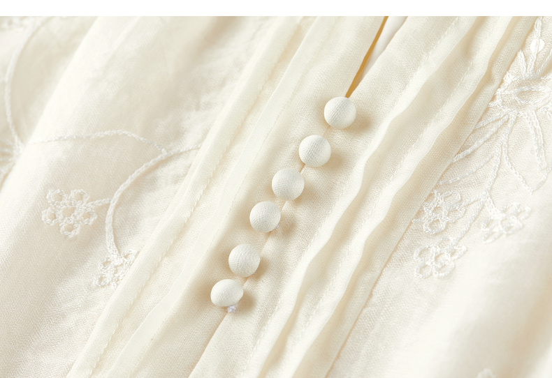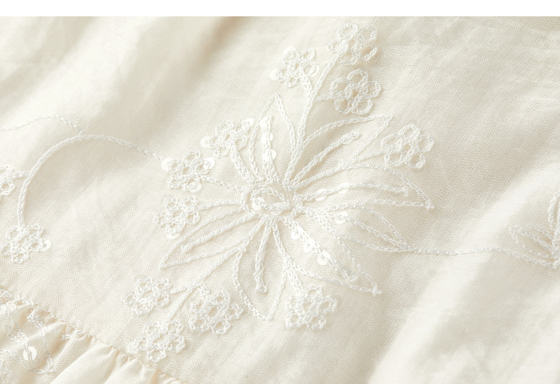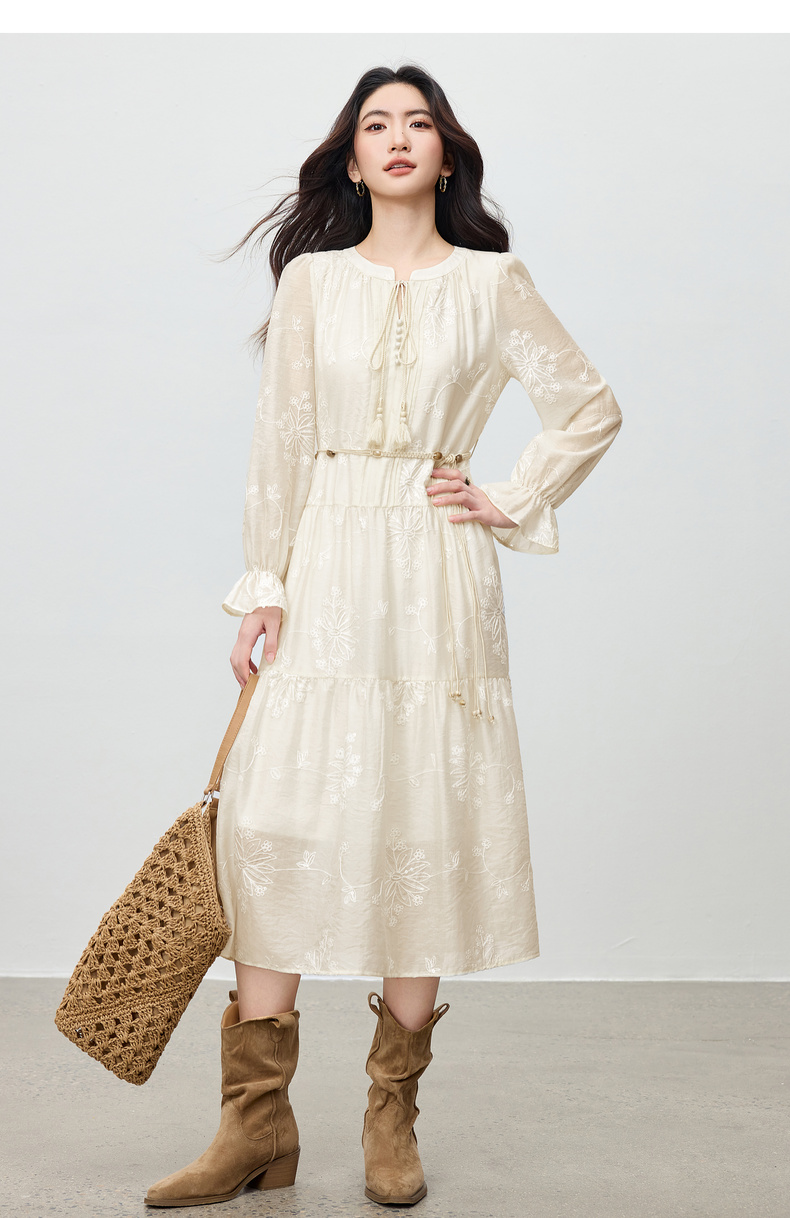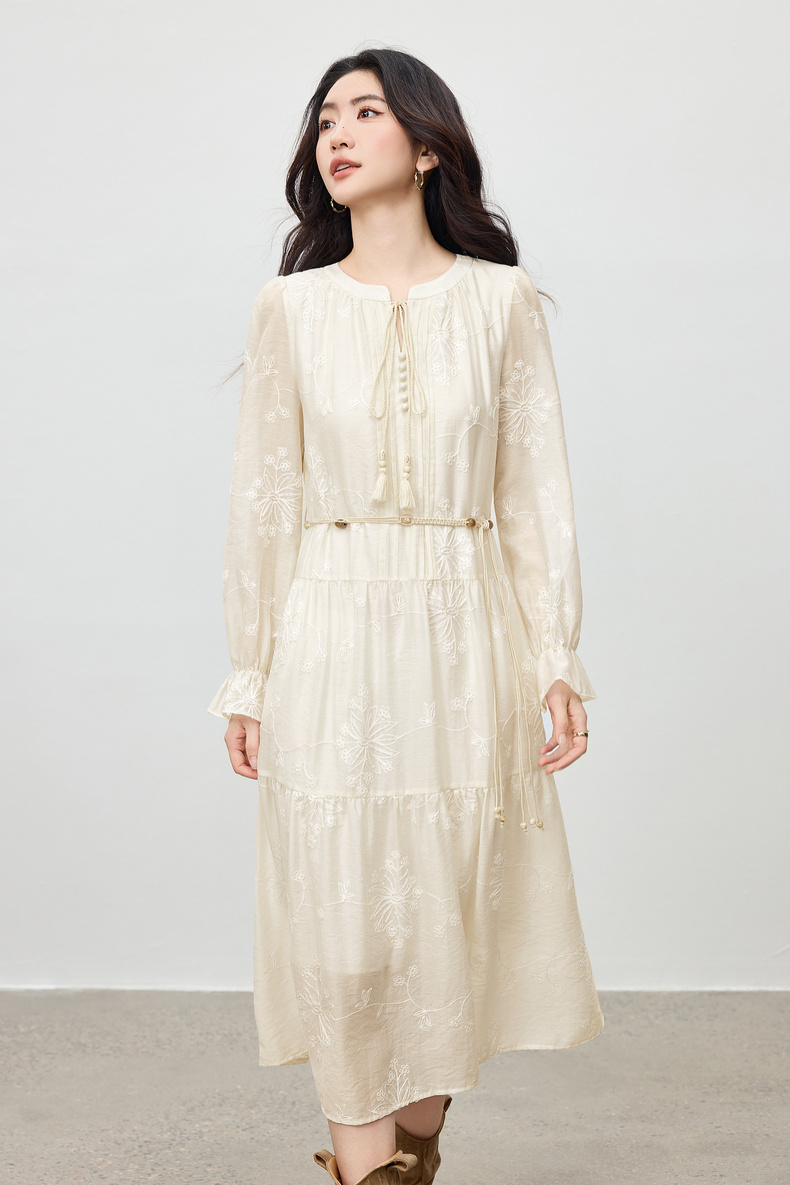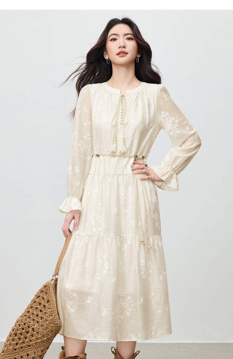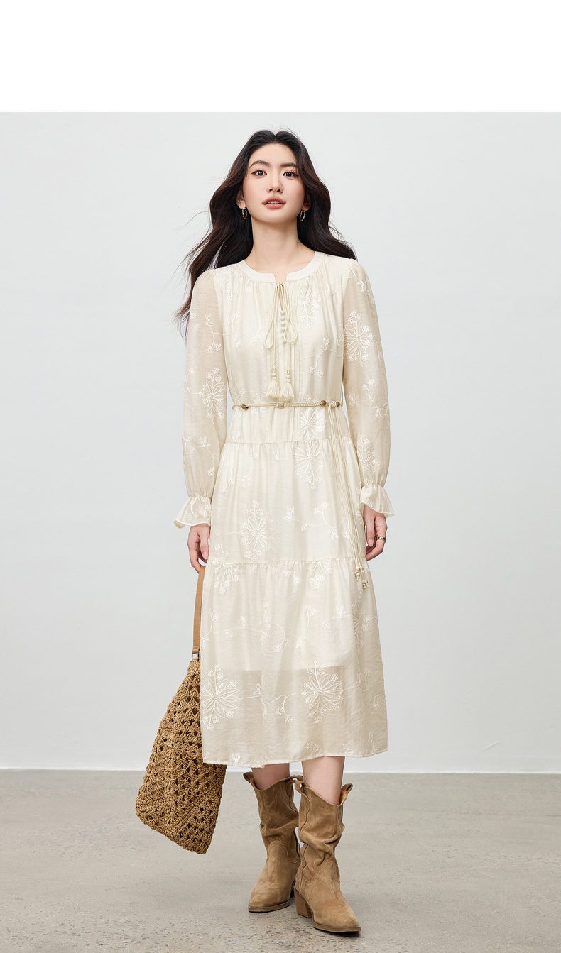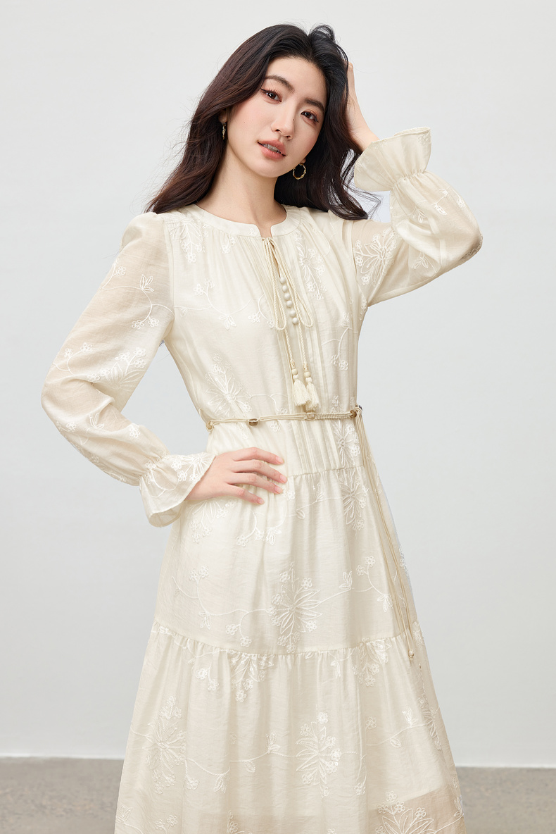 【内购】【莱赛尔】优雅通勤圆领可拆卸腰带泡泡袖宽松显瘦亮片绣花连衣裙-Q53LI3927