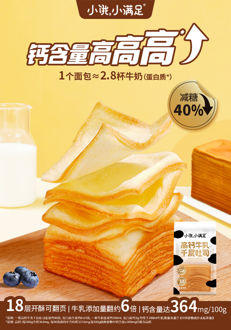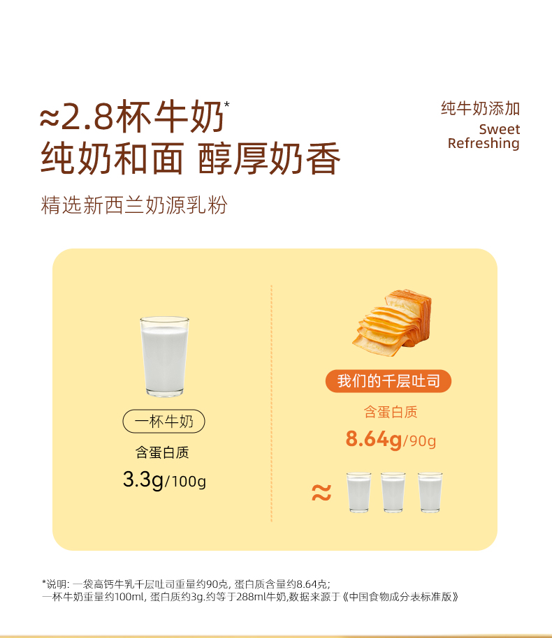 3、牛乳添加量约是普通千层吐司的6倍,钙含量达364mg/100g
