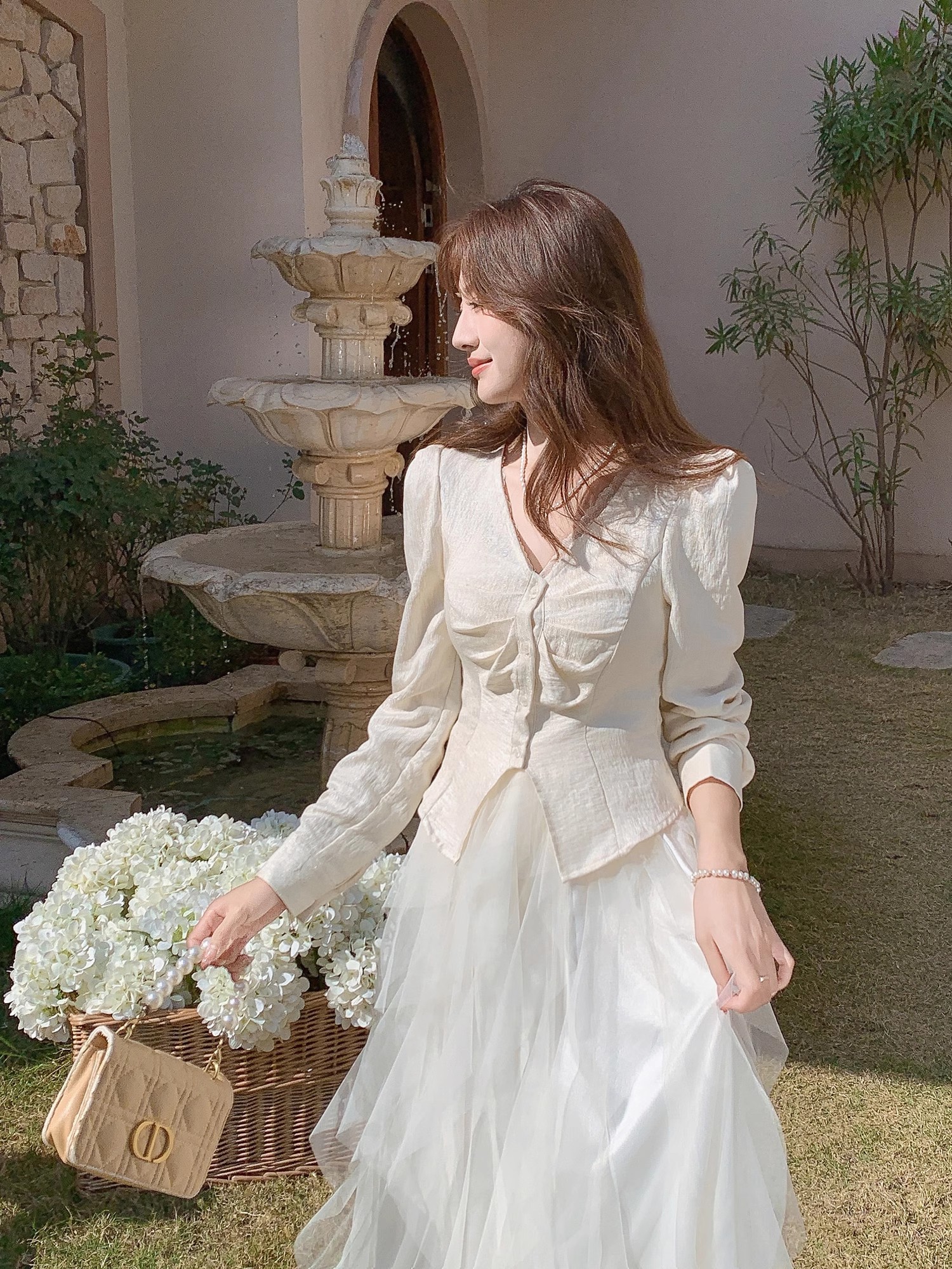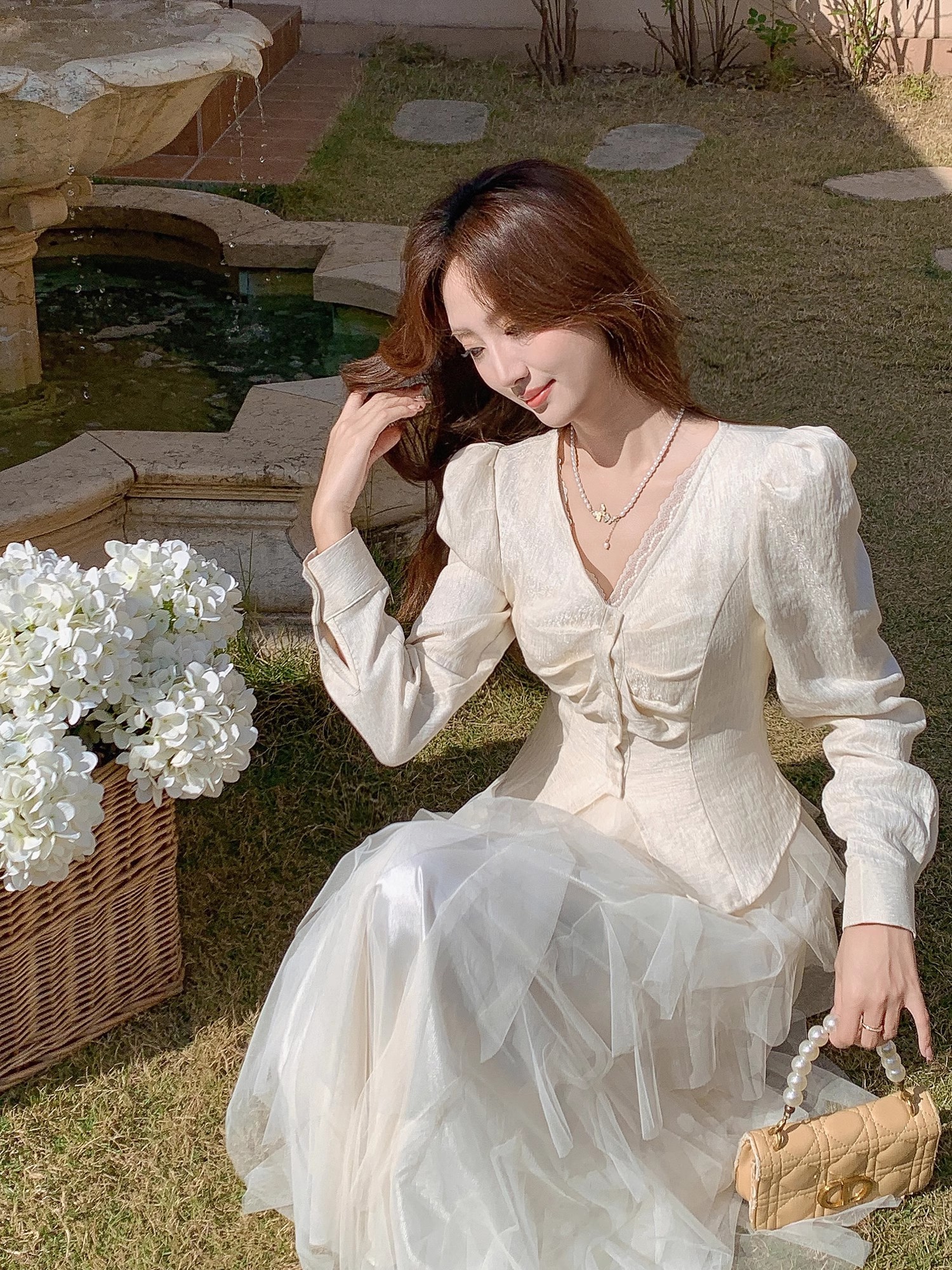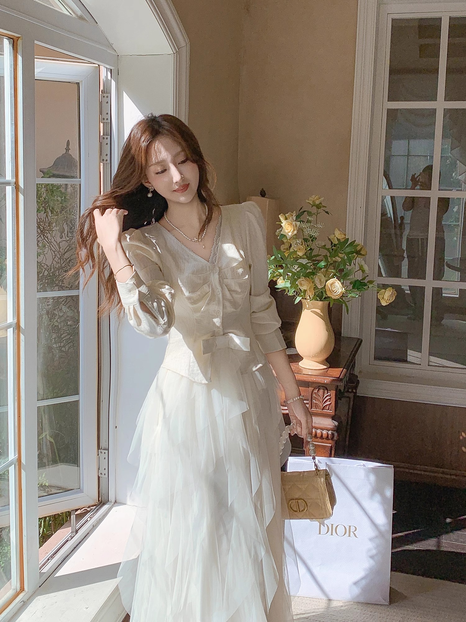 张心子【月光奏鸣】V领蕾丝系带通勤百搭气质衬衫上衣 U2509010