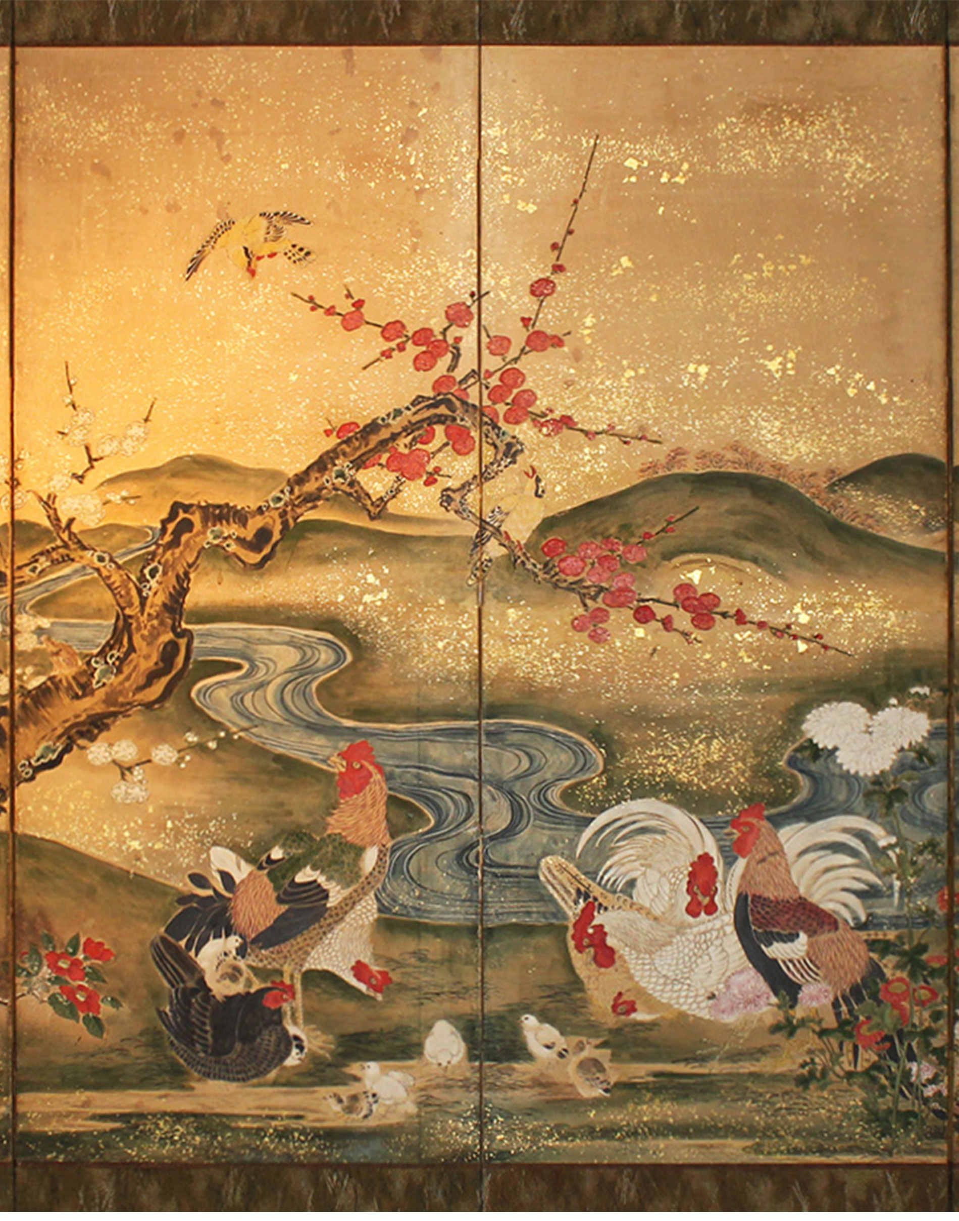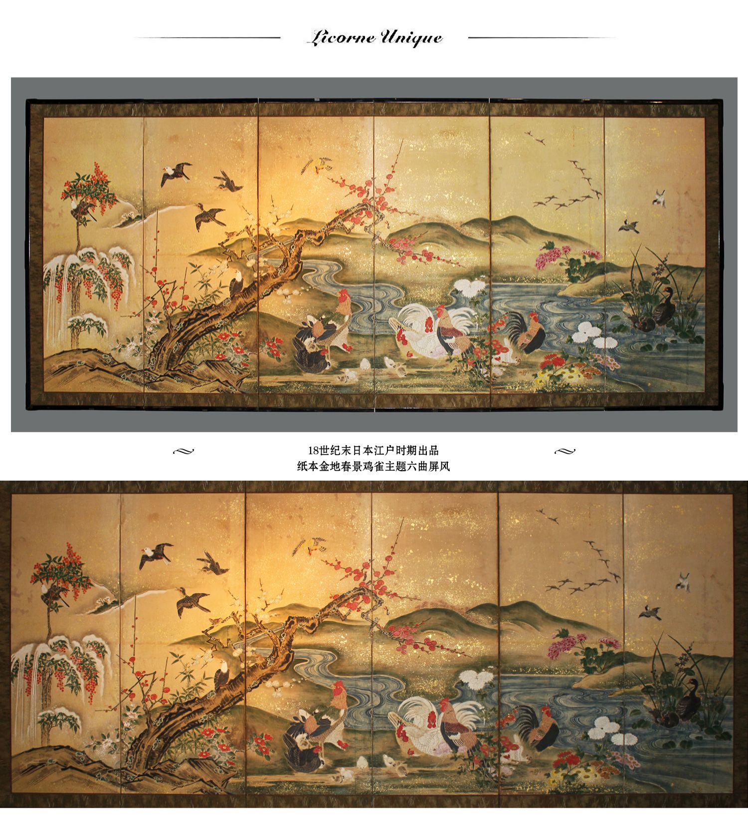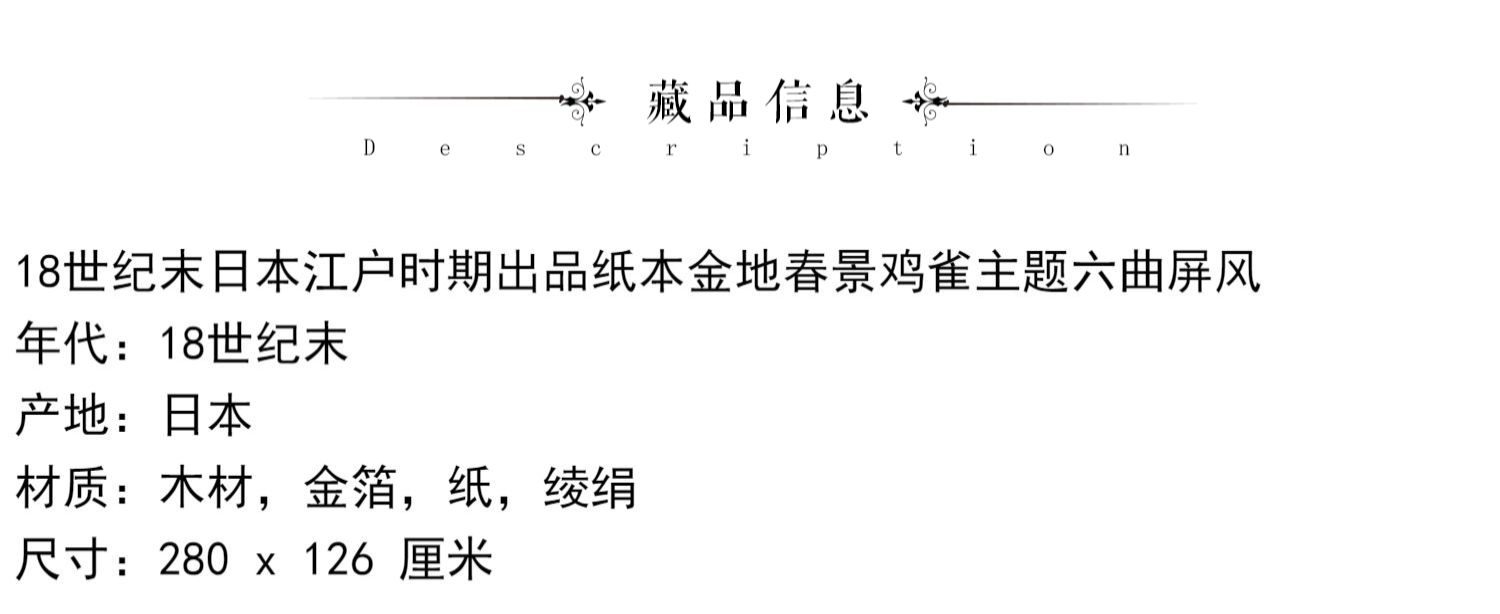 独角鹿西洋古董日本江户时期纸本金地春景鸡雀主题六曲屏风六扇