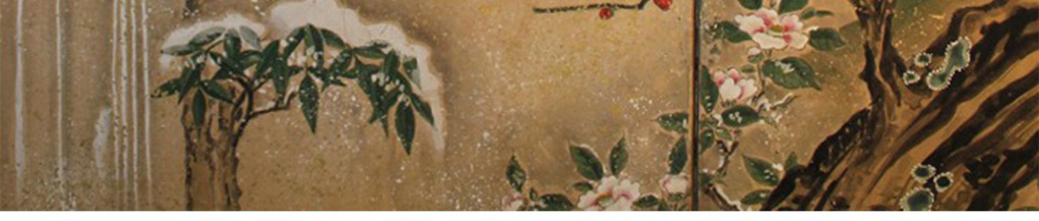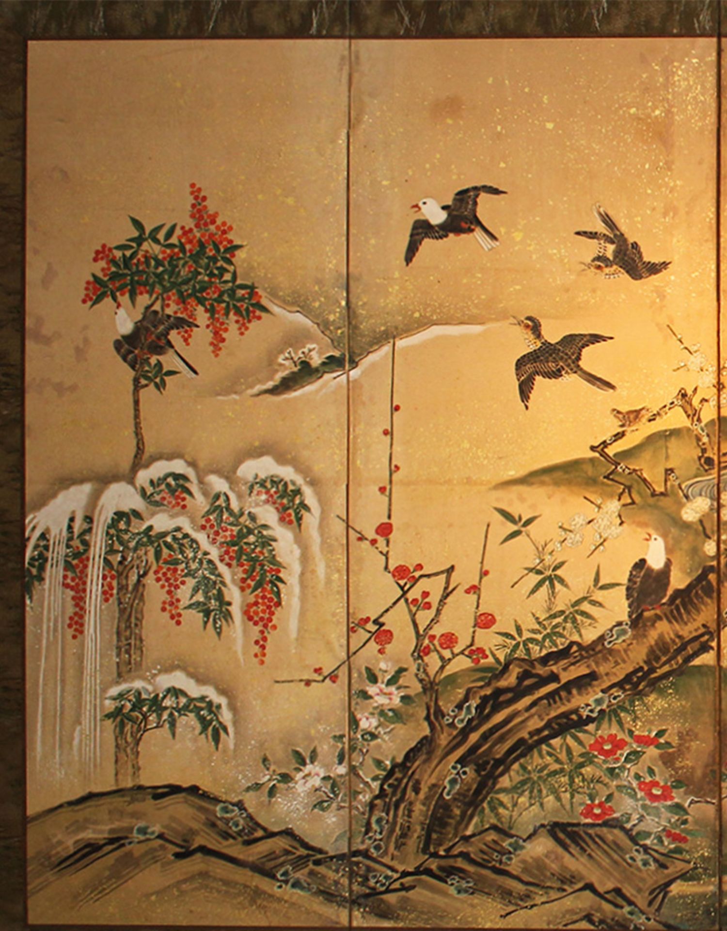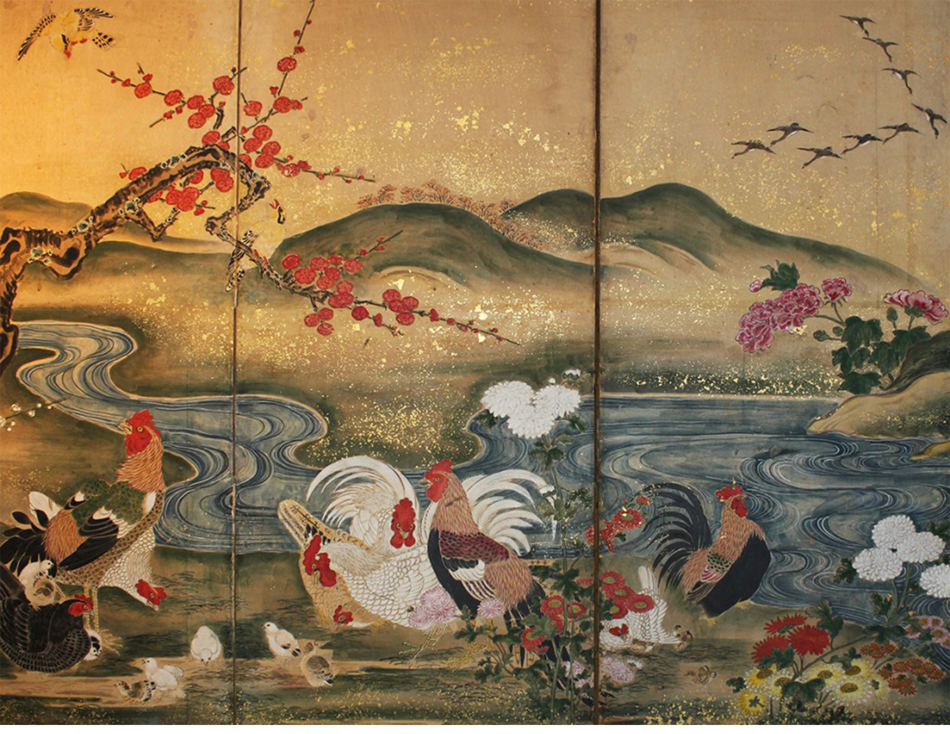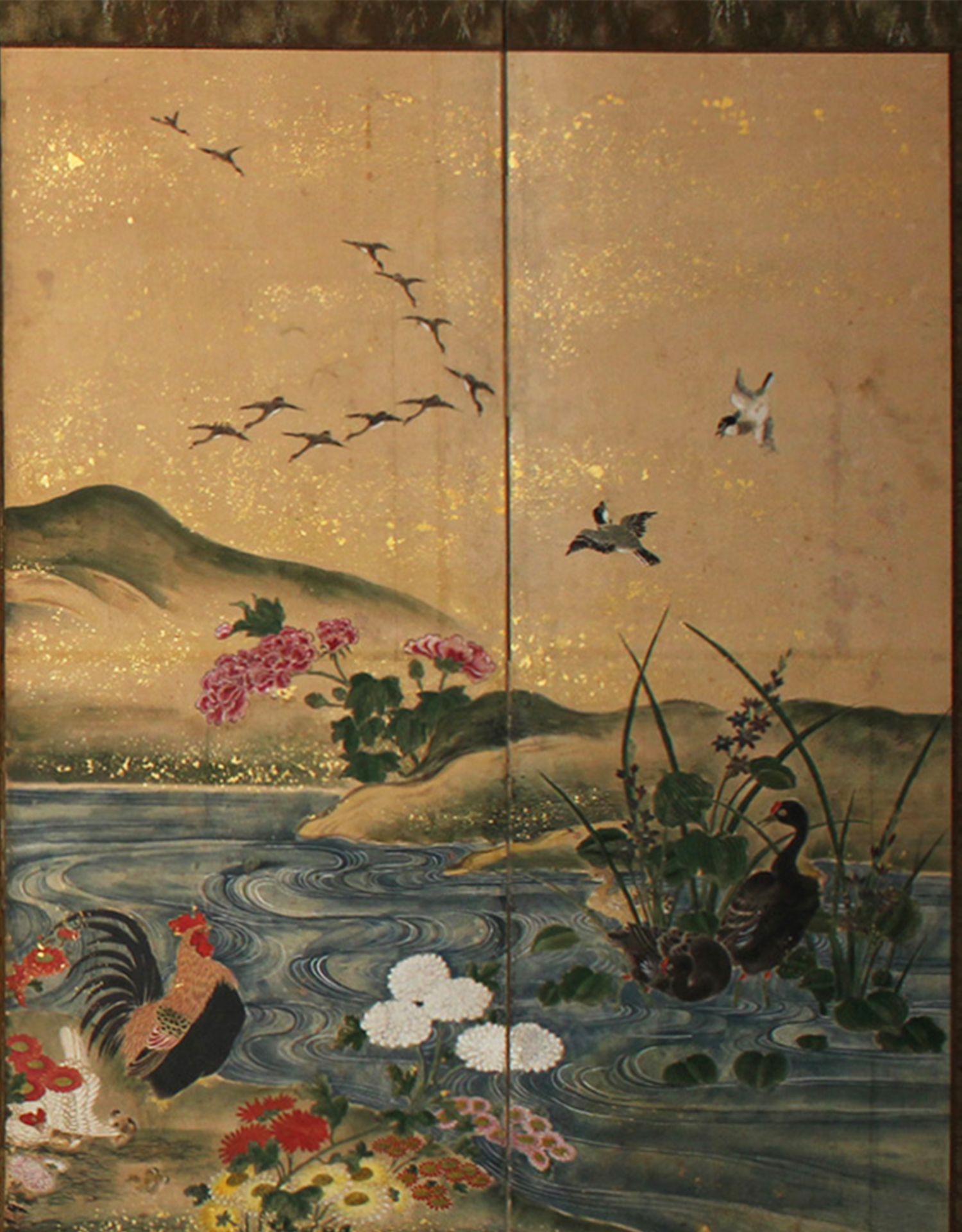 独角鹿西洋古董日本江户时期纸本金地春景鸡雀主题六曲屏风六扇