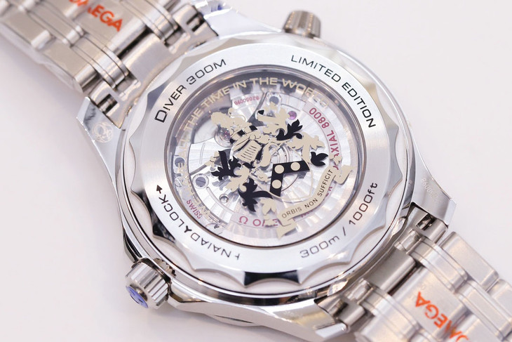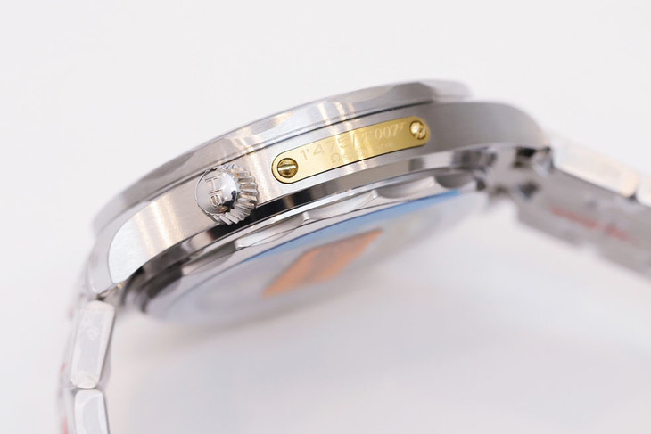 采用背透式设计,背透镜面上镌刻有007限量版金色盾牌徽章,彰显这款腕表作为詹姆斯邦德007的特点。OR厂的这款机芯搭载一体化8800机芯稳定耐用,因为机芯的摆轮位置和原版是一样的,没有什么大问题,也很难看出真假。