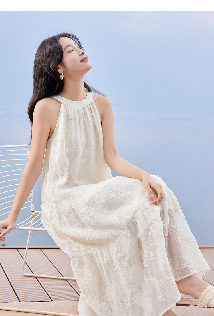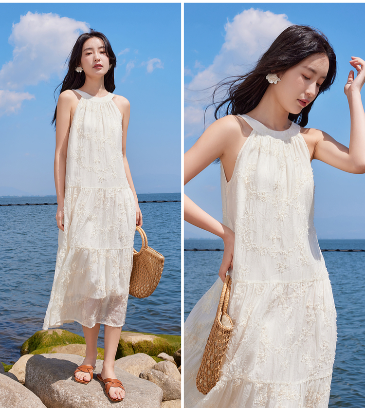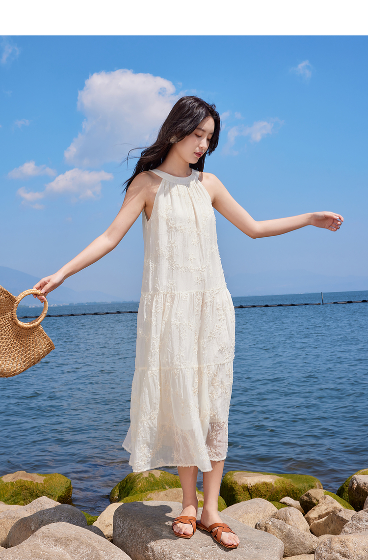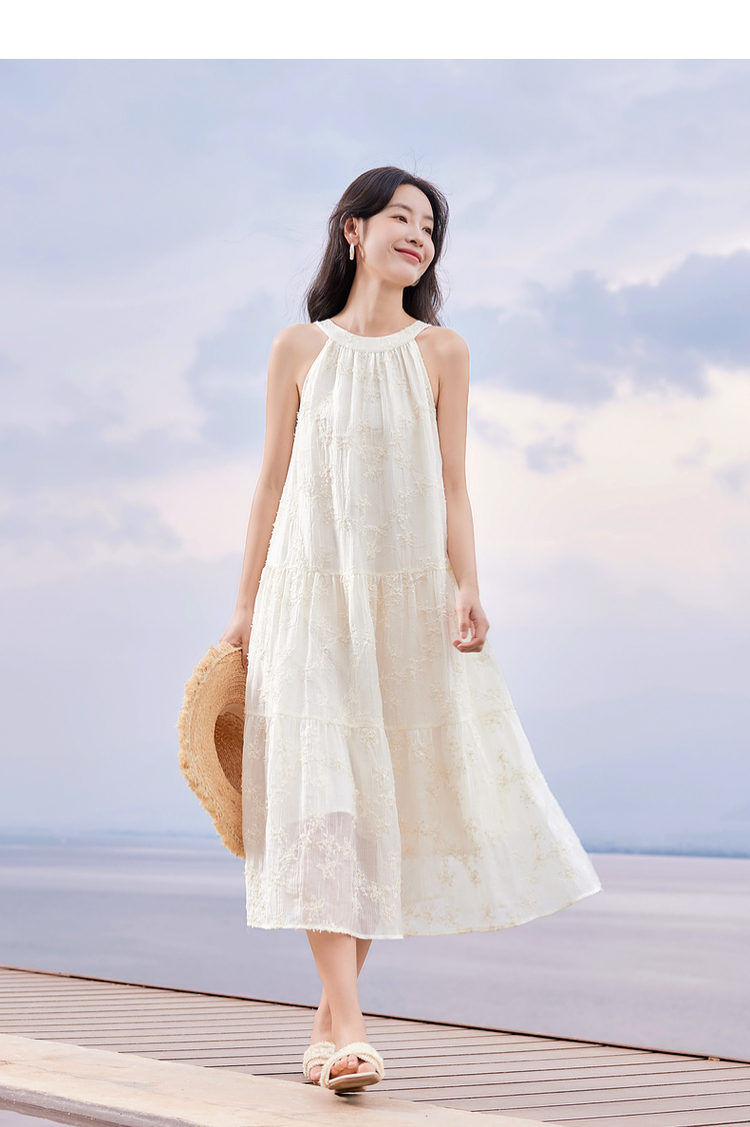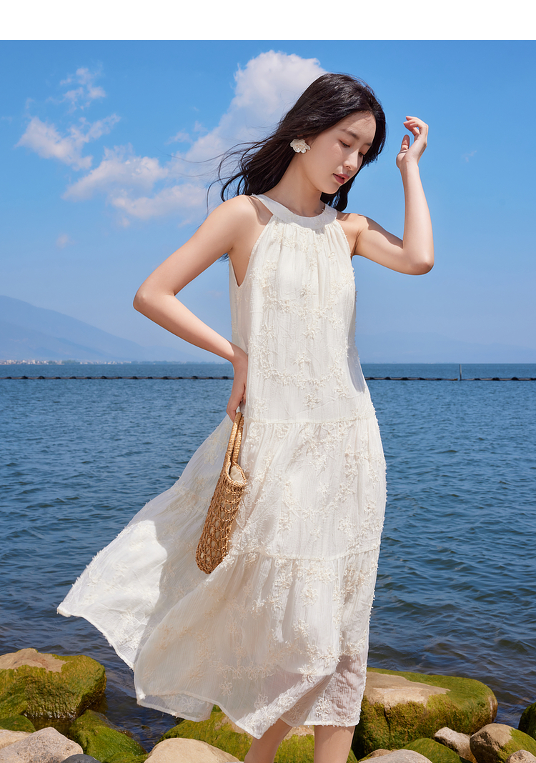 【专属特价】熙世界法式挂脖连衣裙2025夏天新款挖肩绣花度假风长裙天丝裙子