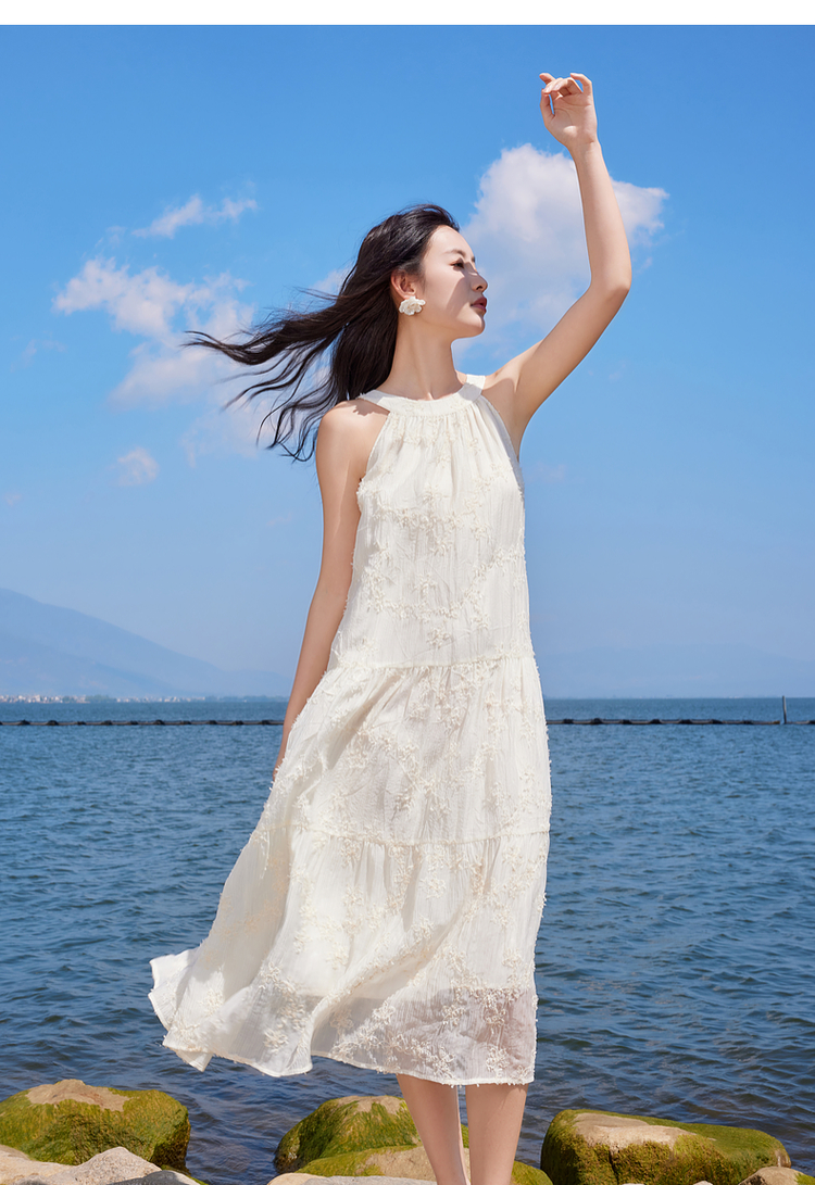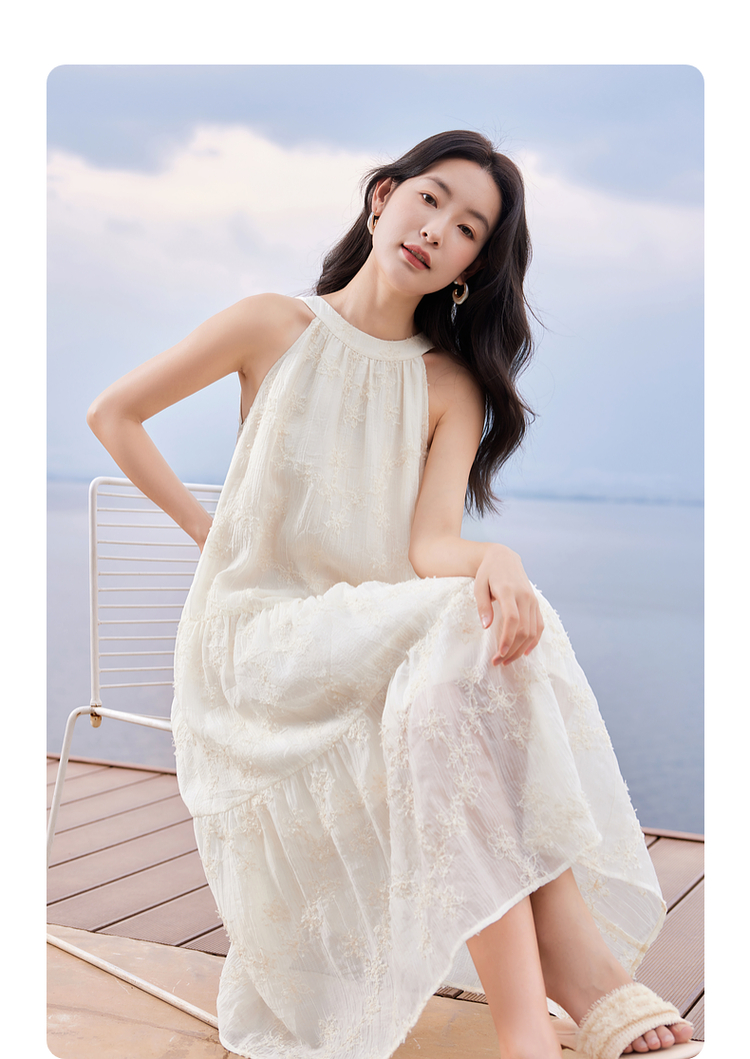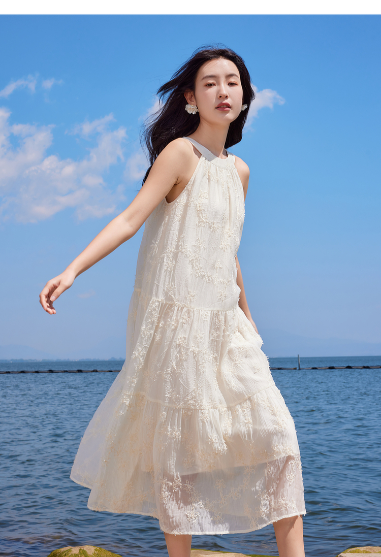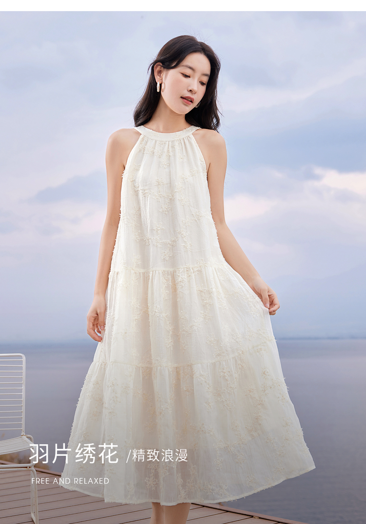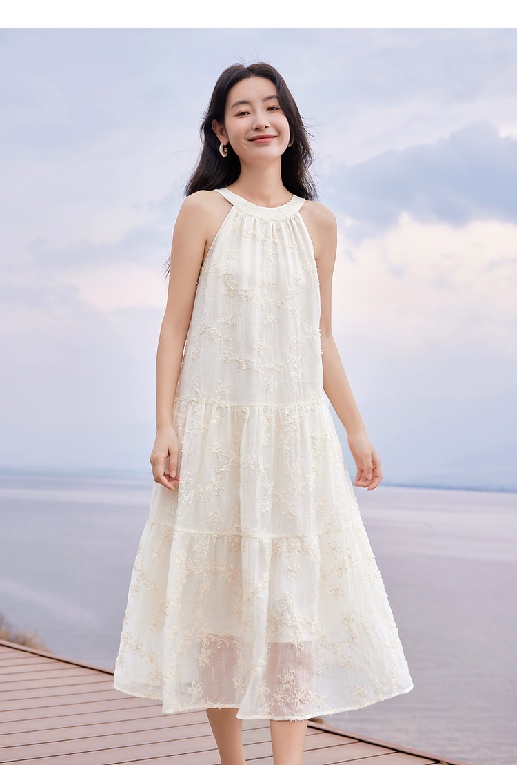 【专属特价】熙世界法式挂脖连衣裙2025夏天新款挖肩绣花度假风长裙天丝裙子