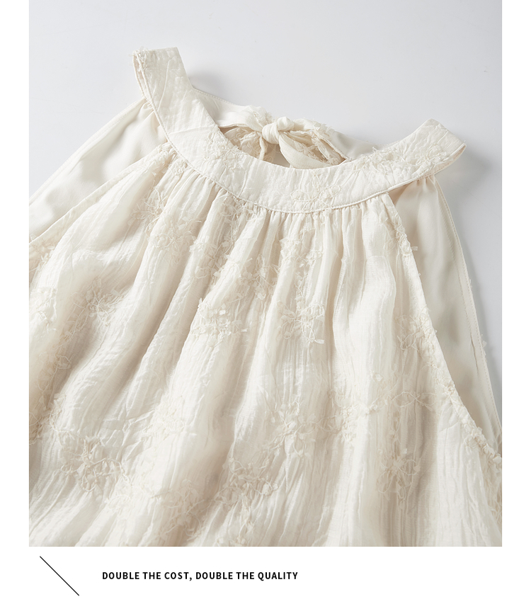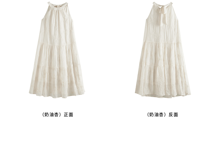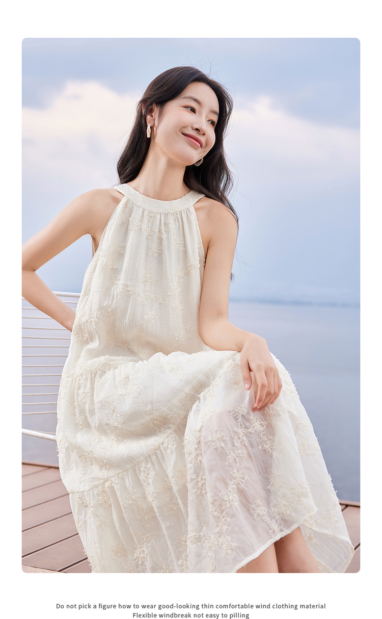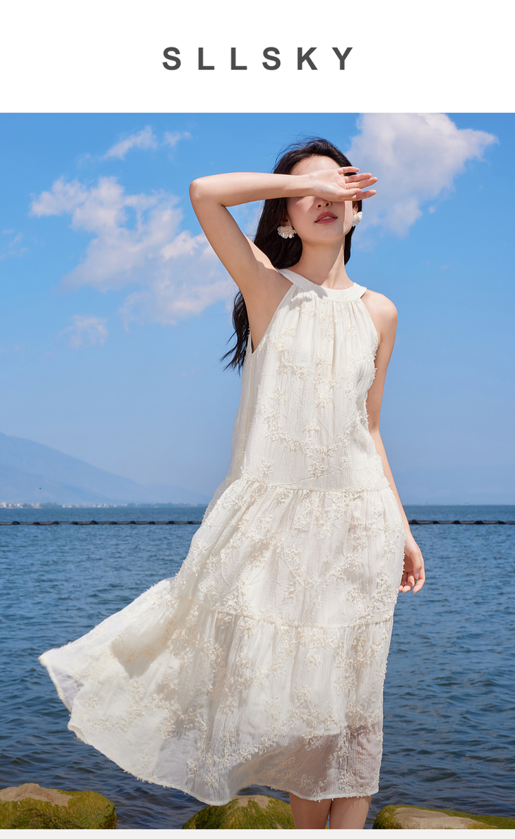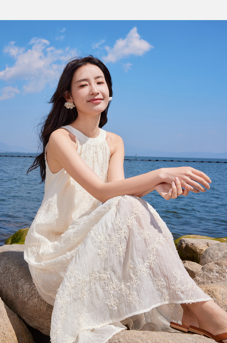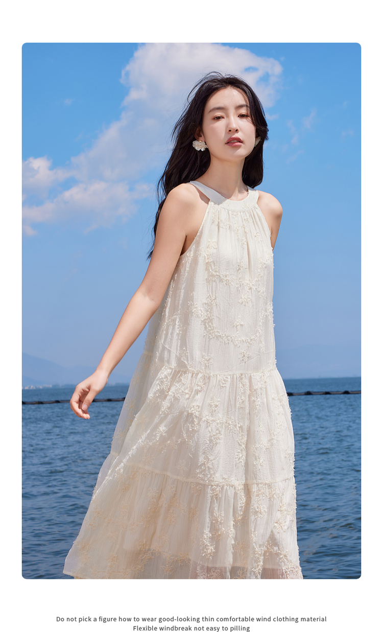 【专属特价】熙世界法式挂脖连衣裙2025夏天新款挖肩绣花度假风长裙天丝裙子