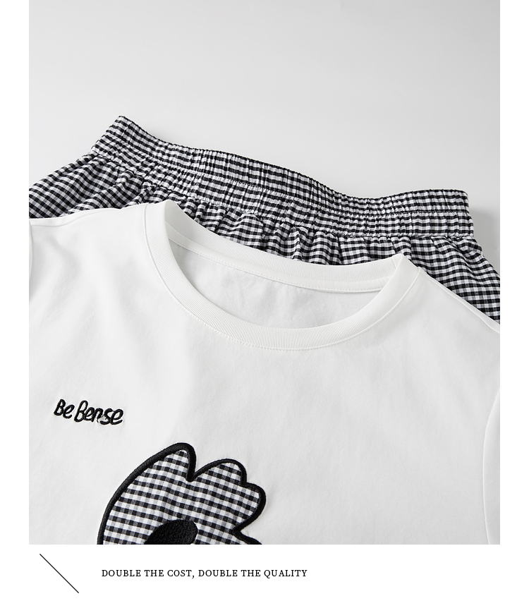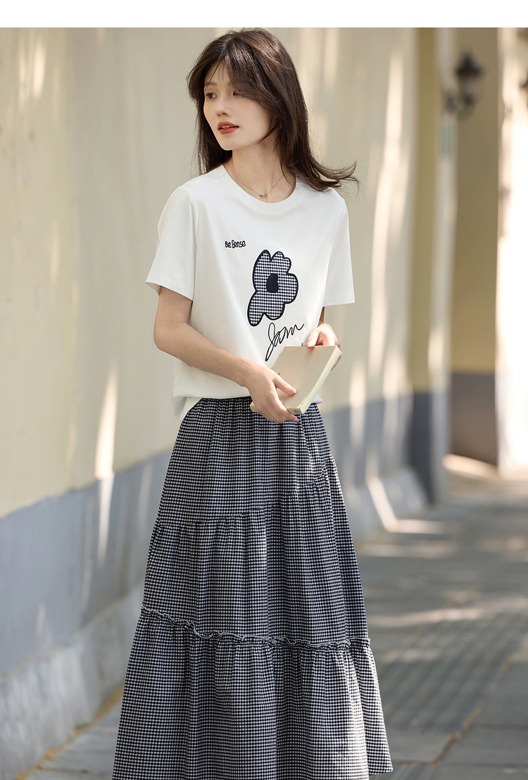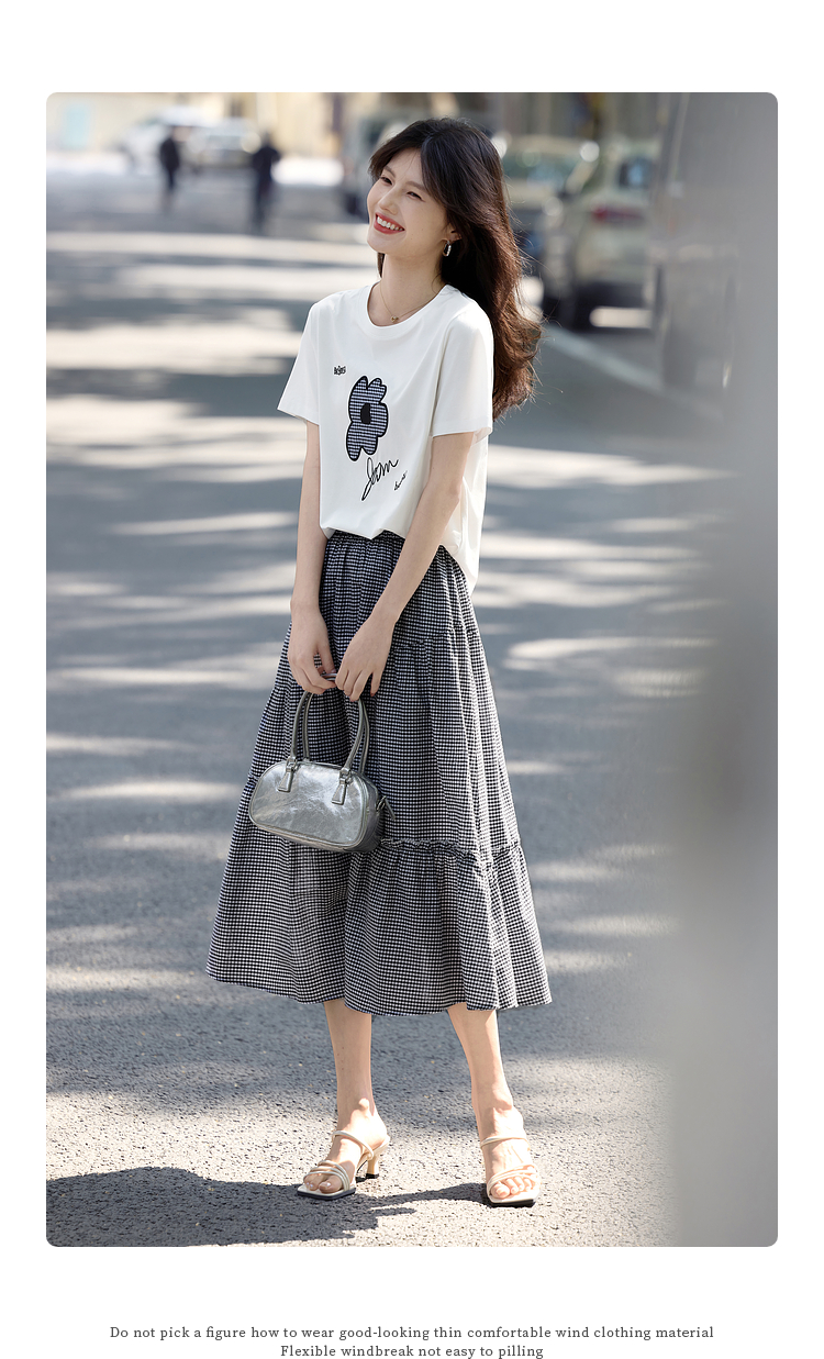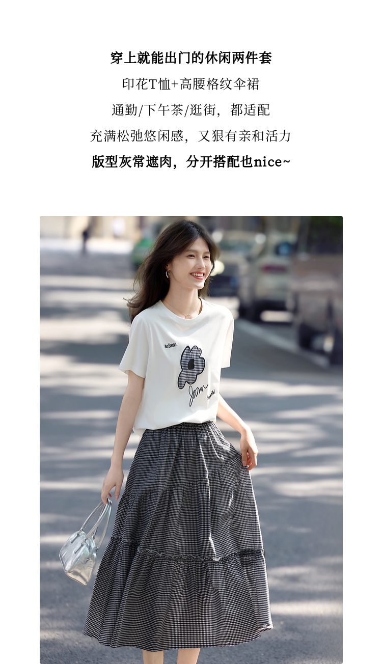 【专属特价】熙世界休闲减龄套装女2025新款印花短袖T恤高腰格纹半身裙两件套