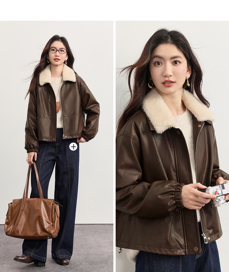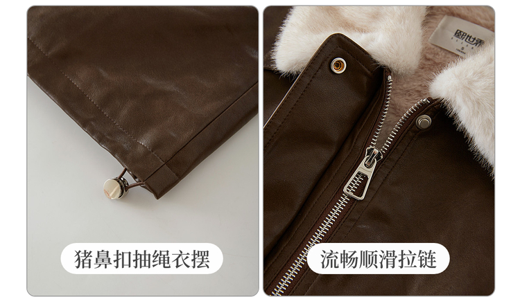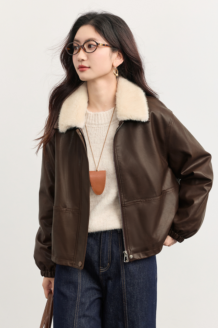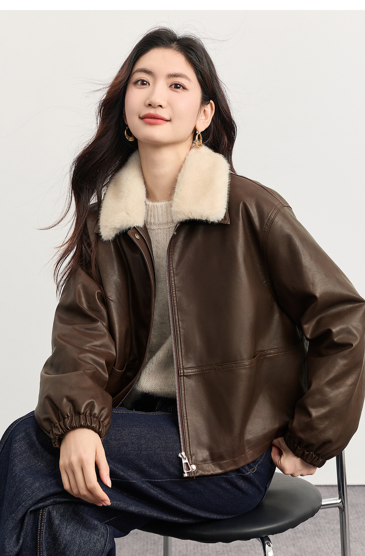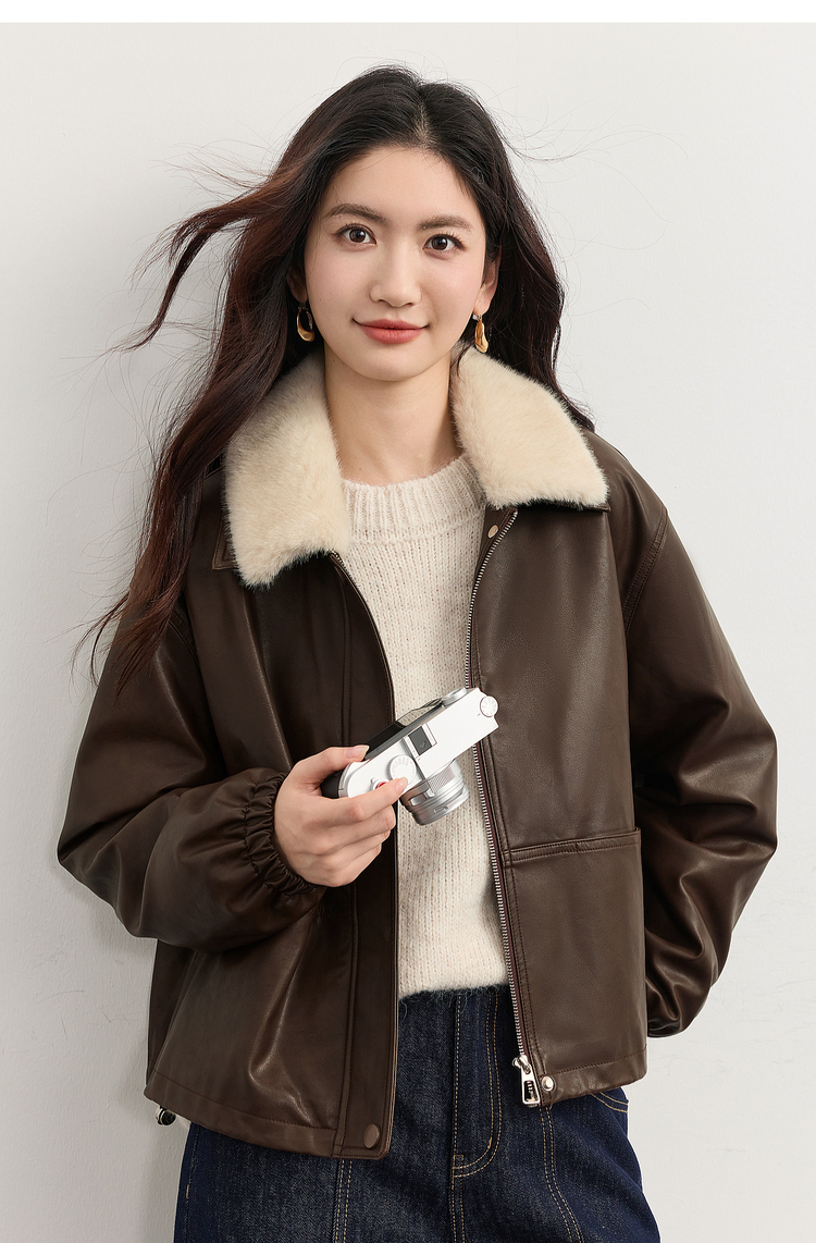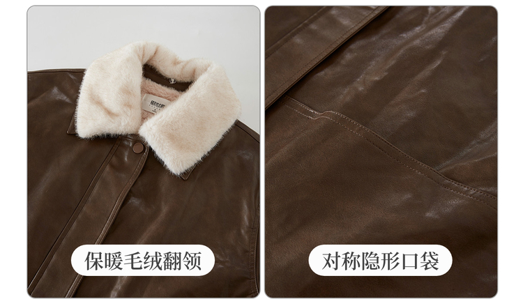 【11/19新品】熙世界酷飒风复古棕色皮衣女冬季2025新款加厚夹棉毛绒翻领短外套