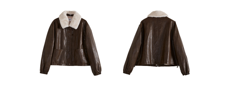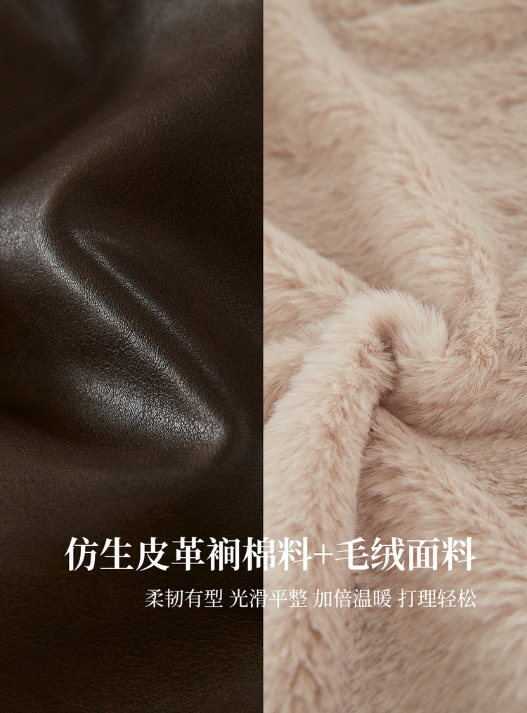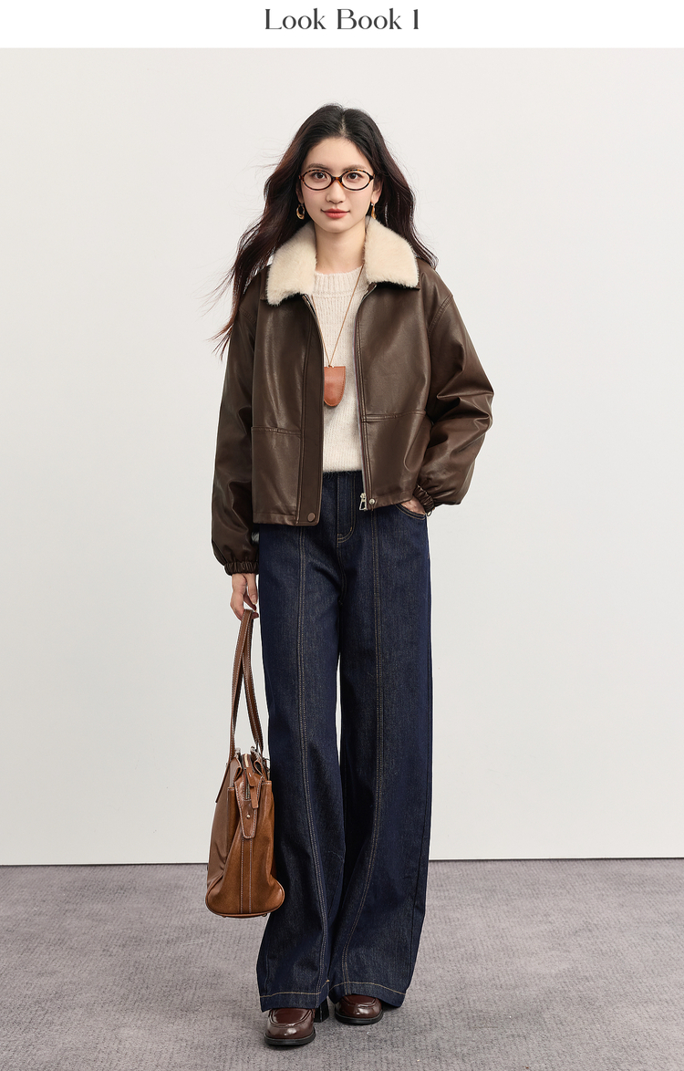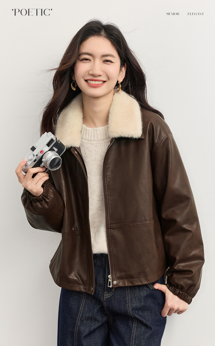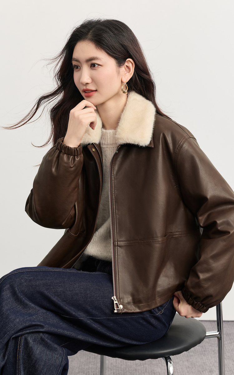 【11/19新品】熙世界酷飒风复古棕色皮衣女冬季2025新款加厚夹棉毛绒翻领短外套