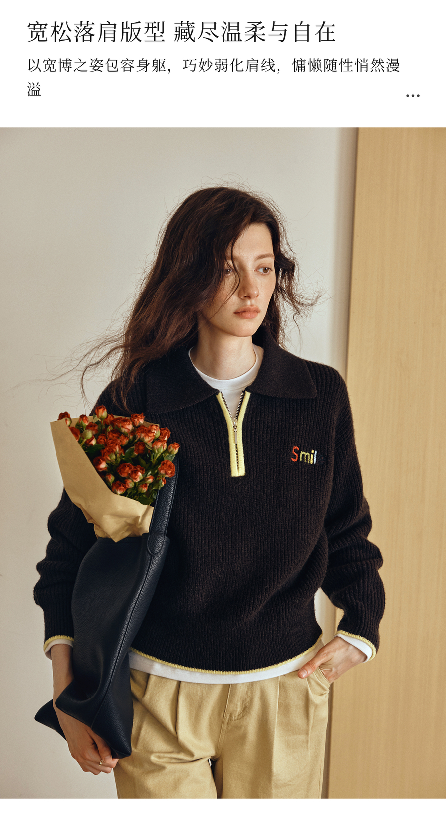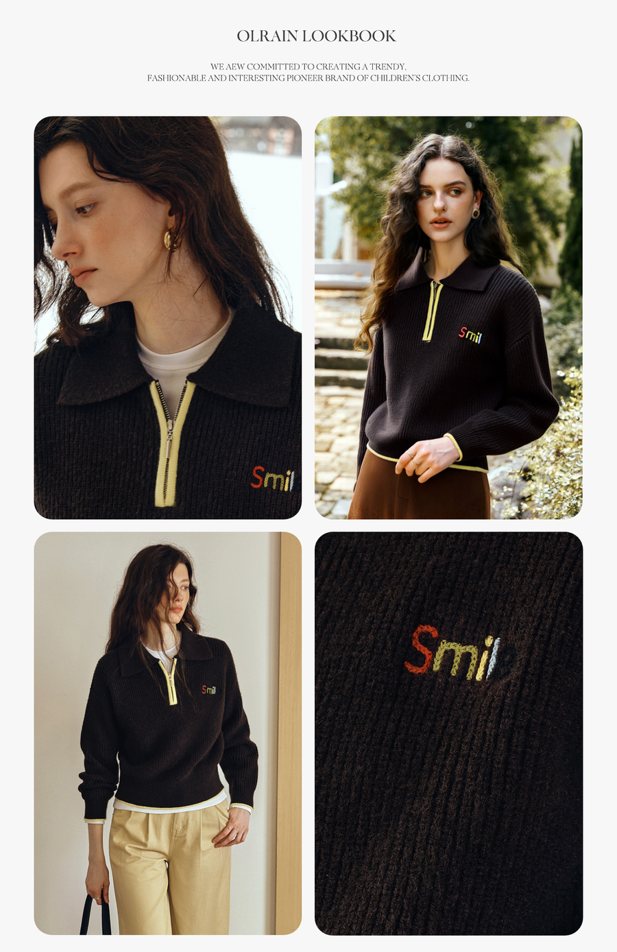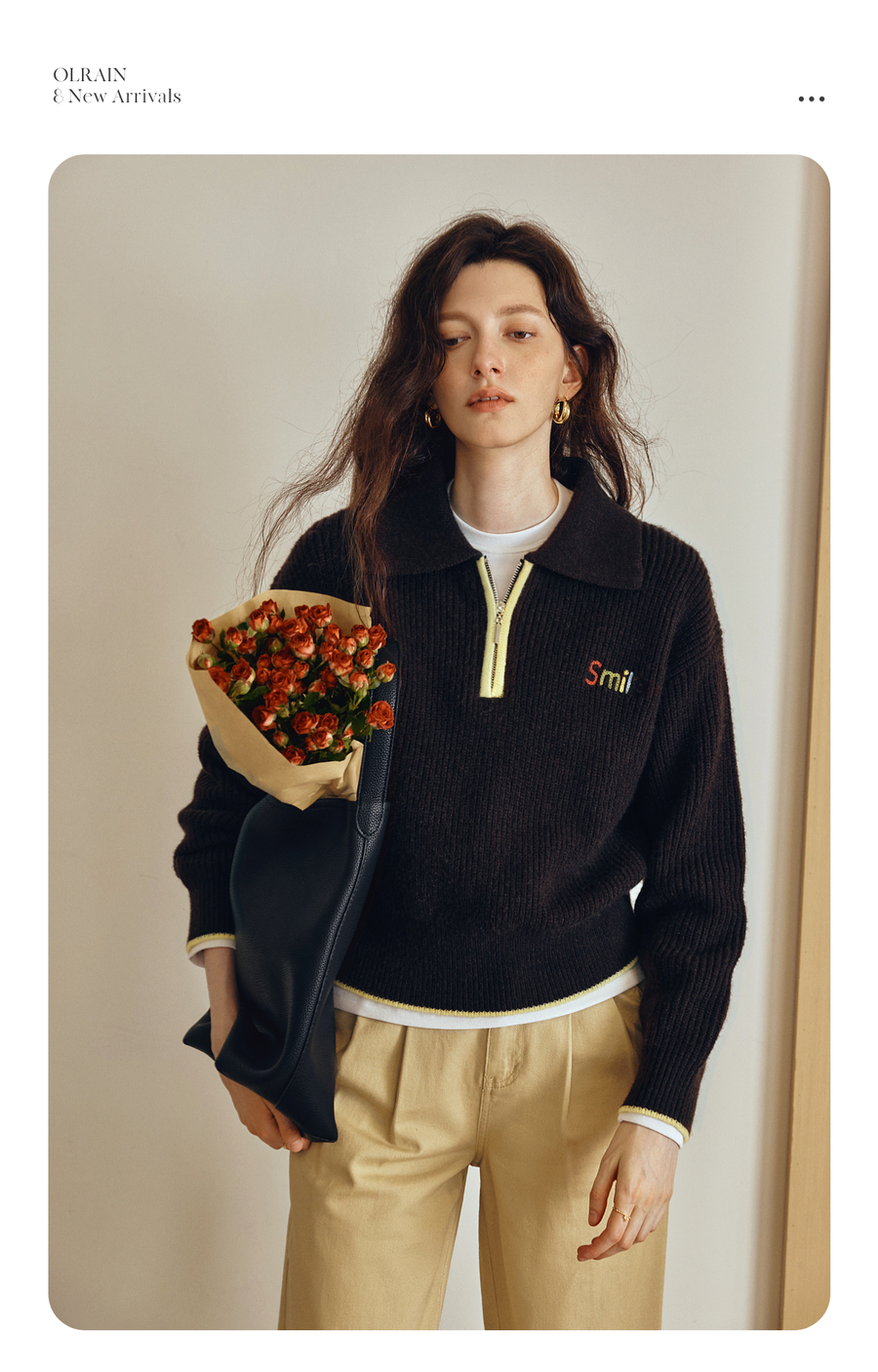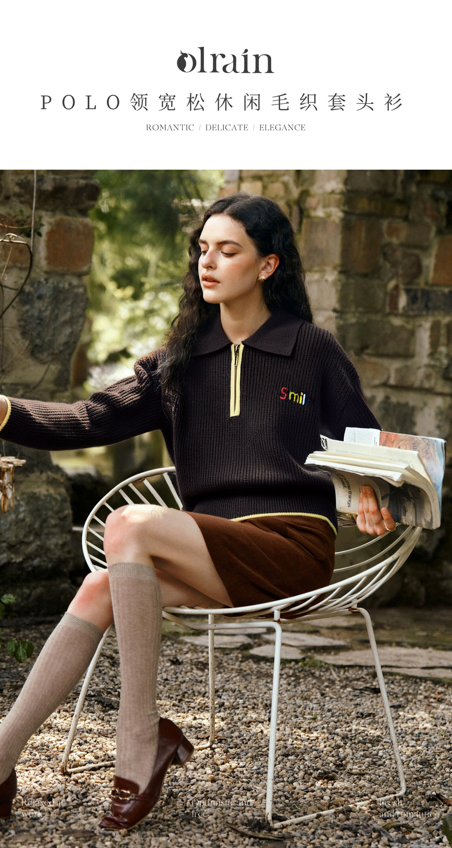 OLrain欧芮儿2025新款女秋季POLO领宽松休闲毛织套头衫宽松上衣