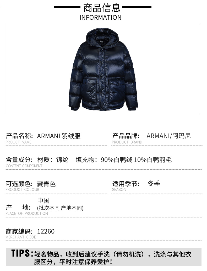 【超惠秒】Armani EA7 男士加绒加厚巨保暖 90白鹅绒 连帽羽绒服外套 12260
