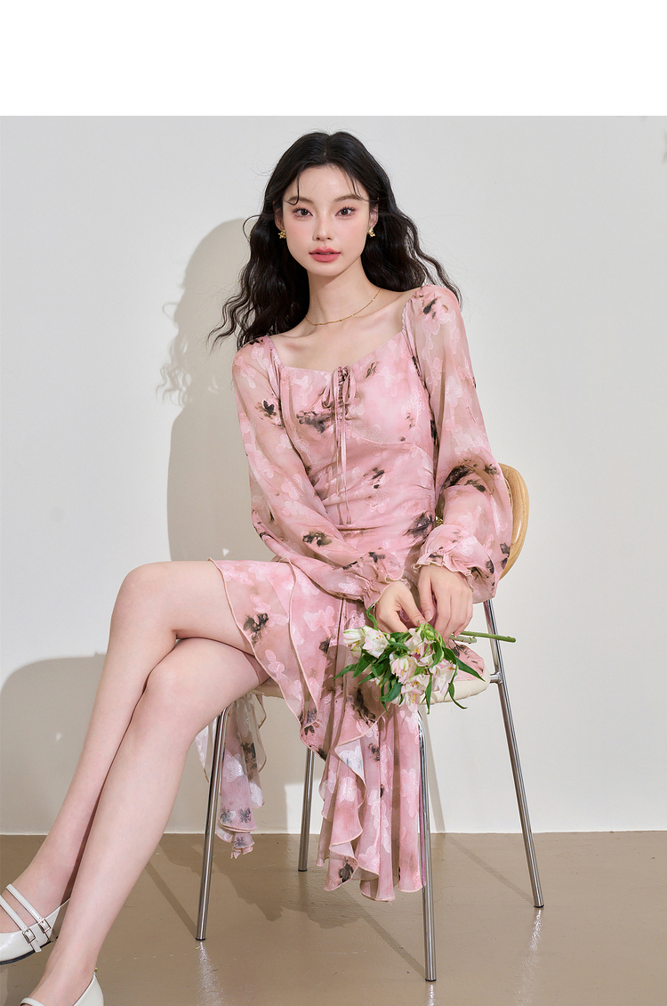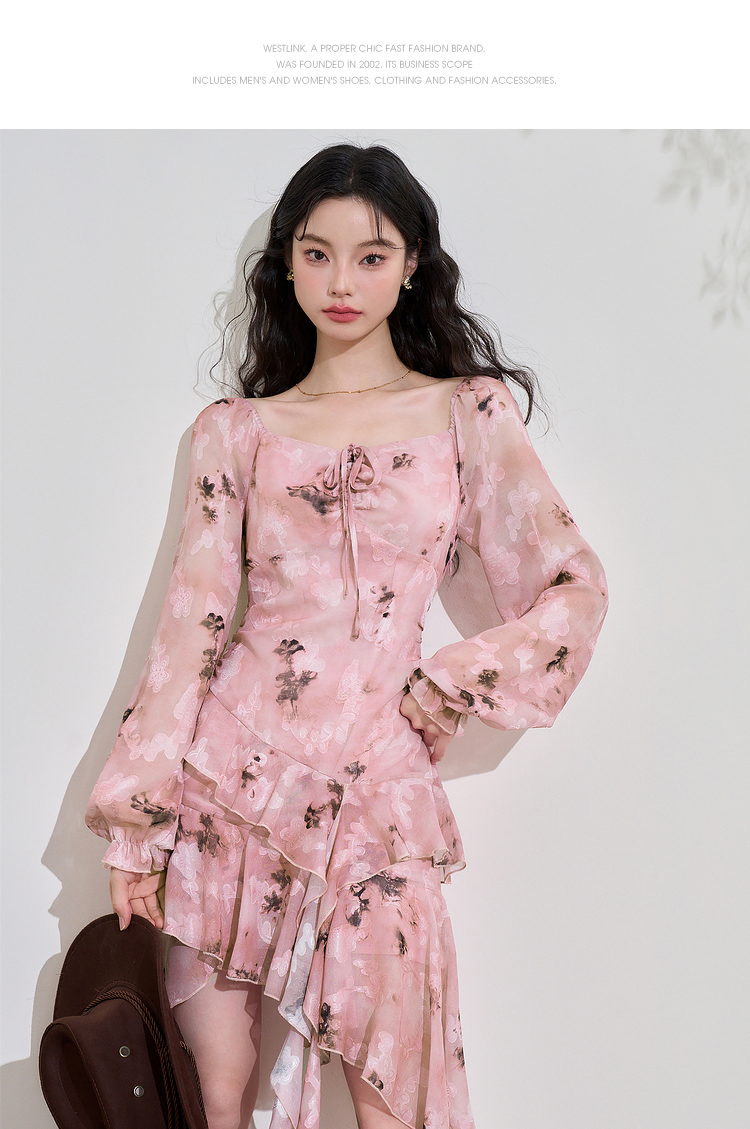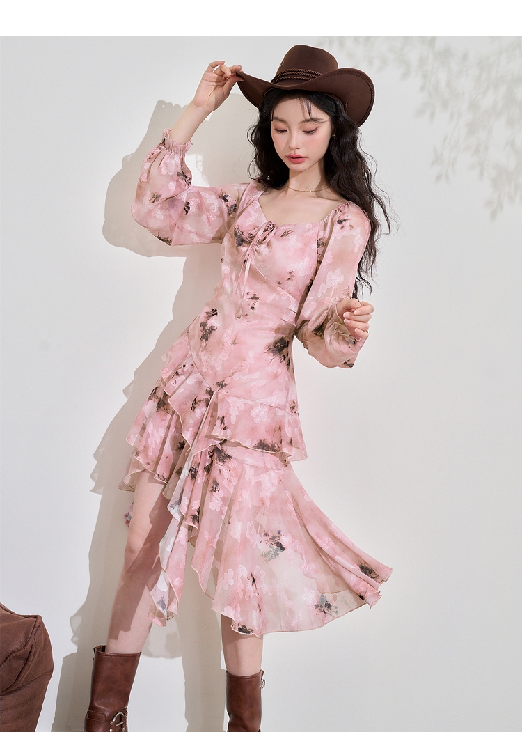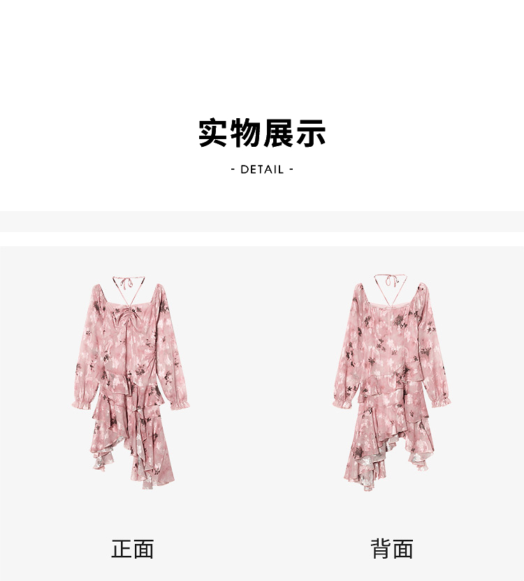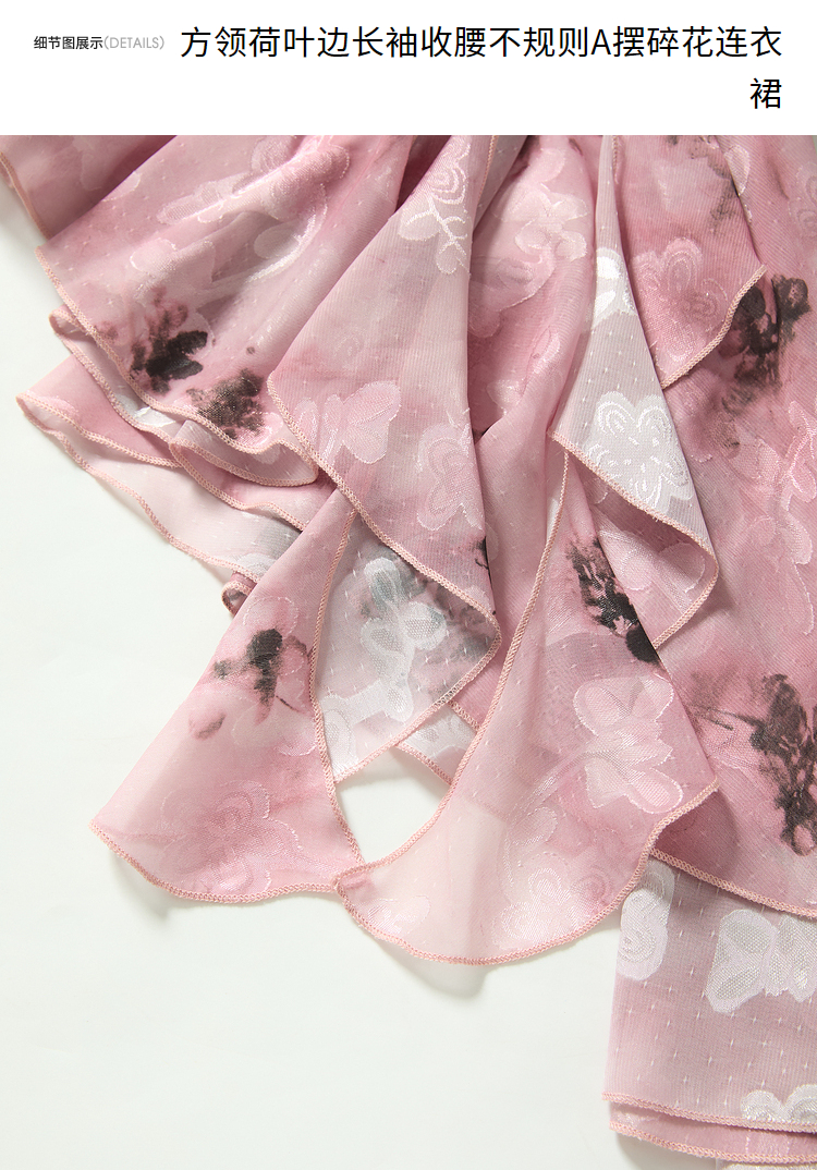 甜美荷叶边长袖碎花连衣裙女早春方领收腰不规则A摆短裙V3242338