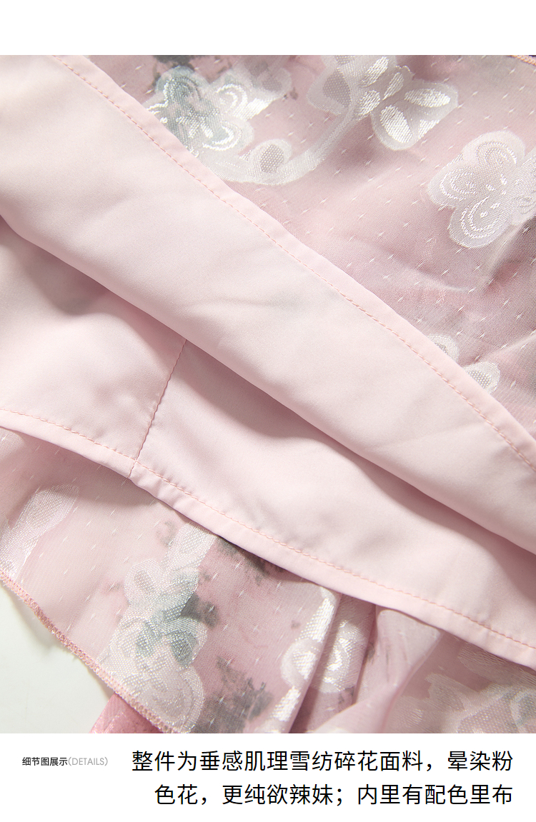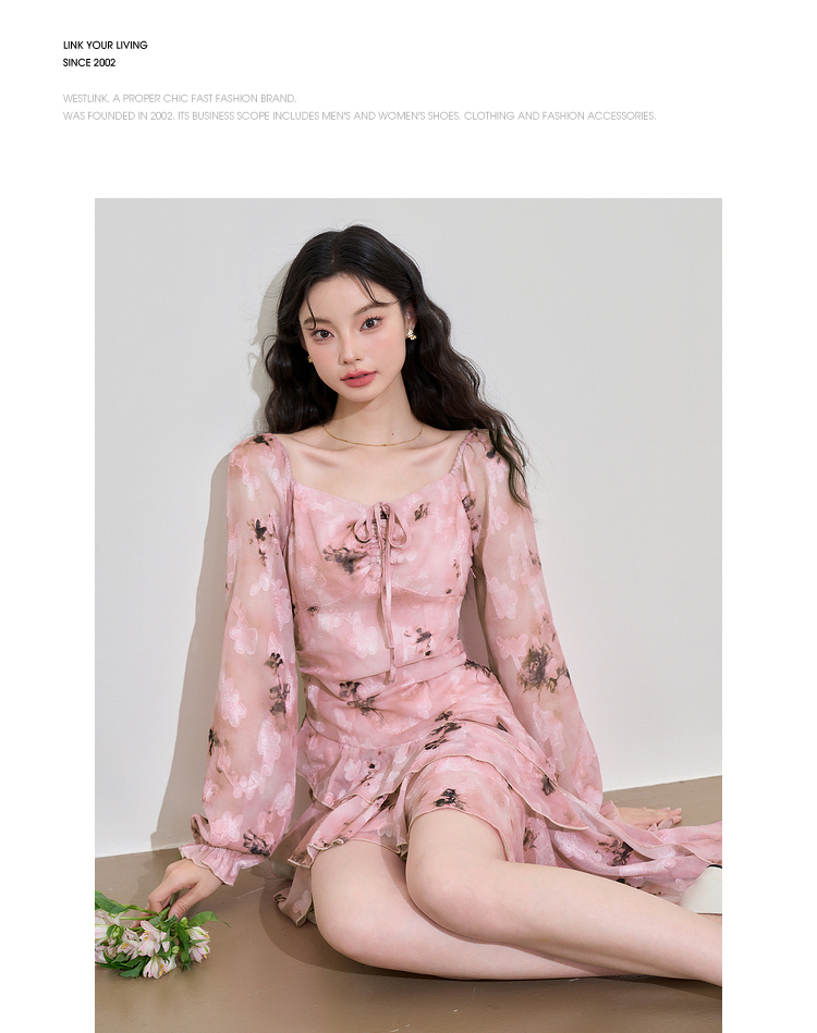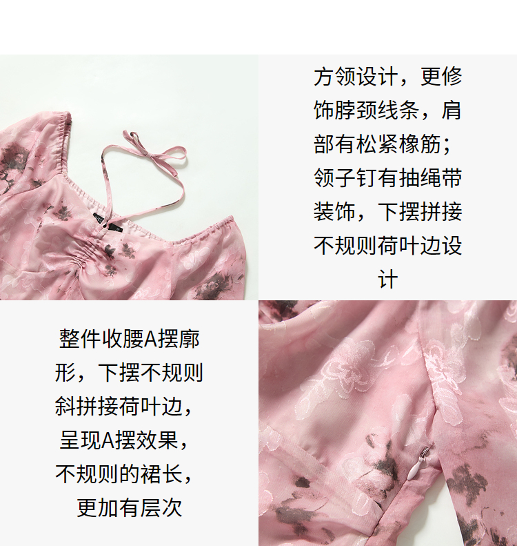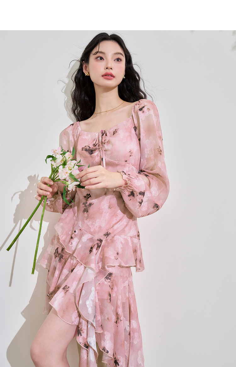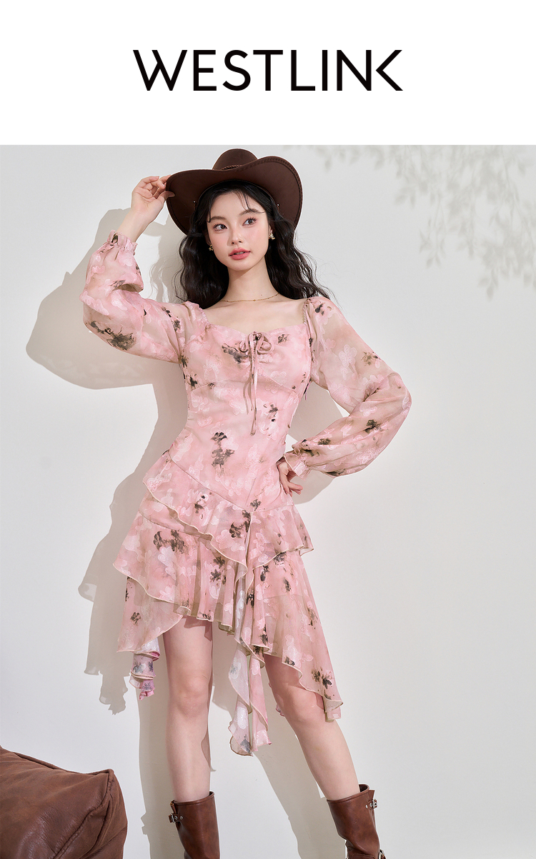 甜美荷叶边长袖碎花连衣裙女早春方领收腰不规则A摆短裙V3242338