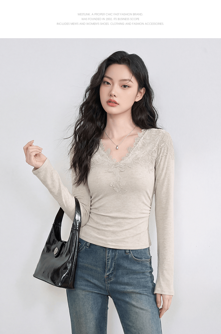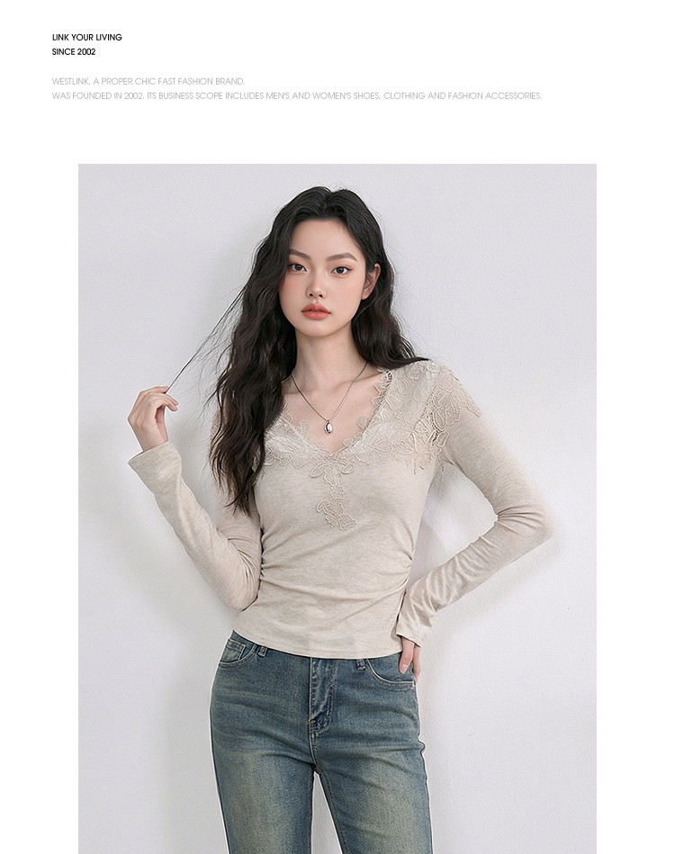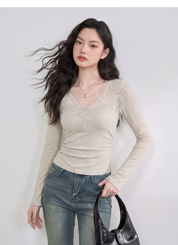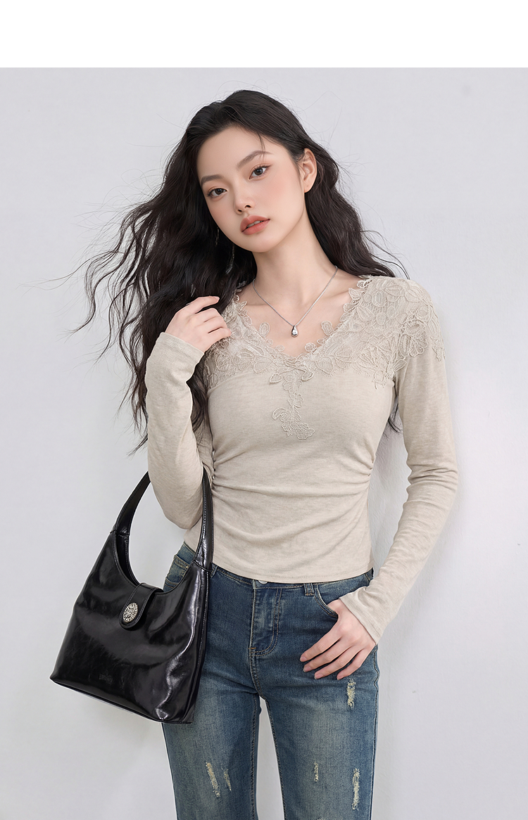 西遇法式蕾丝v领长袖T恤女2026年春季新款掐腰修身显瘦内搭打底衫E0060130