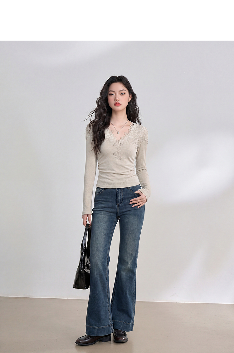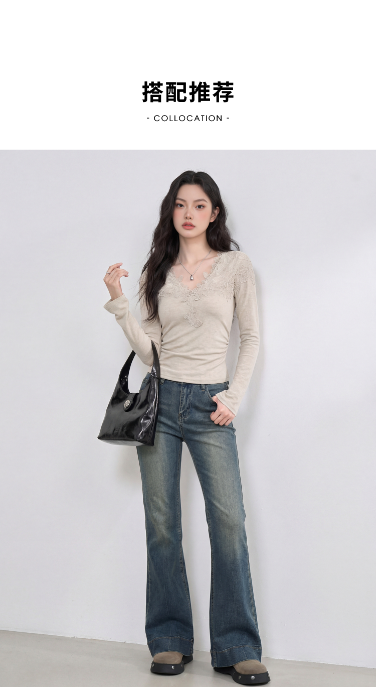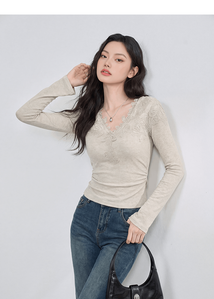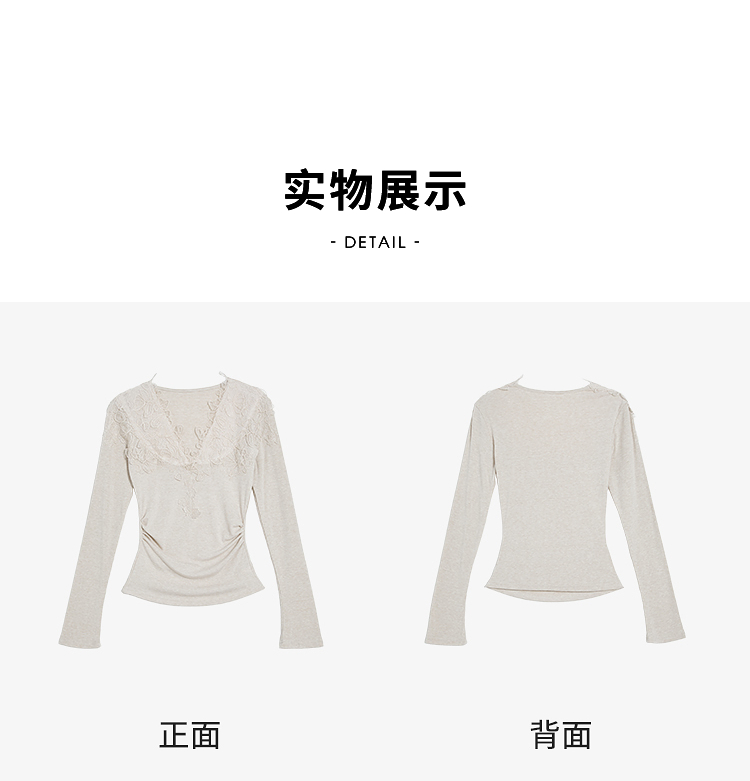 西遇法式蕾丝v领长袖T恤女2026年春季新款掐腰修身显瘦内搭打底衫E0060130