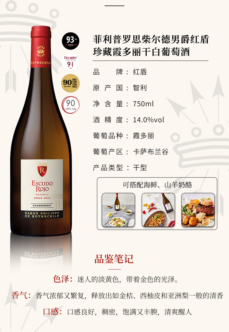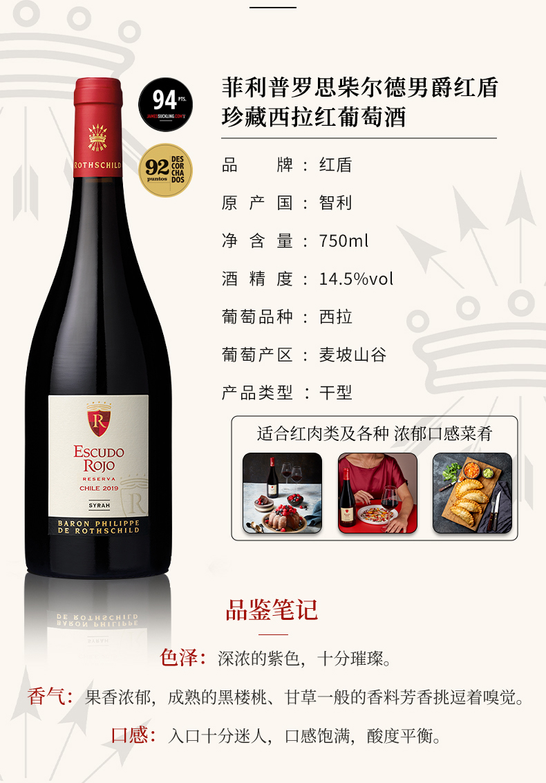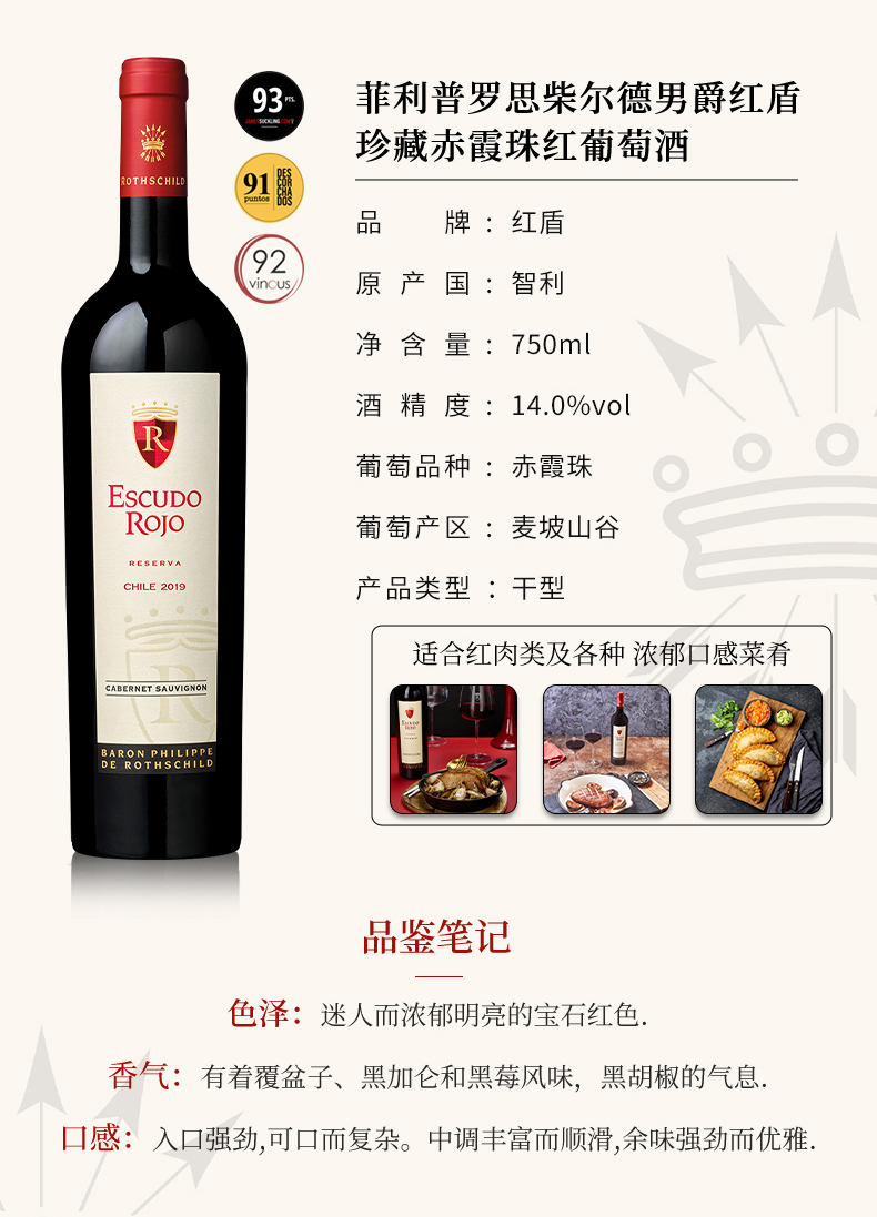 智利Escudo Rojo Reserva菲利普罗思柴尔德男爵红盾干红葡萄酒750ml