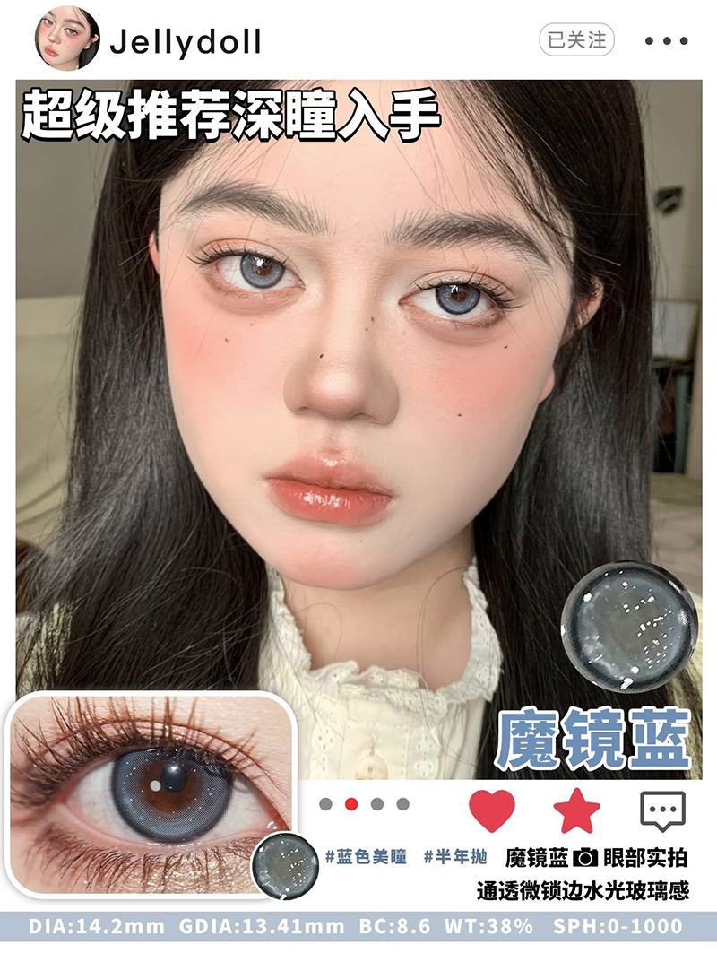 Jellydoll 魔镜蓝 半年抛 两片 14.2mm 参考着色13.4mm 基弧8.6 含水38% 新锐国货