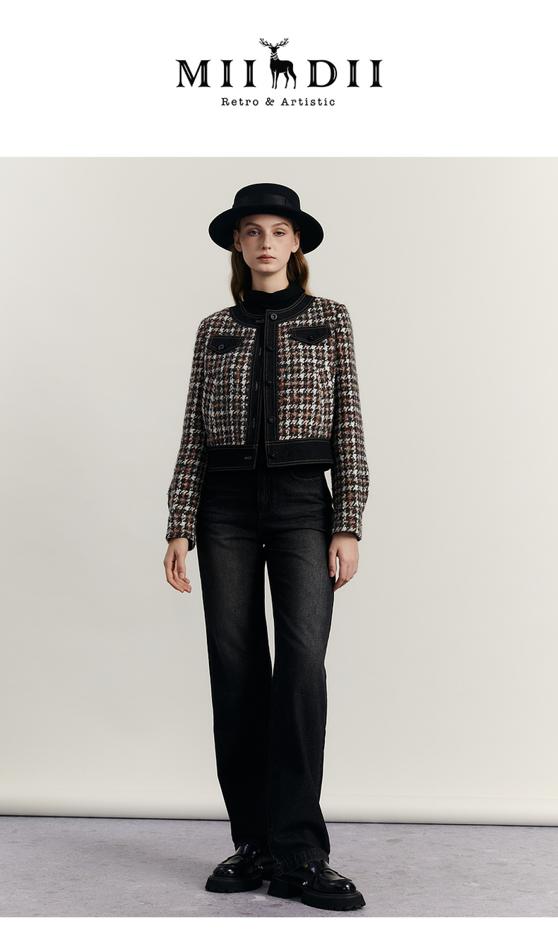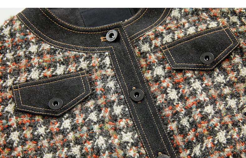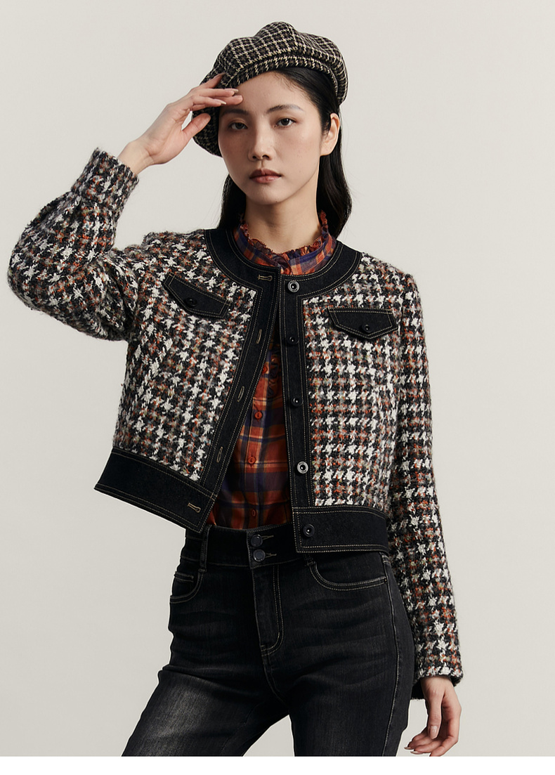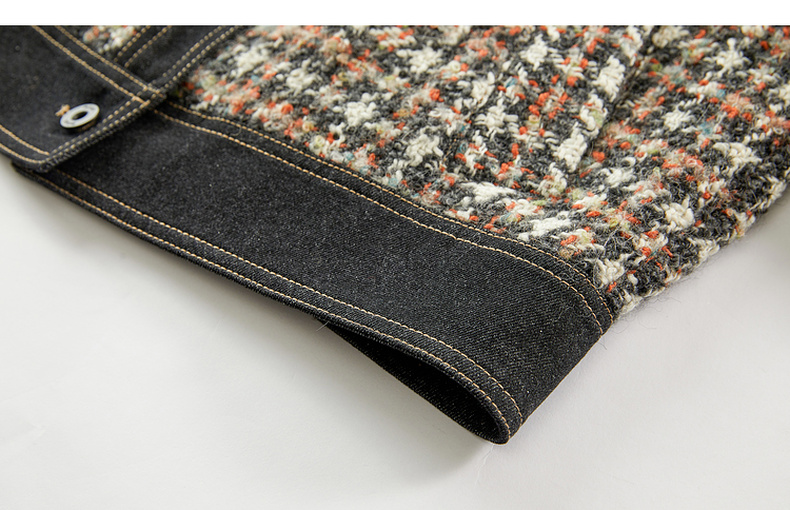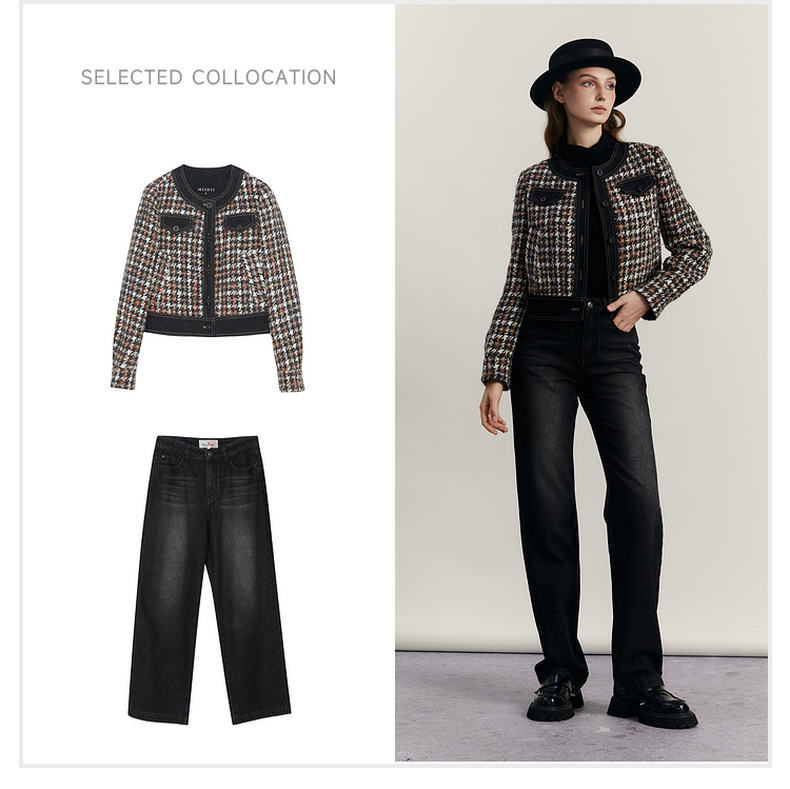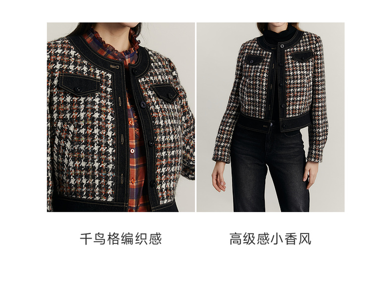 谜底小香风毛呢外套女2023冬季新品时尚拼接短款粗花呢234MW1512