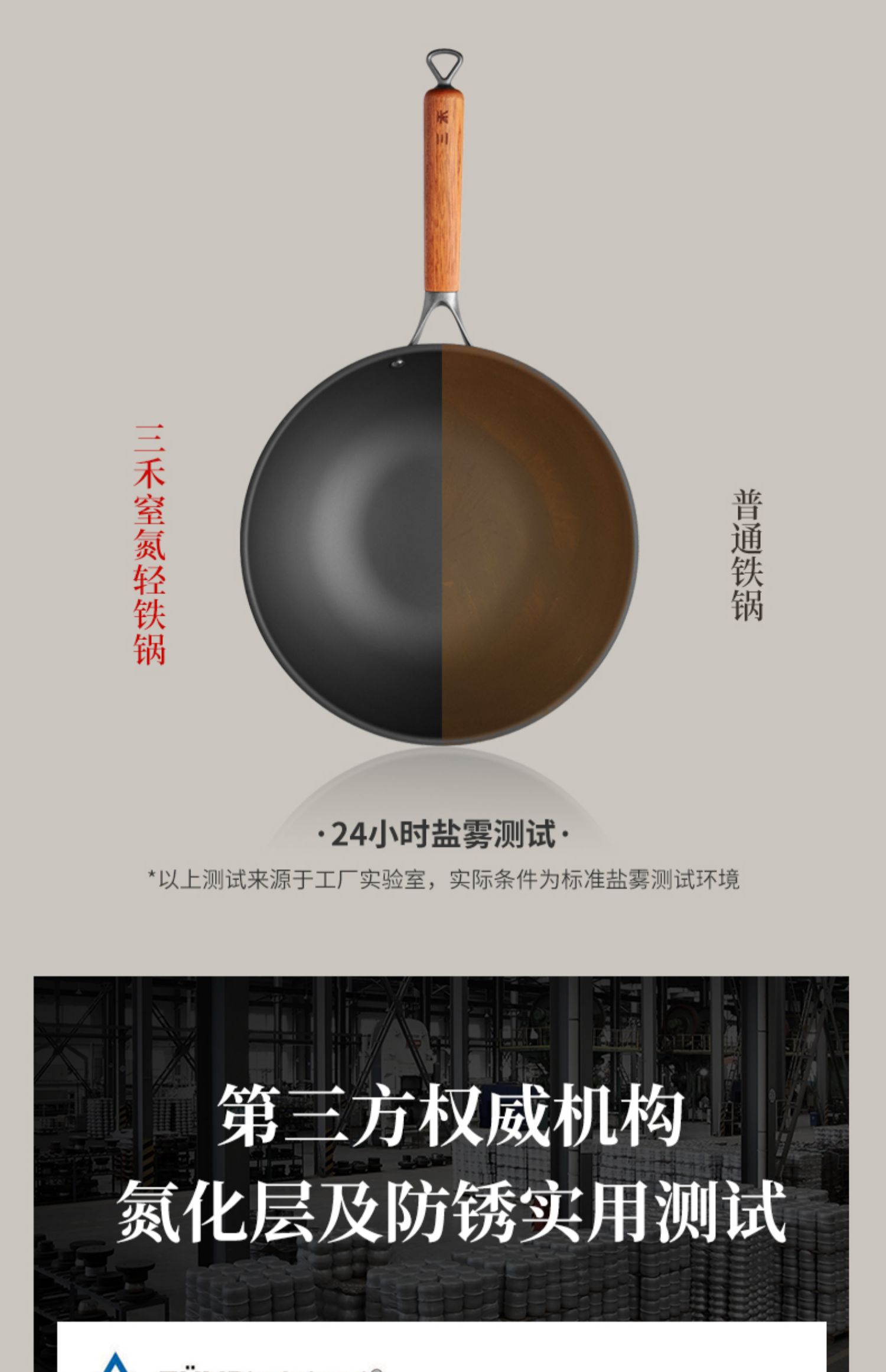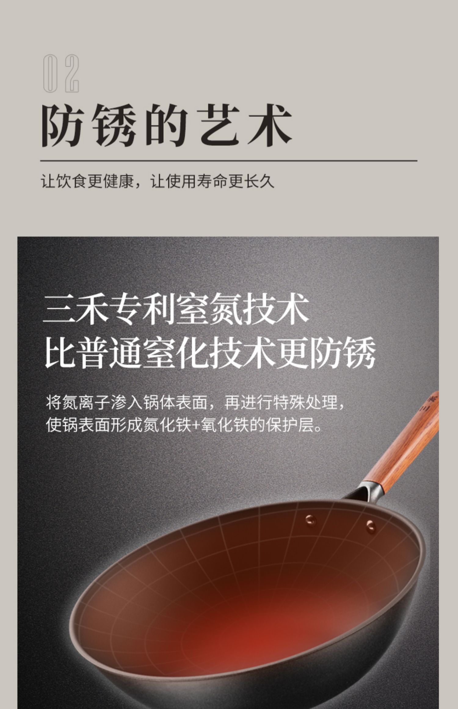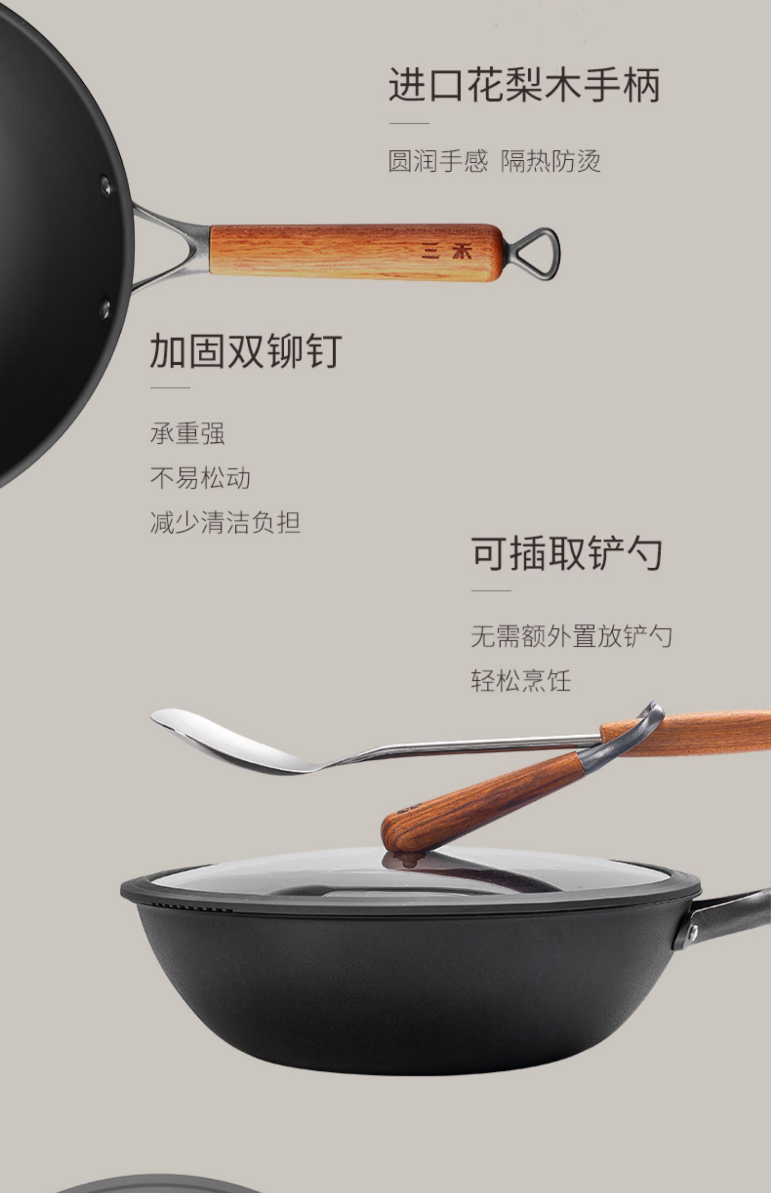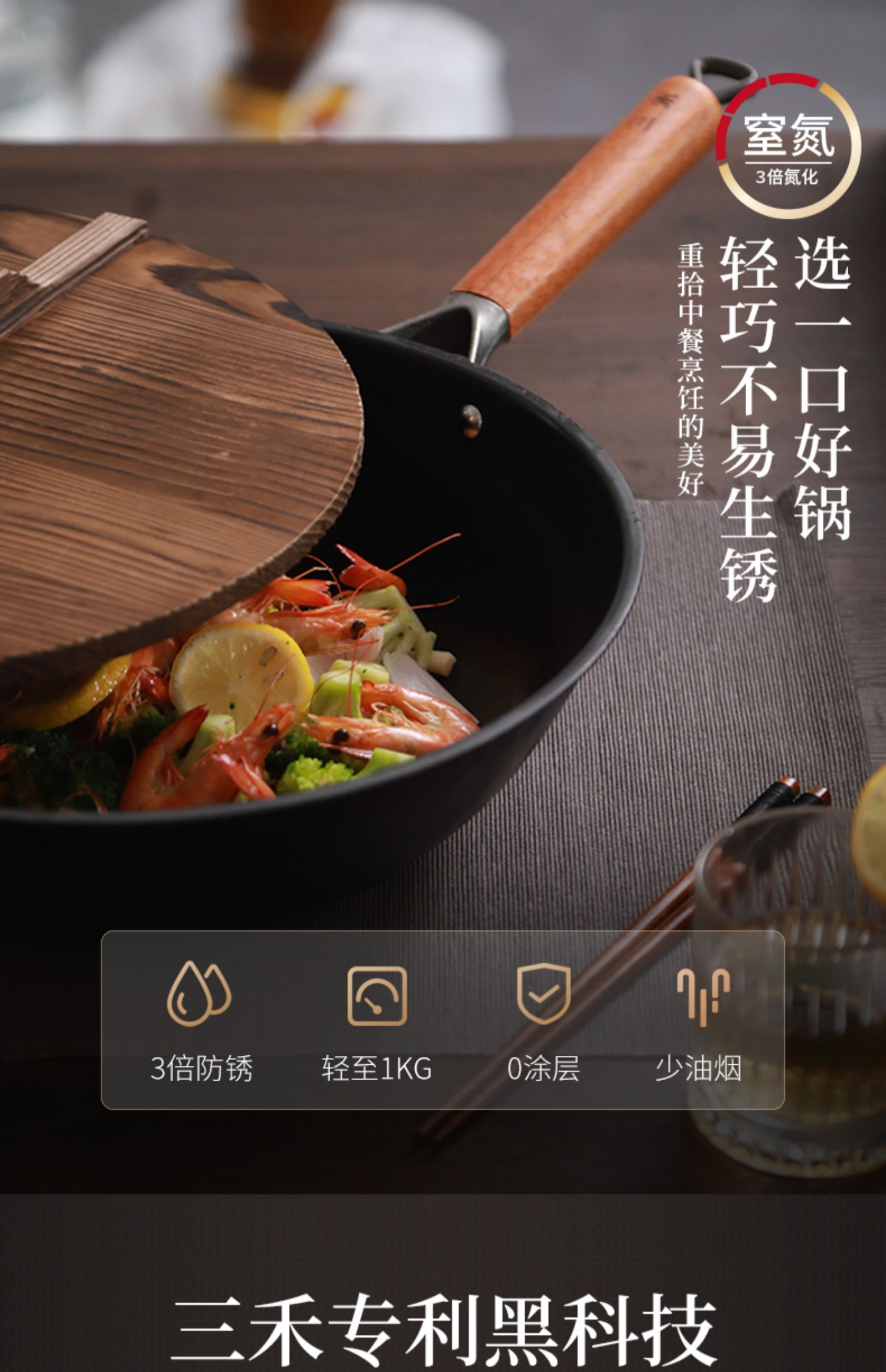 三禾窒氮轻铁锅 无涂层平底锅 燃气灶专用 老式炒菜轻铁锅 3倍防锈 不粘0油烟 轻重设计 不怕刮划 梨花木手柄