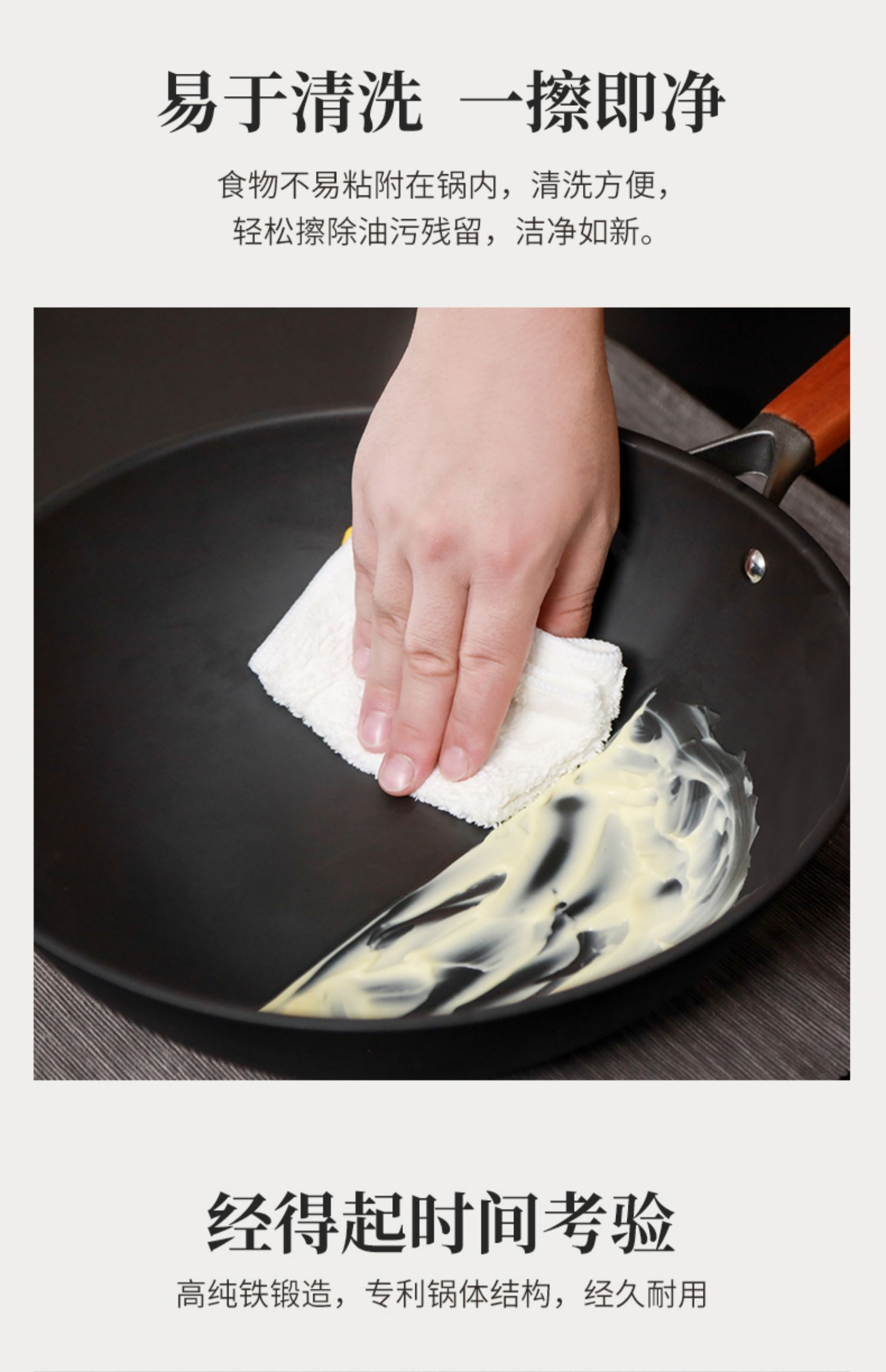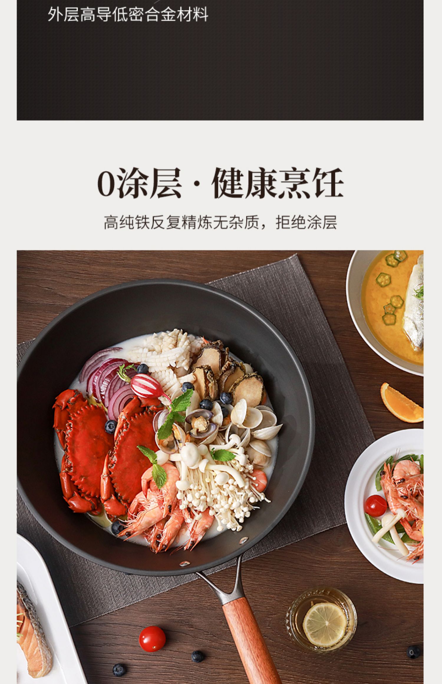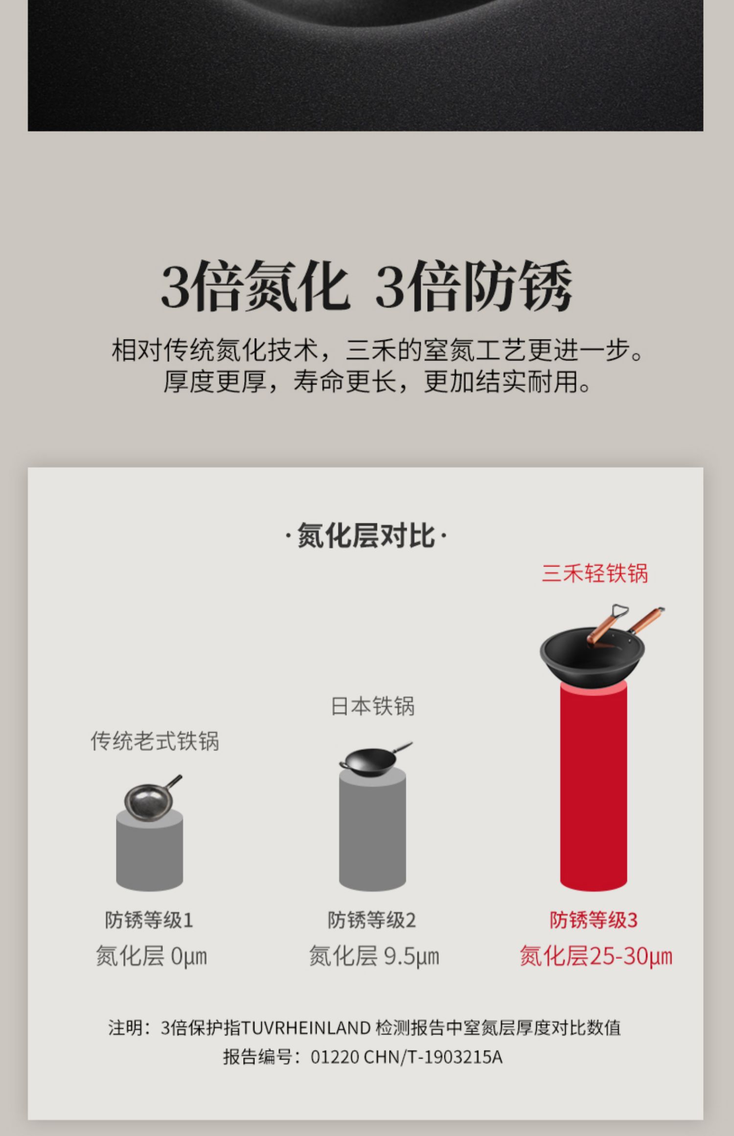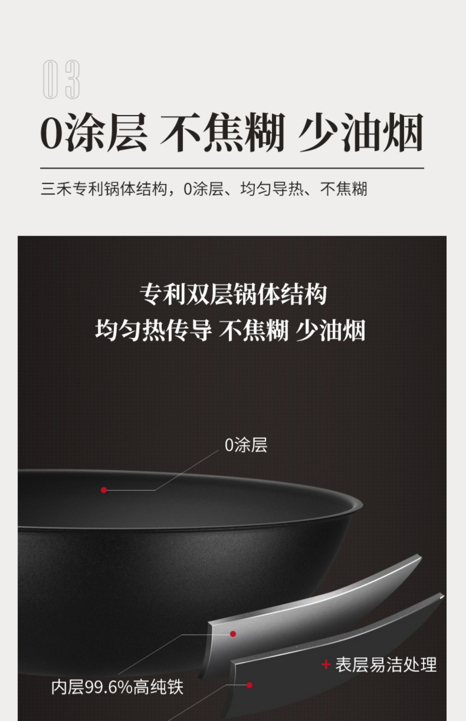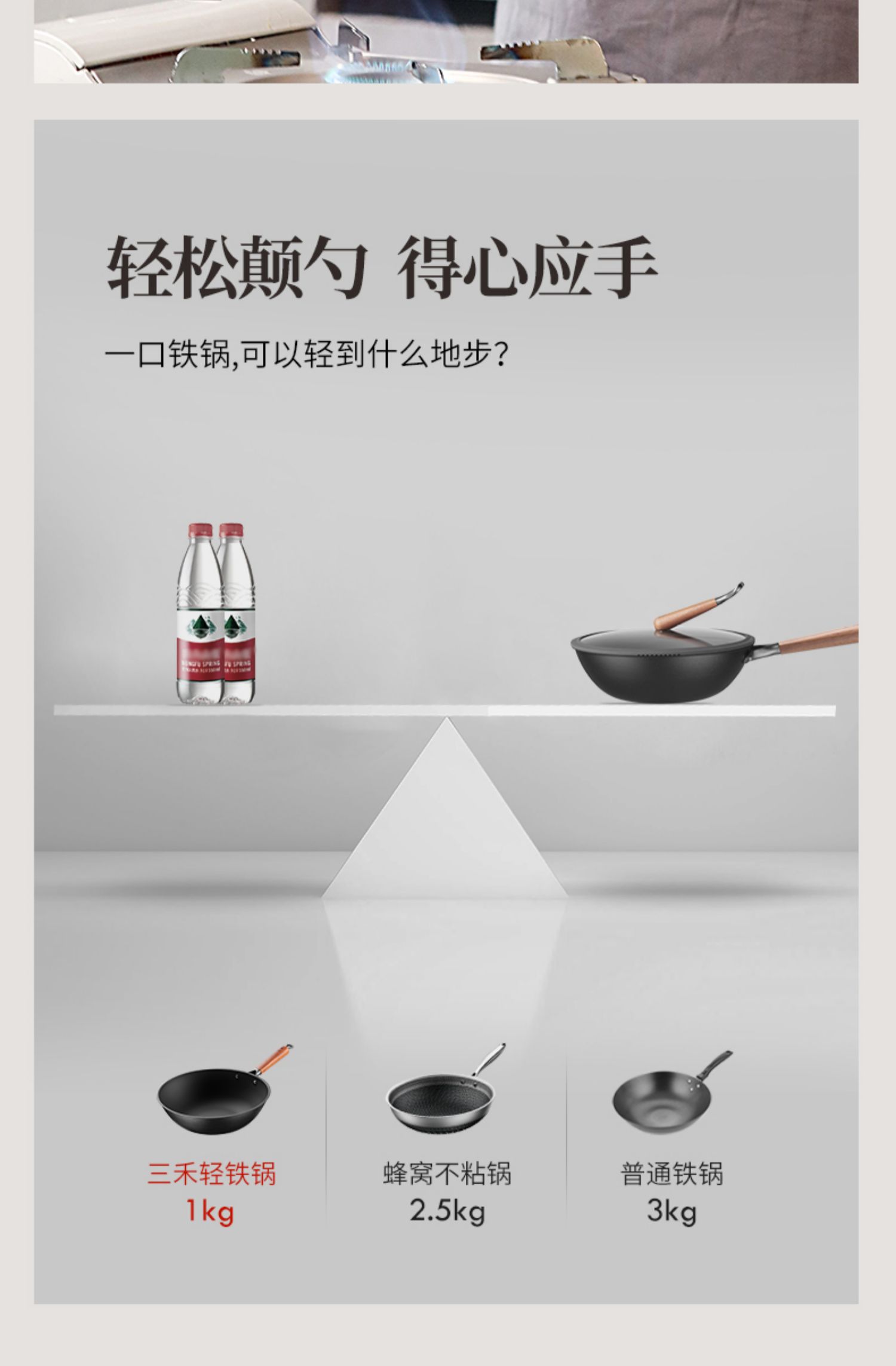 三禾窒氮轻铁锅 无涂层平底锅 燃气灶专用 老式炒菜轻铁锅 3倍防锈 不粘0油烟 轻重设计 不怕刮划 梨花木手柄