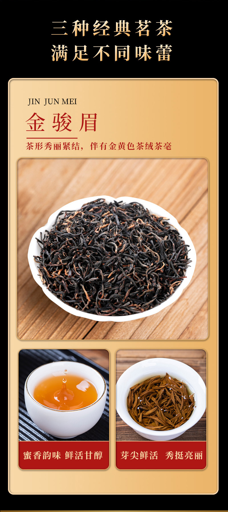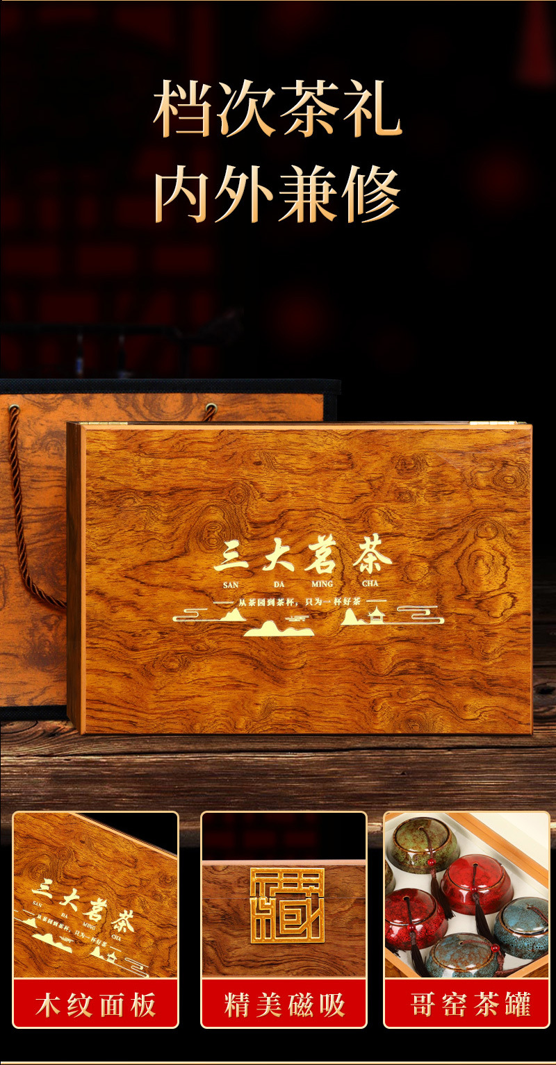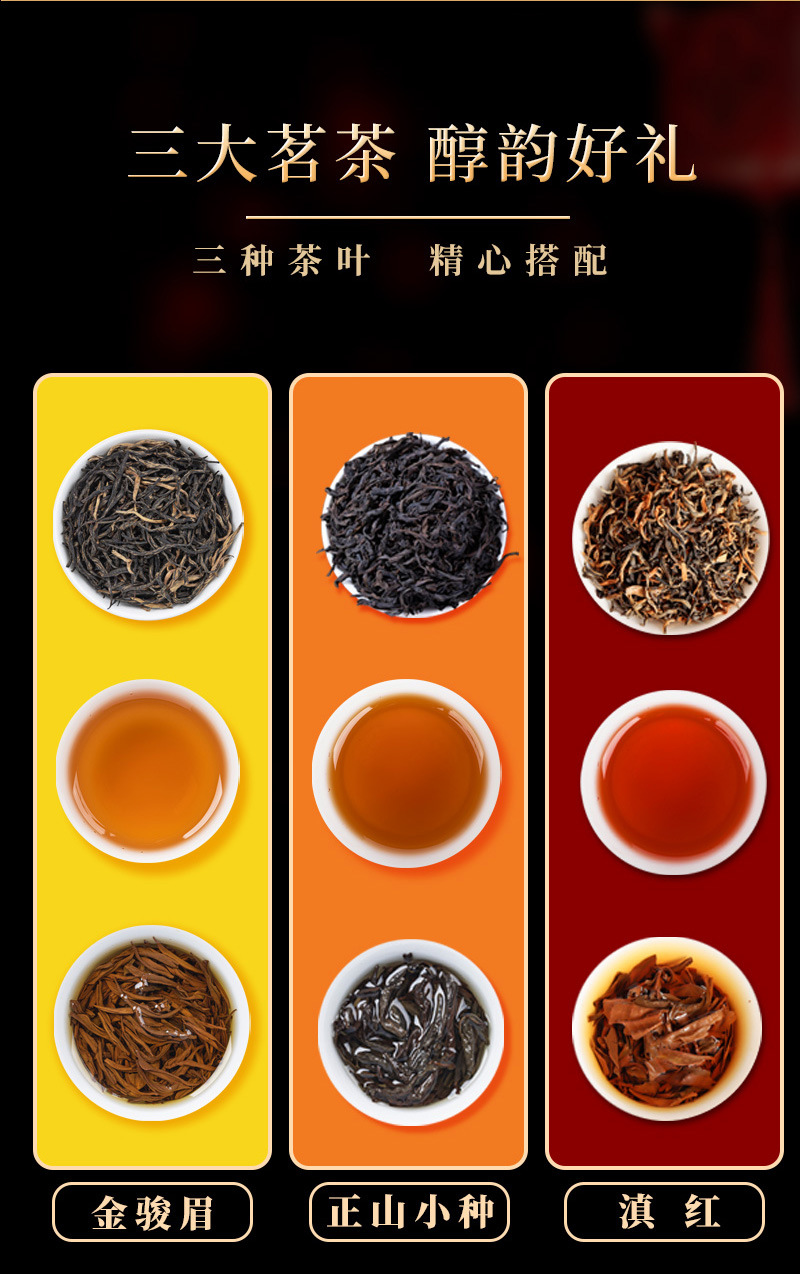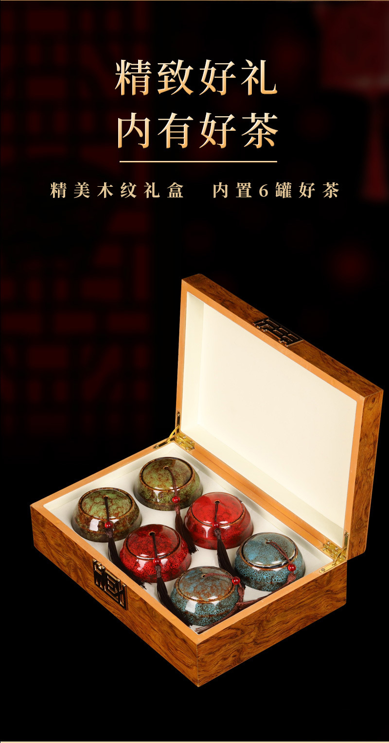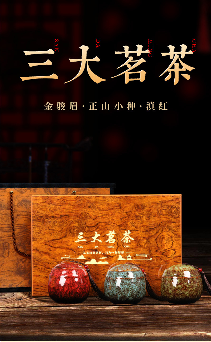 【礼盒装!三大茗茶】6陶瓷罐木盒茶叶礼盒装金骏眉红茶滇红正山小种中秋送礼,紧细匀整锋苗显秀色泽乌润。ry