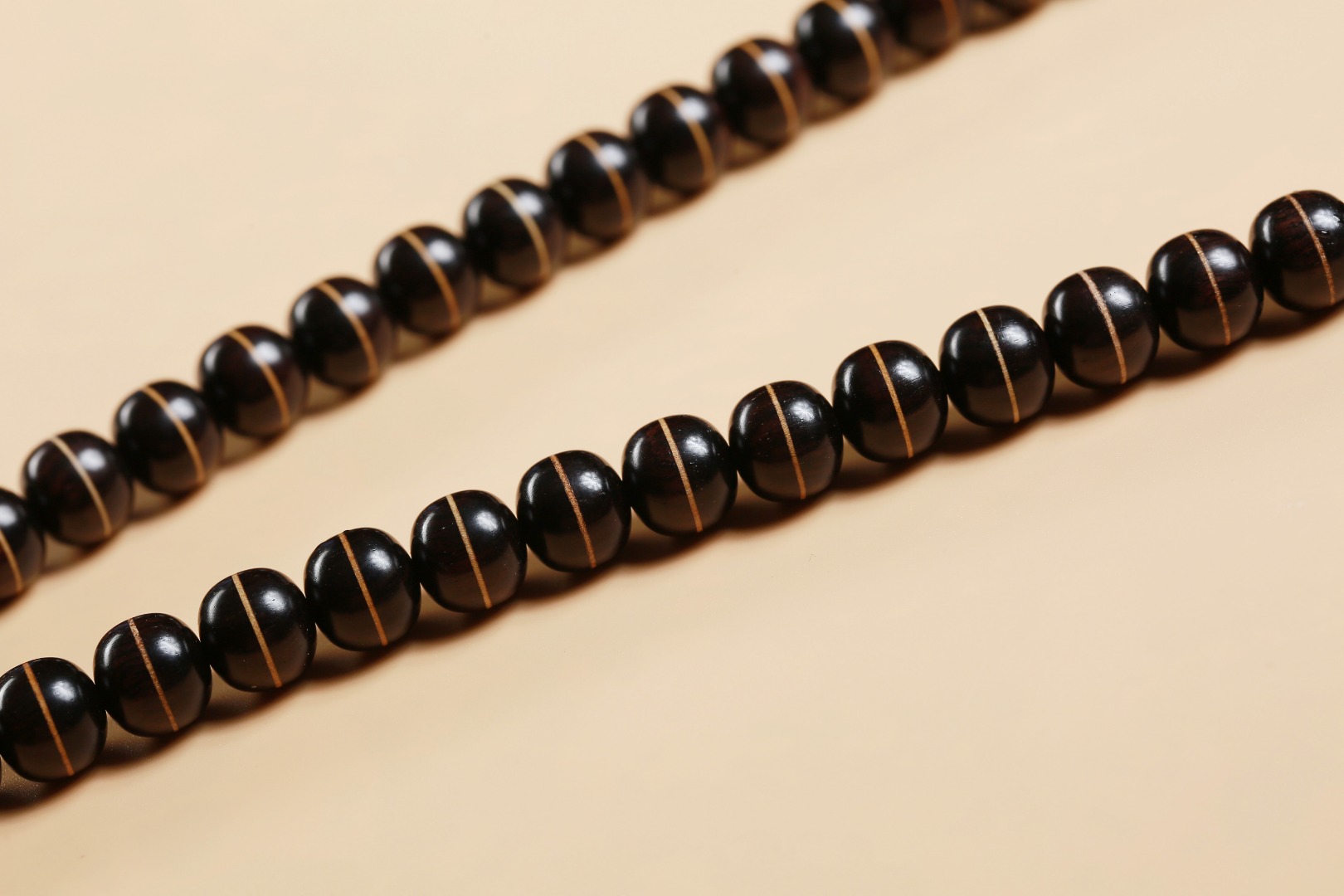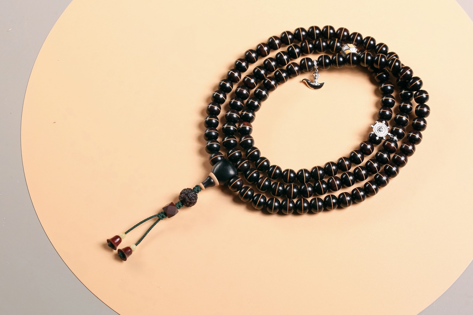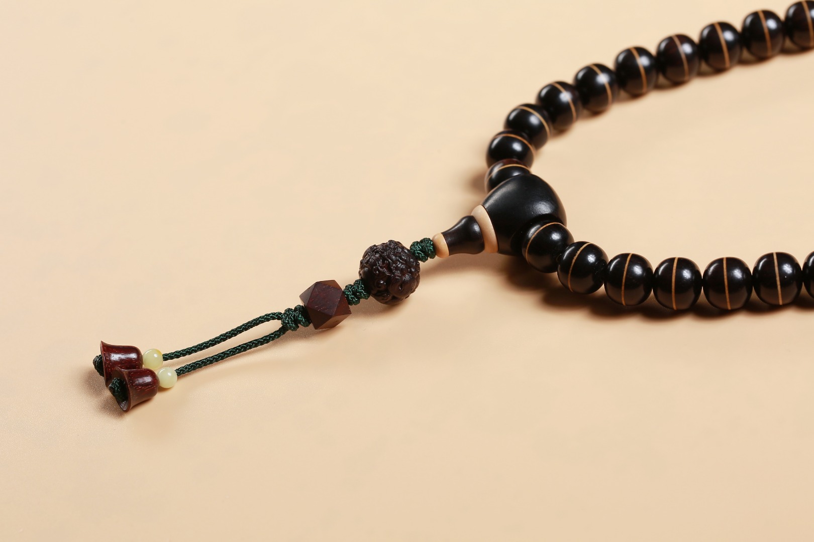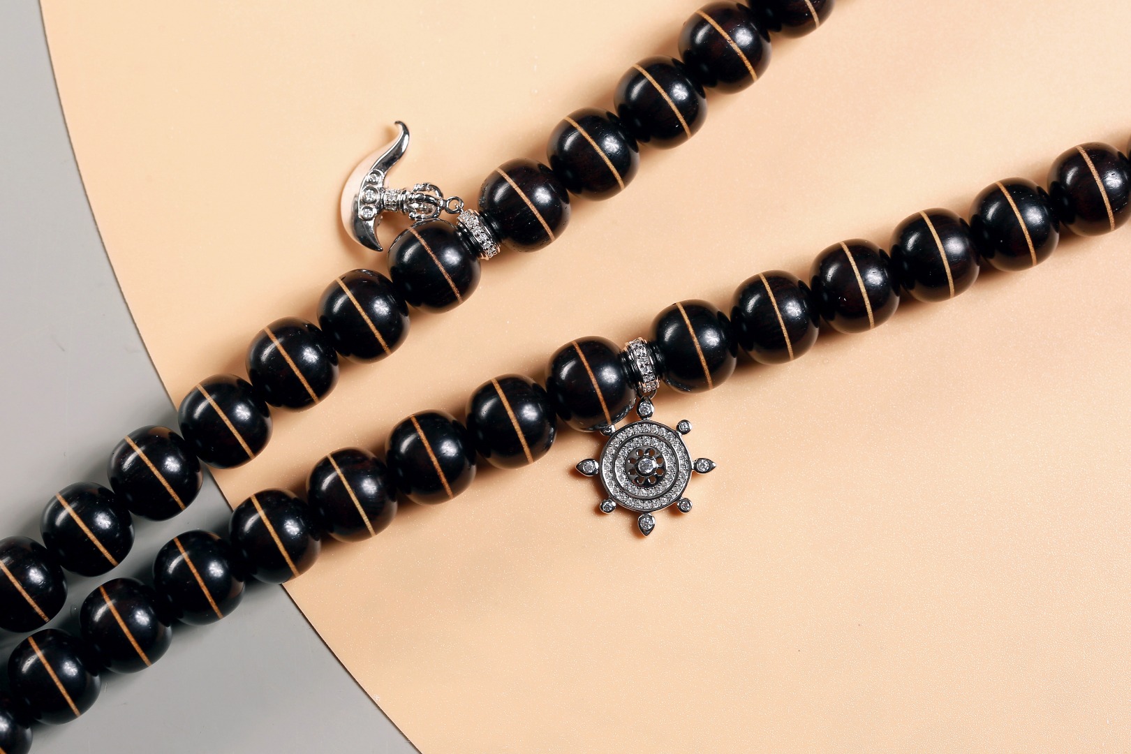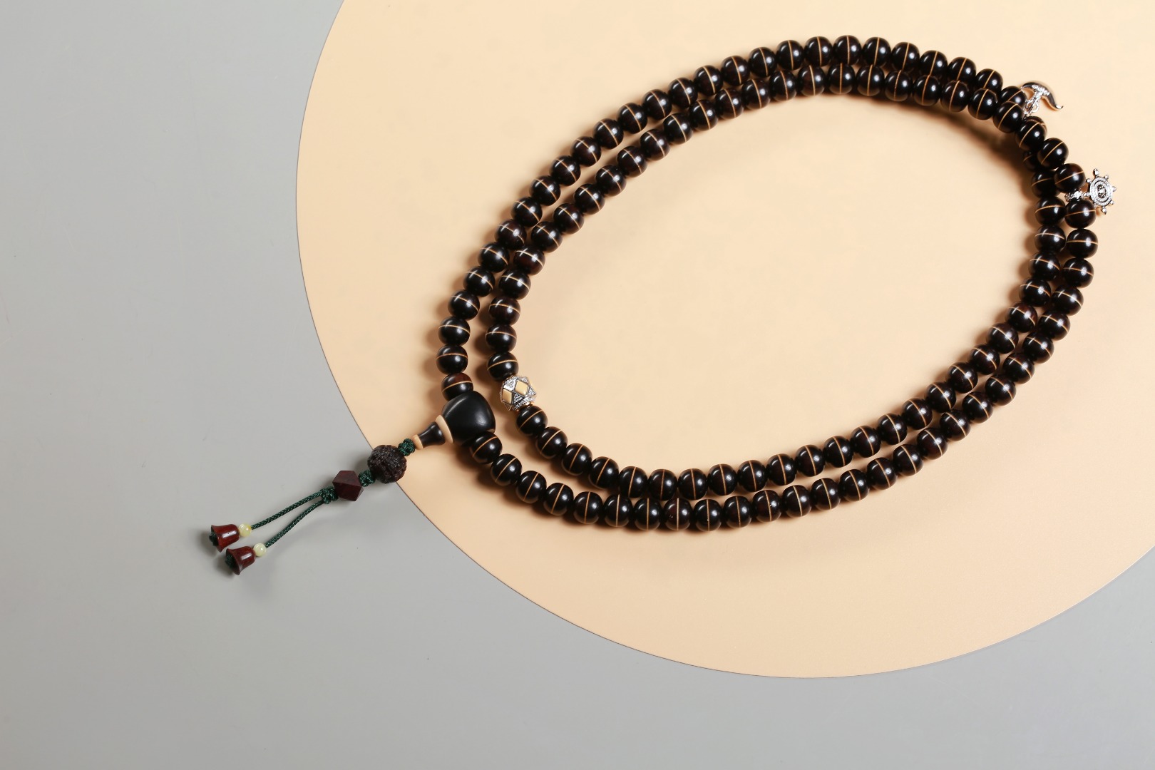 主珠以藏传一线药师珠为设计灵感,结合紫光檀经典老型而制,中间嵌入极薄工艺打造的黄杨木“一线”,线条笔直分明,光气十足,内部为传统直榫,铜管镶嵌,饱满厚重,再现古朴株系的独特味道。药师珠为天珠旁系,象征诸佛众神护佑,吉祥如意,所求愿满。