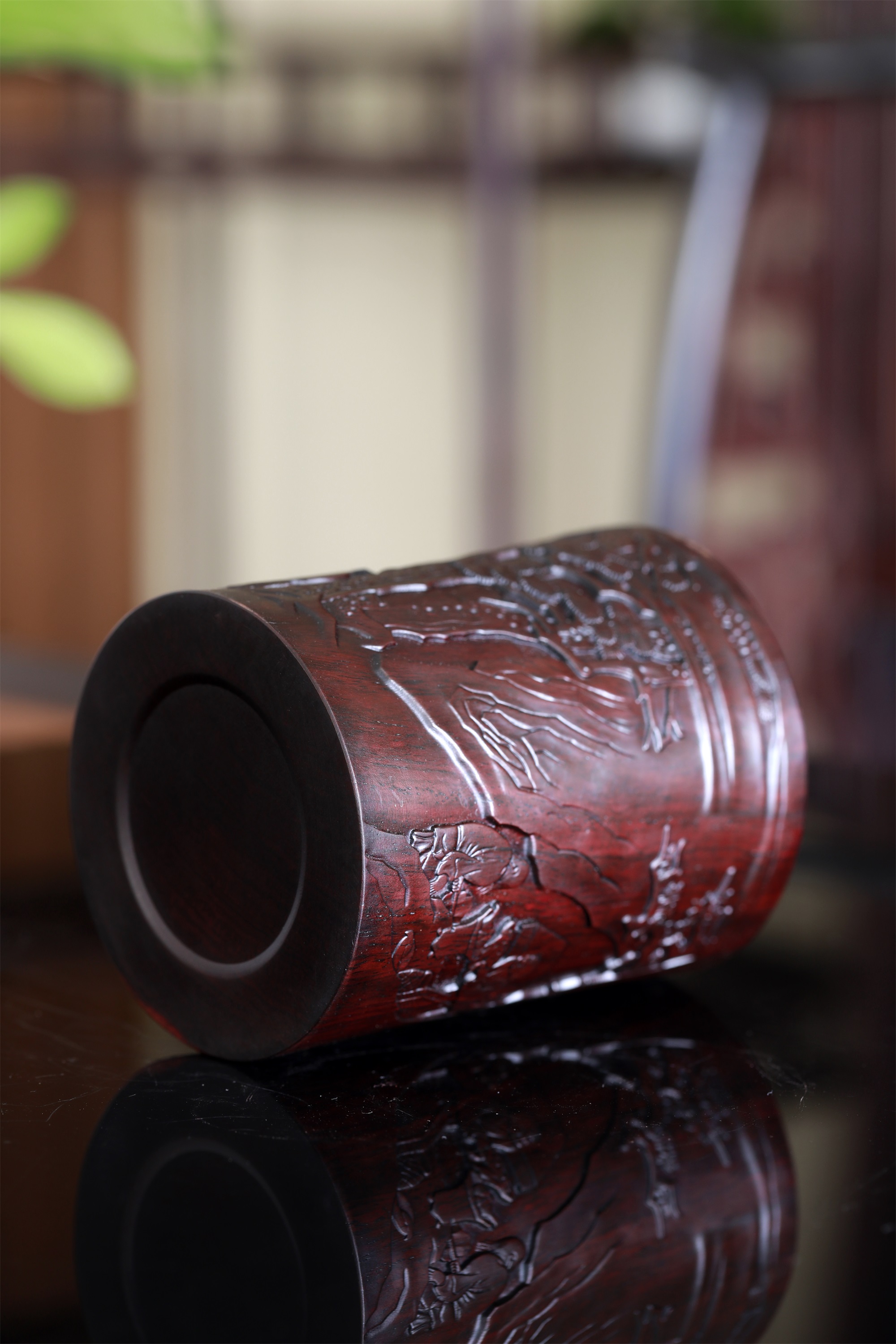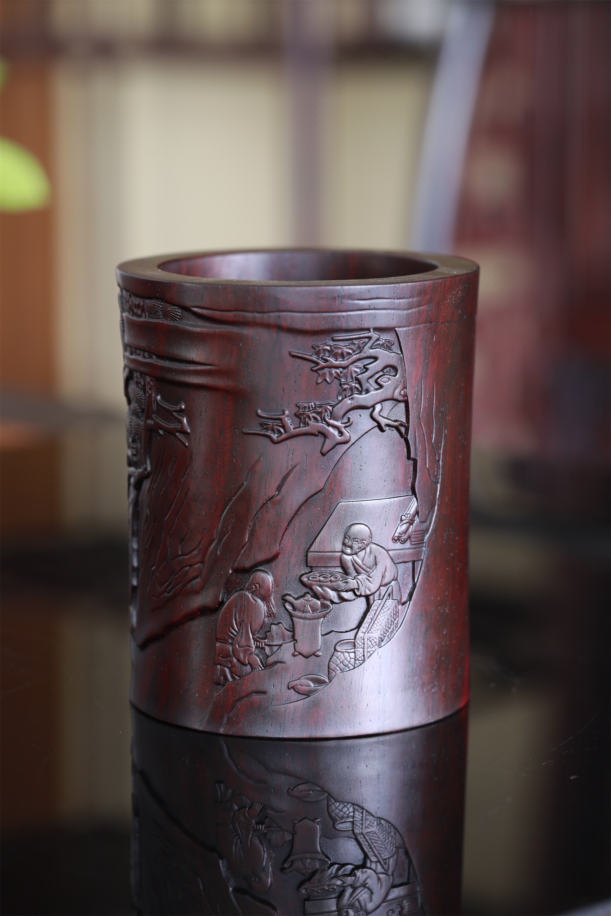 作品筒壁以薄地阳文法刻秋松观弈图,岩壁上古松自夹缝而出,松枝伸展,蟠曲弯转如龙。苍茂的松树下有三位高仕,其中两位对弈,另一位弯眉笑目,静心观弈,意甚陶醉。身后两书童忙于烹茶,人物神态生动传神。
