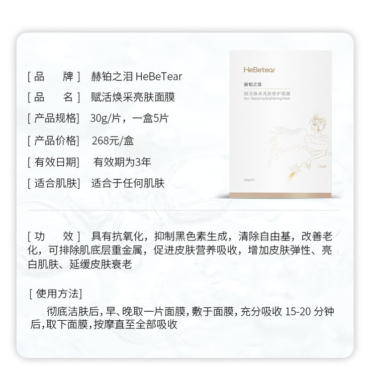 预售 | 赫铂之泪/HeBetear 升级版赋活焕采亮肤修护面膜提亮肤色补水舒缓5片/盒[D类]