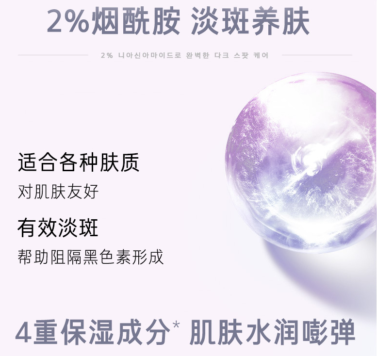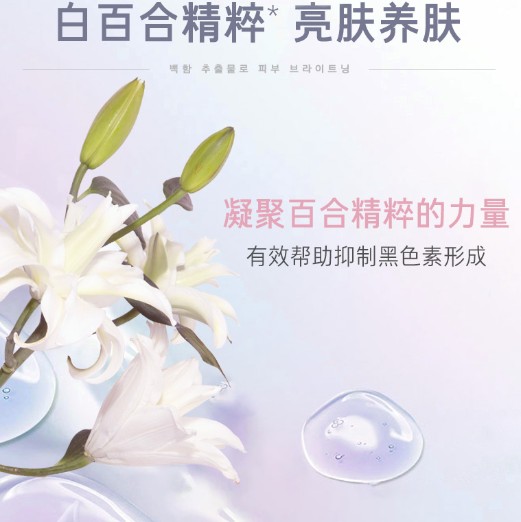 它是含有2%的烟酰胺,以及主打鲜花成分-百合,急速冷冻盛放期的百合,并从中萃取美白成分,快速吸收,抑制黑色素的生成,改善皮肤的暗沉,提亮肤色,