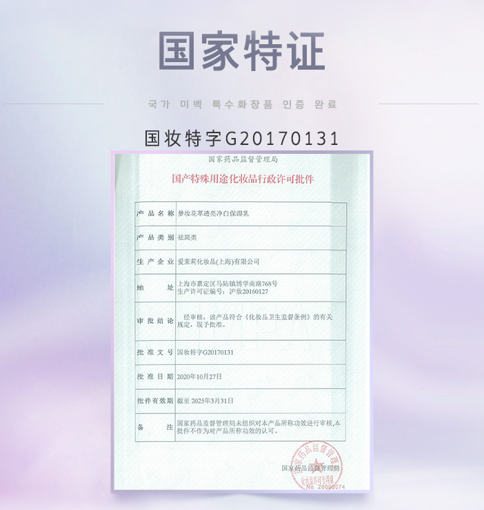 它是具有国妆特字的水乳,国妆特字G20170131,在下面的官方介绍里是有图片的,大家可以参考