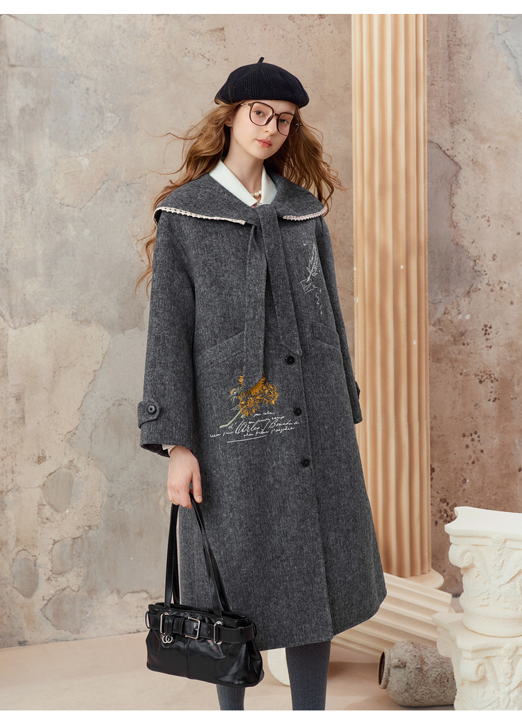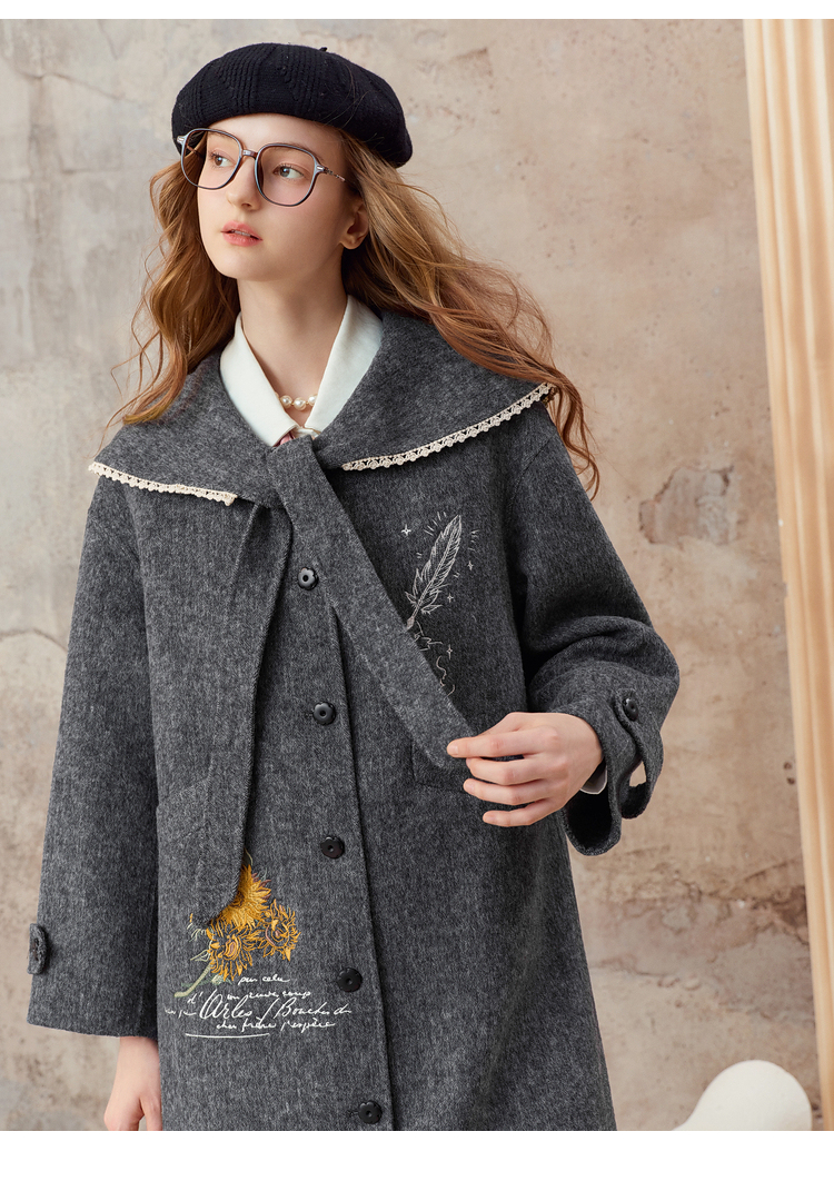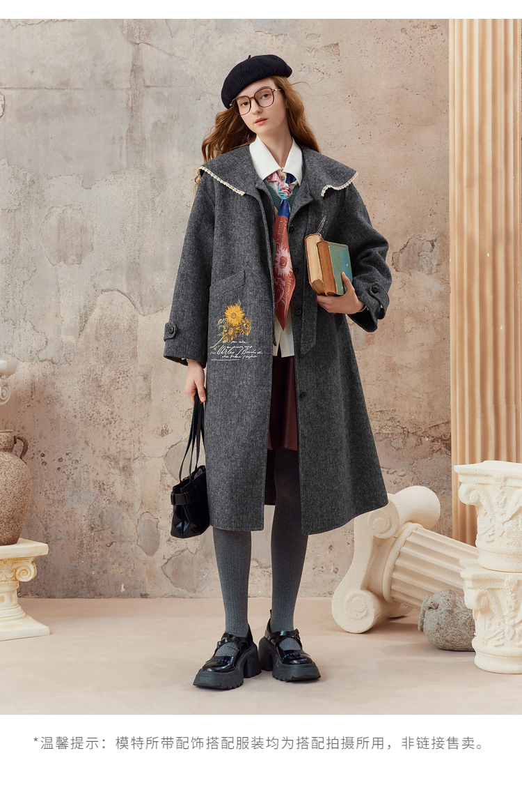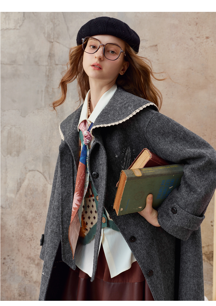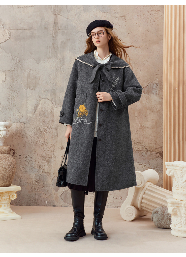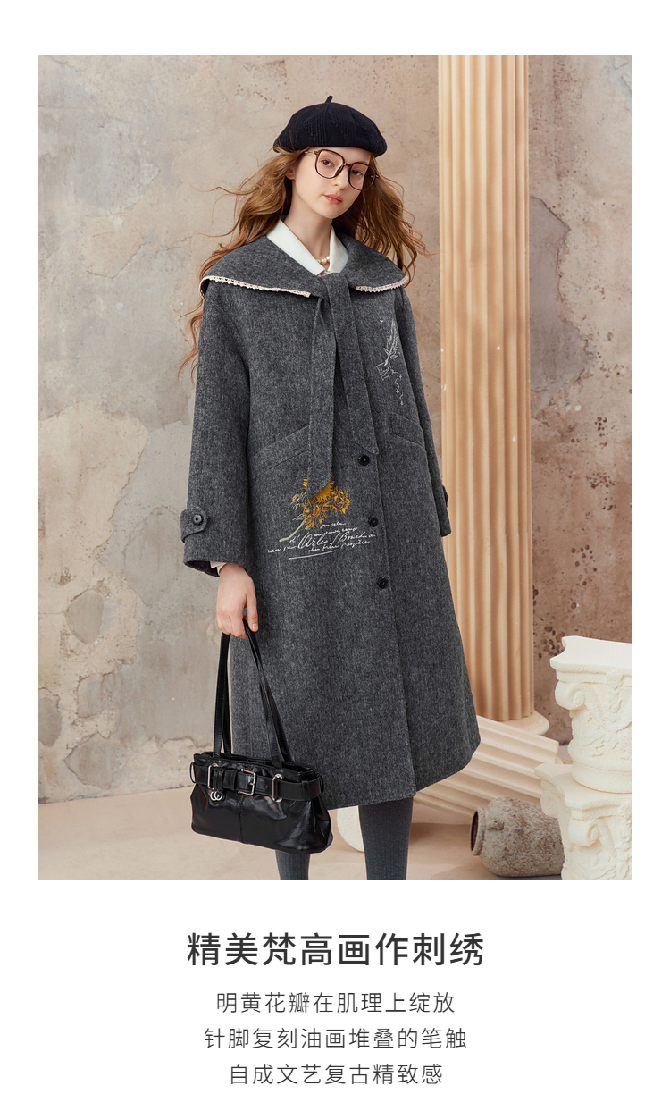 两三事梵高文艺 雾都纪事 2025秋冬新款复绑结海军领绣花毛呢外套