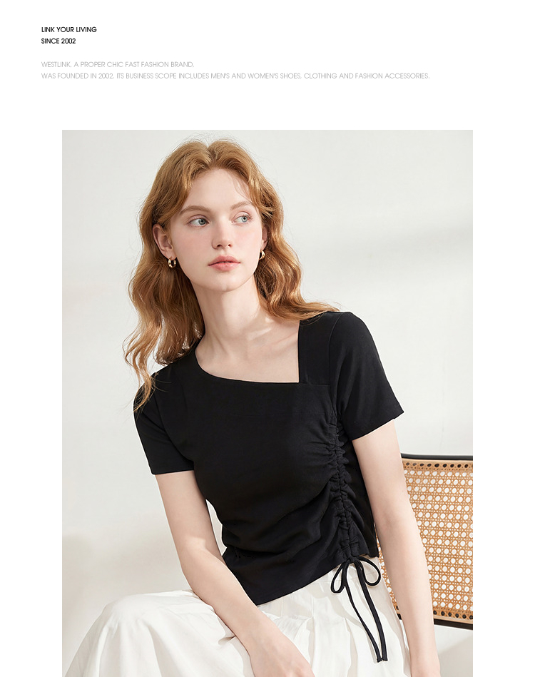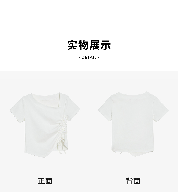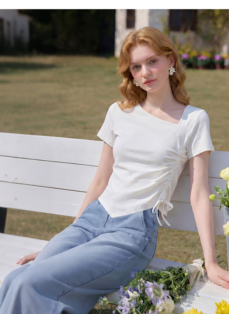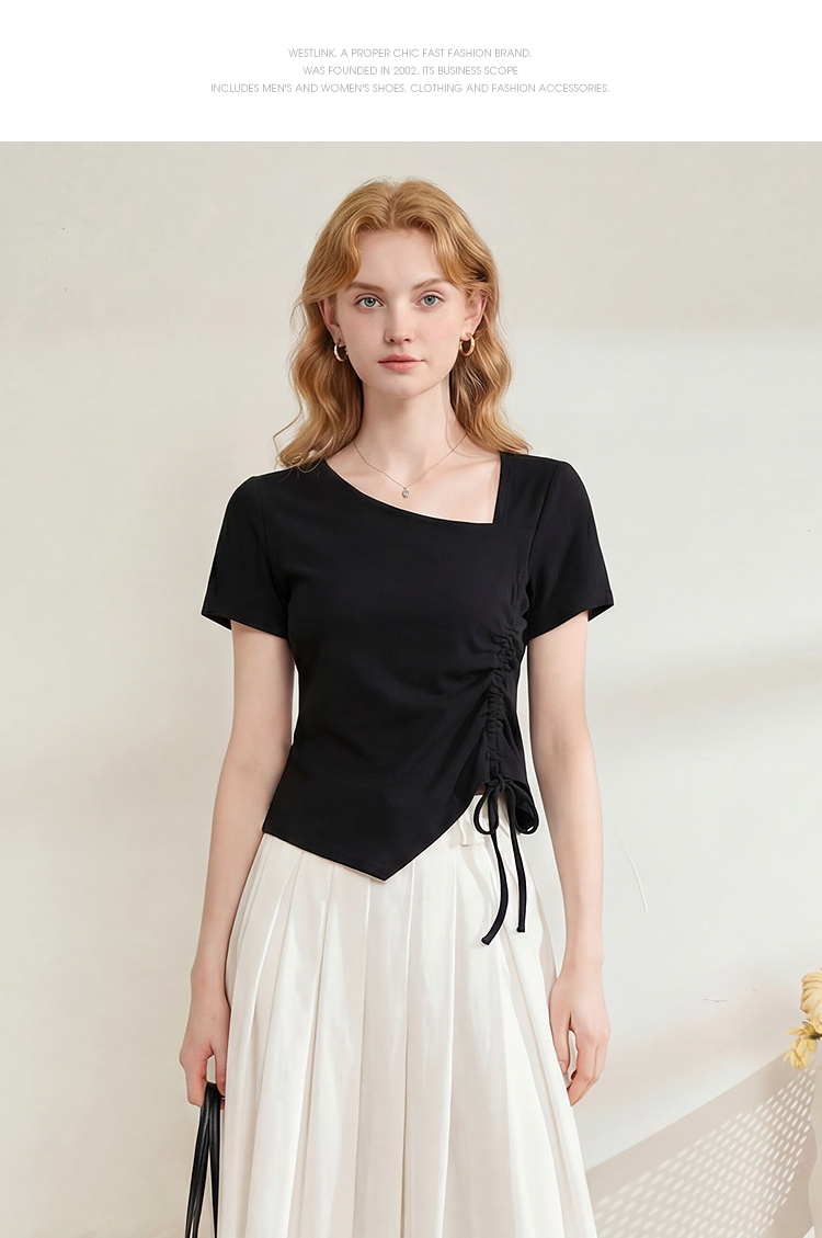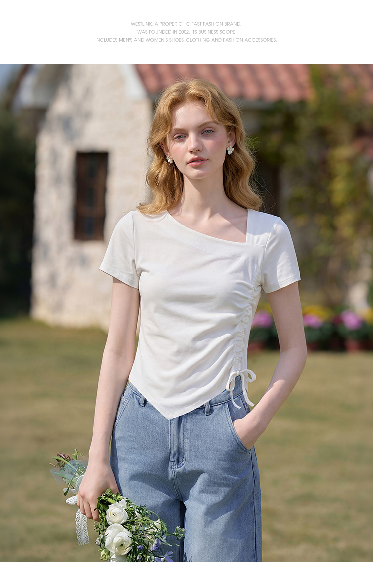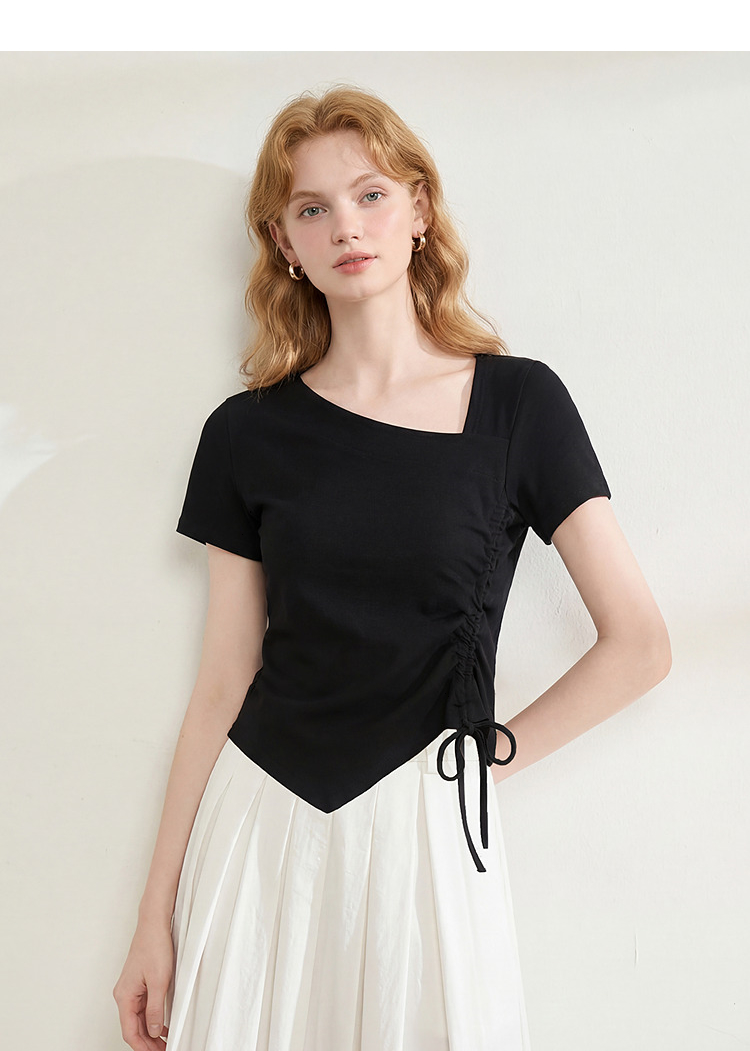 西遇2026夏新款斜领抽绳T恤女修身显瘦不规则设计感纯色短袖上衣E0060271