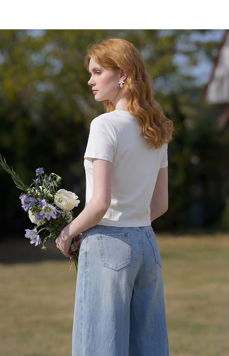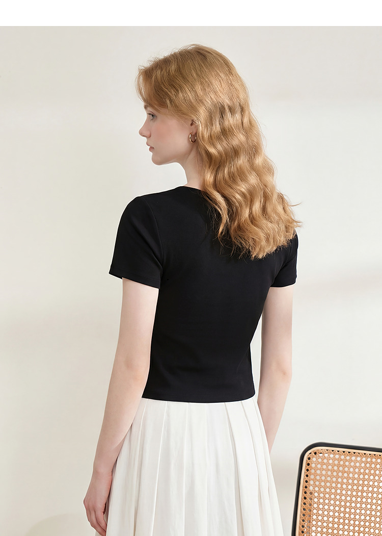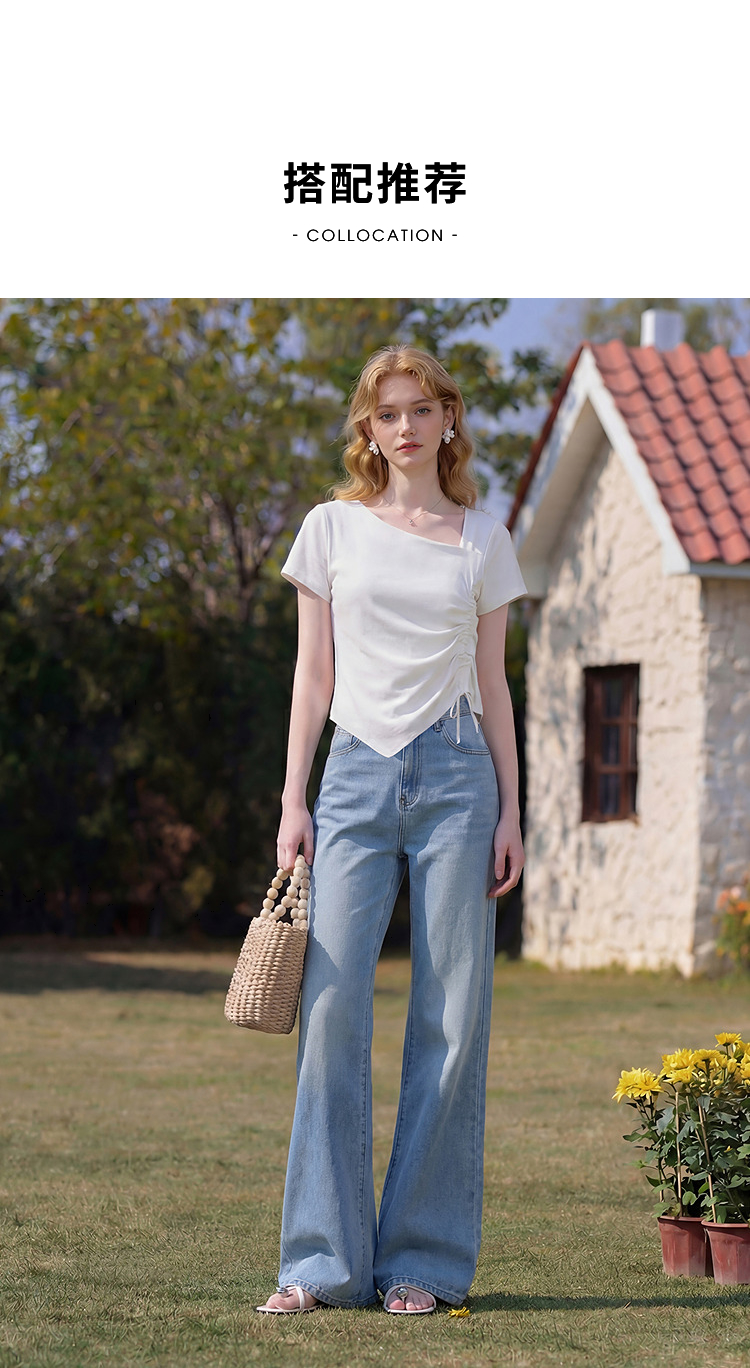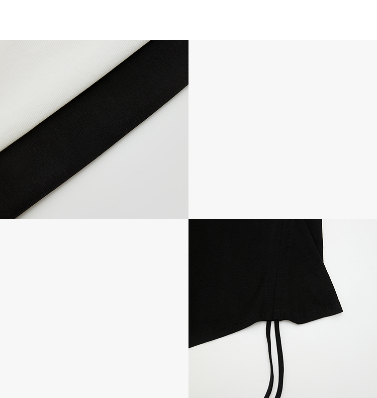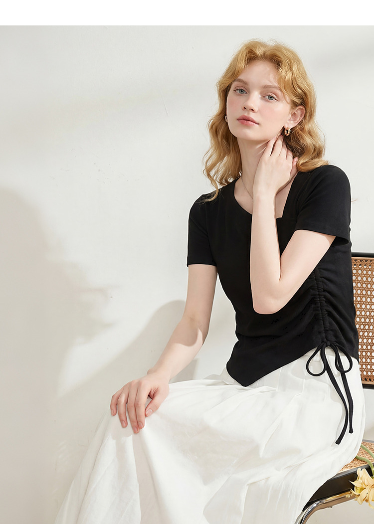 西遇2026夏新款斜领抽绳T恤女修身显瘦不规则设计感纯色短袖上衣E0060271